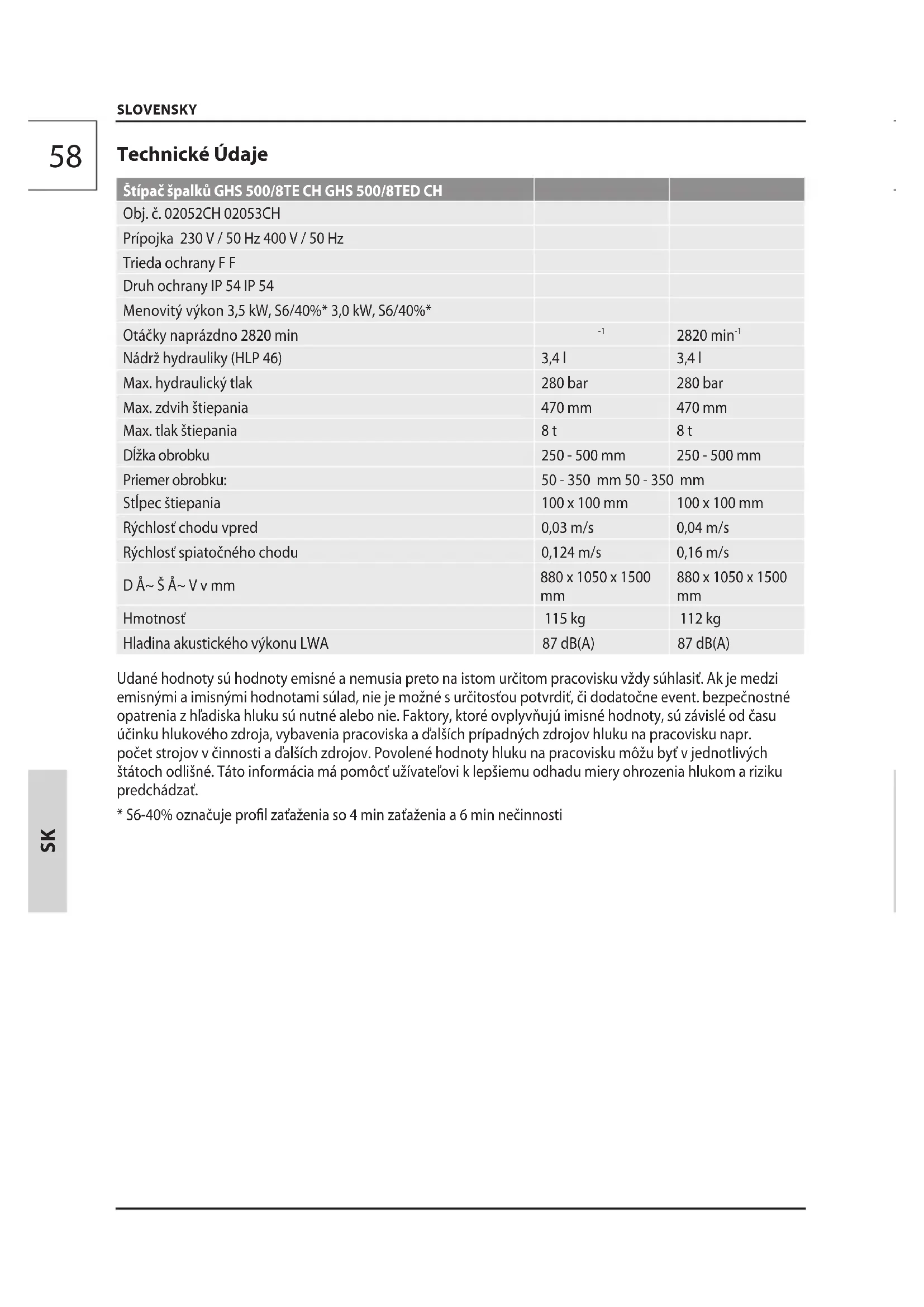 Hmotnosť 115 kg 112 kg Hladina akustického výkonu LWA 87 dB(A) 87 dB(A) Udané hodnoty sú hodnoty emisné a nemusia preto na istom určitom pracovisku vždy súhlasiť. Ak je medzi emisnými a imisnými hodnotami súlad, nie je možné s určitosťou potvrdiť, či dodatočne event. bezpečnostné opatrenia z hľadiska hluku sú nutné alebo nie. Faktory, ktoré ovplyvňujú imisné hodnoty, sú závislé od času účinku hlukového zdroja, vybavenia pracoviska a ďalších prípadných zdrojov hluku na pracovisku napr. počet strojov v činnosti a ďalších zdrojov. Povolené hodnoty hluku na pracovisku môžu byť v jednotlivých štátoch odlišné. Táto informácia má pomôcť užívateľovi k lepšiemu odhadu miery ohrozenia hlukom a riziku predchádzať.