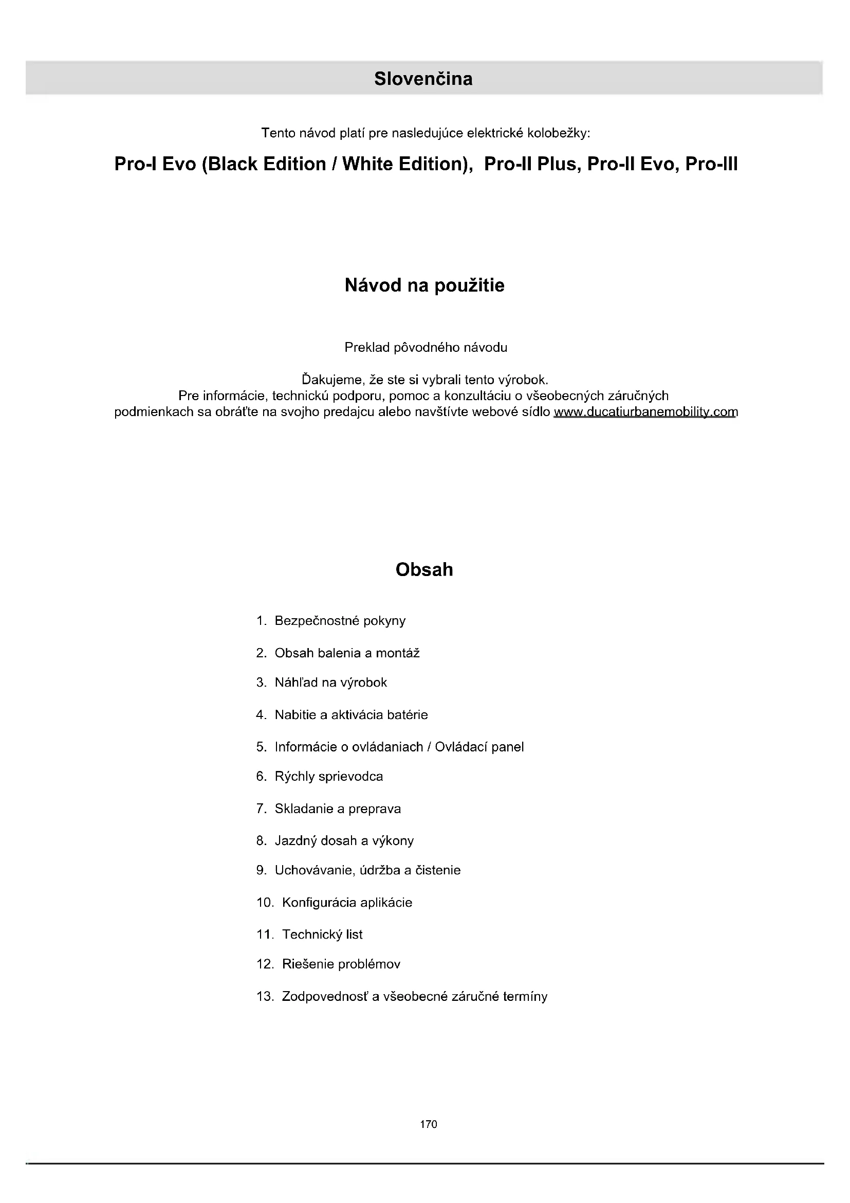 - v predajných miestach nových elektrických a elektronických zariadení. Tu sa môžu zdarma odovzdať RAEE veľmi malých rozmerov (s najdlhšou stranou kratšou ako 25 cm), kým tie s väčšími rozmermi sa môžu poskytnúť spôsobom 1 za 1, alebo odovzdaním starého výrobku v momente nákupu nového s rovnakými funkciami. Okrem toho, spôsob 1 za 1 je vždy garantovaný počas aktu nákupu nového elektrického alebo elektronického zariadenia zo strany spotrebiteľa, nezávisle od veľkosti RAEE. V prípade nezákonnej likvidácie elektrických alebo elektronických zariadení by sa mohli aplikovať sankcie stanovené platnou normou v oblasti ochrany životného prostredia (talianska norma, je potrebné overiť normy platné v krajine použitia/likvidácie dopravného prostriedku). Ak OEEZ obsahuje batérie alebo akumulátory, je treba ich odstrániť a zneškodniť prostredníctvom špecického zberu triedeného odpadu. UPOZORNENIE Spracovanie vybitých batérií (aplikovateľné vo všetkých krajinách Európskej únie a v iných európskych systémoch so systémom zberu triedeného odpadu) Tento symbol na výrobku alebo na obale označuje, že batéria sa nesmie považovať za bežný odpad z domácnosti. Na niektorých typoch batérií by sa tento symbol mohol použiť v kombinácii s chemickou značkou. Chemické značky ortuti (Hg) alebo olova (Pb) sa pridávajú, ak batéria obsahuje viac ako 0,0005 % ortuti alebo viac ako 0,004% olova. Zabezpečiac, že články-batérie sa zlikvidovali správne, prispievate k zabráneniu možných negatívnych dôsledkov pre prostredie a zdravie, ktoré by inak mohli byť spôsobené jeho neadekvátnou likvidáciou. Recyklácia materiálov napomáha udržiavať prírodné zdroje. V prípade výrobkov, ktoré, z dôvodov bezpečnosti, poskytnutia alebo ochrany údajov, si vyžadujú pevné pripojenie k vnútornému článku/batérii, tento článok alebo batériu smie vymeniť iba pomocný kvalikovaný personál. Na konci životnosti odovzdajte výrobok do zberného centra určeného na zneškodnenie elektrických a elektronických zariadení: to zaistí aj správne zneškodnenie vnútornej batérie. Pre podrobnejšie informácie o likvidácii vybitého článku-batérie alebo výrobku sa môžete skontaktovať s obecným úradom, miestnou službou likvidácie odpadu alebo predajným miestom, kde ste si výrobok kúpili. V každom prípade je potrebné vykonať likvidáciu podľa normy platnej v krajine nákupu.194 Kullanım kılavuzu Orijinal talimatların çevirisi Bu ürünü tercih ettiğiniz için teşekkür ederiz. Bilgi, teknik destek, servis almak ve garanti şartlarını öğrenmek için satıcınıza başvurun veya www.ducatiurbanemobility.com sitesini ziyaret edin Türkçe Bu kılavuz aşağıdaki elektrikli scooter modelleri için geçerlidir: Pro-I Evo (Black Edition / White Edition), Pro-II Plus, Pro-II Evo, Pro-III