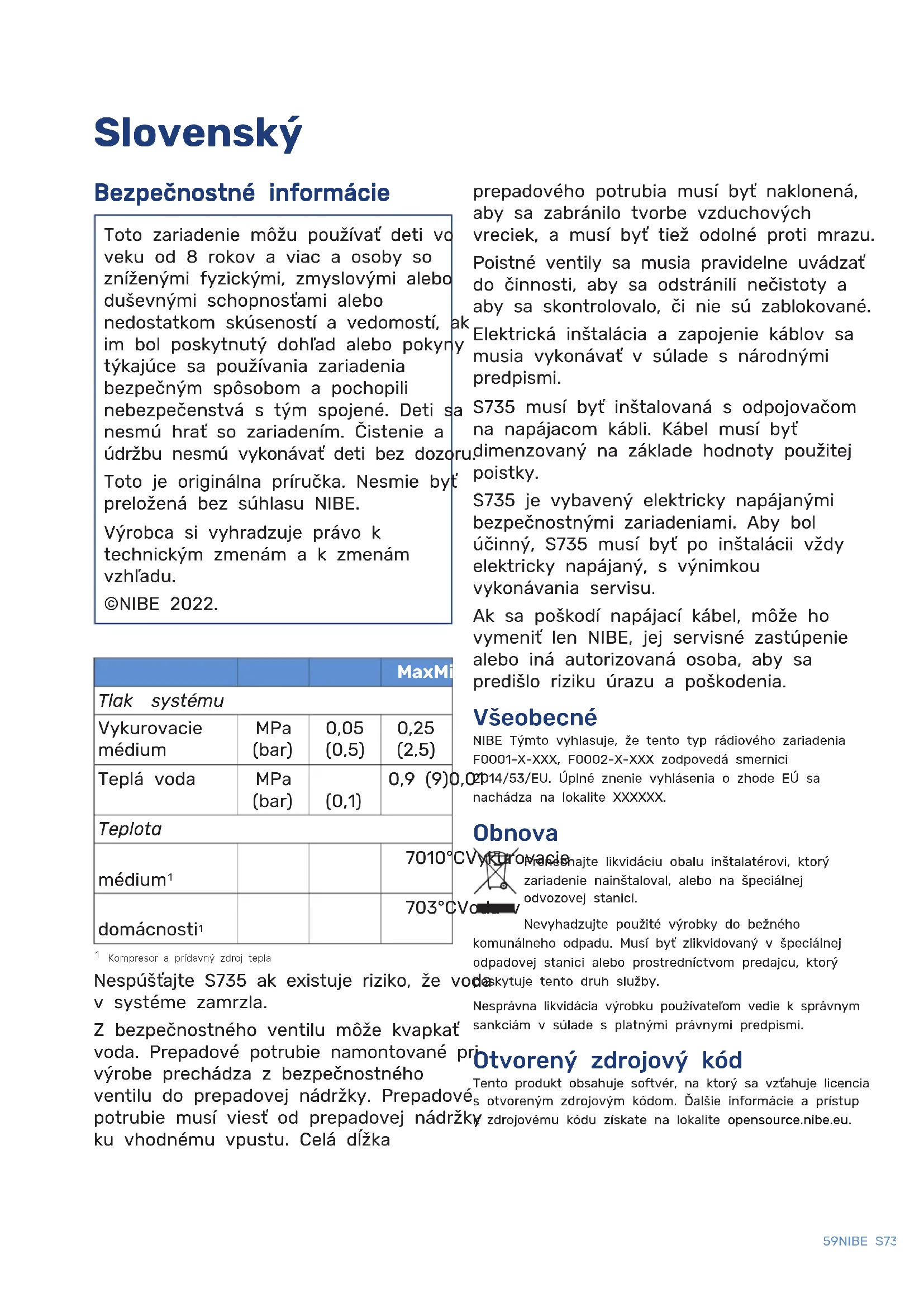 Service mag uitsluitend worden verricht conform de aanbevelingen van de fabri- kant van het systeem. Onderhoud en reparaties waarvoor een tweede, ter zake kundig persoon nodig is, moeten worden verricht onder toezicht van een persoon die met brandbare koudemid- delen mag werken. 57NIBE S735 | NLOnderhoud en reparaties waarvoor de erva- ring van een tweede persoon nodig is, moeten worden verricht onder toezicht van een persoon met de hierboven genoemde expertise. NIBE S735 | NL58Bezpečnostné informácie Toto zariadenie môžu používať deti vo veku od 8 rokov a viac a osoby so zníženými fyzickými, zmyslovými alebo duševnými schopnosťami alebo nedostatkom skúseností a vedomostí, ak im bol poskytnutý dohľad alebo pokyny týkajúce sa používania zariadenia bezpečným spôsobom a pochopili nebezpečenstvá s tým spojené. Deti sa nesmú hrať so zariadením. Čistenie a údržbu nesmú vykonávať deti bez dozoru. Toto je originálna príručka. Nesmie byť preložená bez súhlasu NIBE. Výrobca si vyhradzuje právo k technickým zmenám a k zmenám vzhľadu. ©NIBE 2022. MaxMin Tlak systému 0,25 (2,5) 0,05 (0,5) MPa (bar) Vykurovacie médium 0,9 (9)0,01 (0,1) MPa (bar) Teplá voda Teplota 7010°CVykurovacie médium