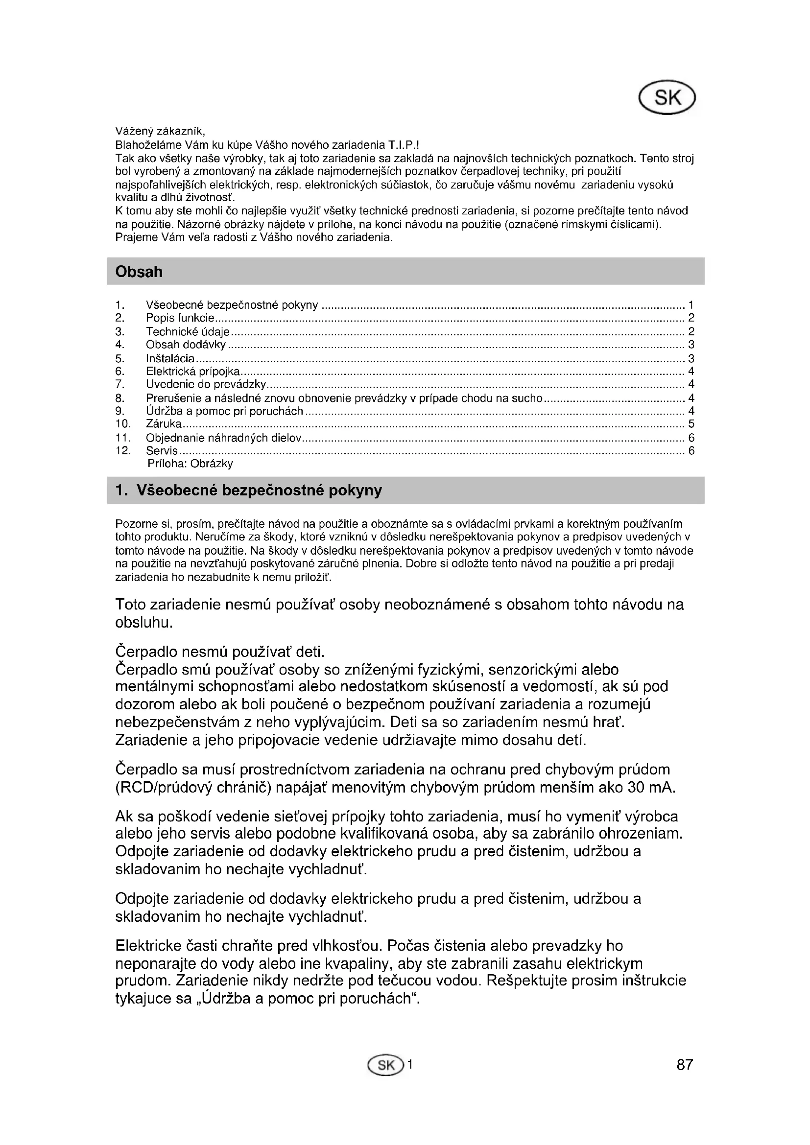 Pozorne si, prosím, prečítajte návod na použitie a oboznámte sa s ovládacími prvkami a korektným používaním tohto produktu. Neručíme za škody, ktoré vzniknú v dôsledku nerešpektovania pokynov a predpisov uvedených v tomto návode na použitie. Na škody v dôsledku nerešpektovania pokynov a predpisov uvedených v tomto návode na použitie na nevzťahujú poskytované záručné plnenia. Dobre si odložte tento návod na použitie a pri predaji zariadenia ho nezabudnite k nemu priložiť. Toto zariadenie nesmú používať osoby neoboznámené s obsahom tohto návodu na obsluhu. Čerpadlo nesmú používať deti. Čerpadlo smú používať osoby so zníženými fyzickými, senzorickými alebo mentálnymi schopnosťami alebo nedostatkom skúseností a vedomostí, ak sú pod dozorom alebo ak boli poučené o bezpečnom používaní zariadenia a rozumejú nebezpečenstvám z neho vyplývajúcim. Deti sa so zariadením nesmú hrať. Zariadenie a jeho pripojovacie vedenie udržiavajte mimo dosahu detí. Čerpadlo sa musí prostredníctvom zariadenia na ochranu pred chybovým prúdom (RCD/prúdový chránič) napájať menovitým chybovým prúdom menším ako 30 mA. Ak sa poškodí vedenie sieťovej prípojky tohto zariadenia, musí ho vymeniť výrobca alebo jeho servis alebo podobne kvalifikovaná osoba, aby sa zabránilo ohrozeniam. Odpojte zariadenie od dodavky elektrickeho prudu a pred čistenim, udržbou a skladovanim ho nechajte vychladnuť. Odpojte zariadenie od dodavky elektrickeho prudu a pred čistenim, udržbou a skladovanim ho nechajte vychladnuť. Elektricke časti chraňte pred vlhkosťou. Počas čistenia alebo prevadzky ho neponarajte do vody alebo ine kvapaliny, aby ste zabranili zasahu elektrickym prudom. Zariadenie nikdy nedržte pod tečucou vodou. Rešpektujte prosim inštrukcie tykajuce sa „Údržba a pomoc pri poruchách“.