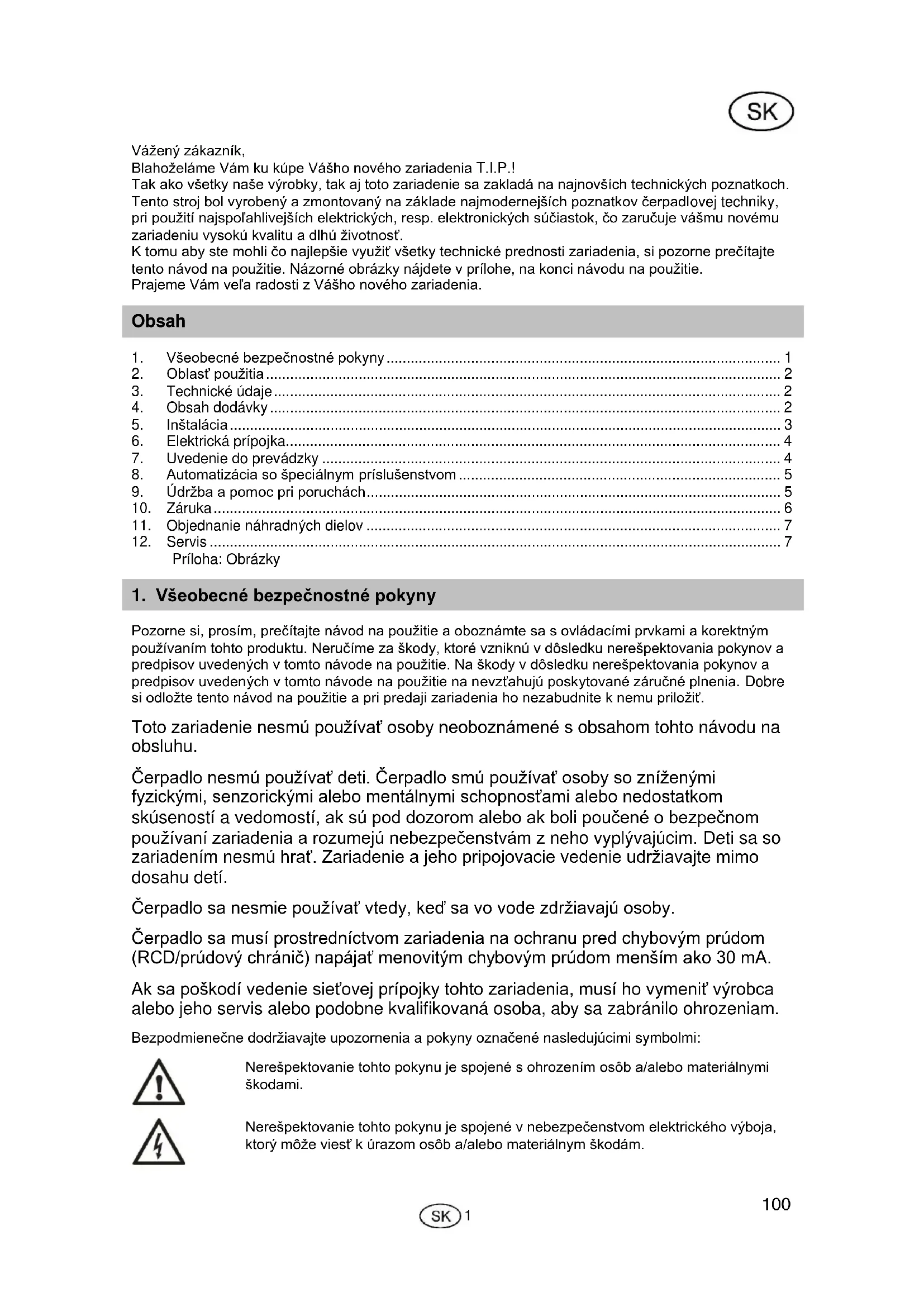Pozorne si, prosím, prečítajte návod na použitie a oboznámte sa s ovládacími prvkami a korektným používaním tohto produktu. Neručíme za škody, ktoré vzniknú v dôsledku nerešpektovania pokynov a predpisov uvedených v tomto návode na použitie. Na škody v dôsledku nerešpektovania pokynov a predpisov uvedených v tomto návode na použitie na nevzťahujú poskytované záručné plnenia. Dobre si odložte tento návod na použitie a pri predaji zariadenia ho nezabudnite k nemu priložiť. Toto zariadenie nesmú používať osoby neoboznámené s obsahom tohto návodu na obsluhu. Čerpadlo nesmú používať deti. Čerpadlo smú používať osoby so zníženými fyzickými, senzorickými alebo mentálnymi schopnosťami alebo nedostatkom skúseností a vedomostí, ak sú pod dozorom alebo ak boli poučené o bezpečnom používaní zariadenia a rozumejú nebezpečenstvám z neho vyplývajúcim. Deti sa so zariadením nesmú hrať. Zariadenie a jeho pripojovacie vedenie udržiavajte mimo dosahu detí. Čerpadlo sa nesmie používať vtedy, keď sa vo vode zdržiavajú osoby. Čerpadlo sa musí prostredníctvom zariadenia na ochranu pred chybovým prúdom (RCD/prúdový chránič) napájať menovitým chybovým prúdom menším ako 30 mA. Ak sa poškodí vedenie sieťovej prípojky tohto zariadenia, musí ho vymeniť výrobca alebo jeho servis alebo podobne kvalifikovaná osoba, aby sa zabránilo ohrozeniam. Bezpodmienečne dodržiavajte upozornenia a pokyny označené nasledujúcimi symbolmi: