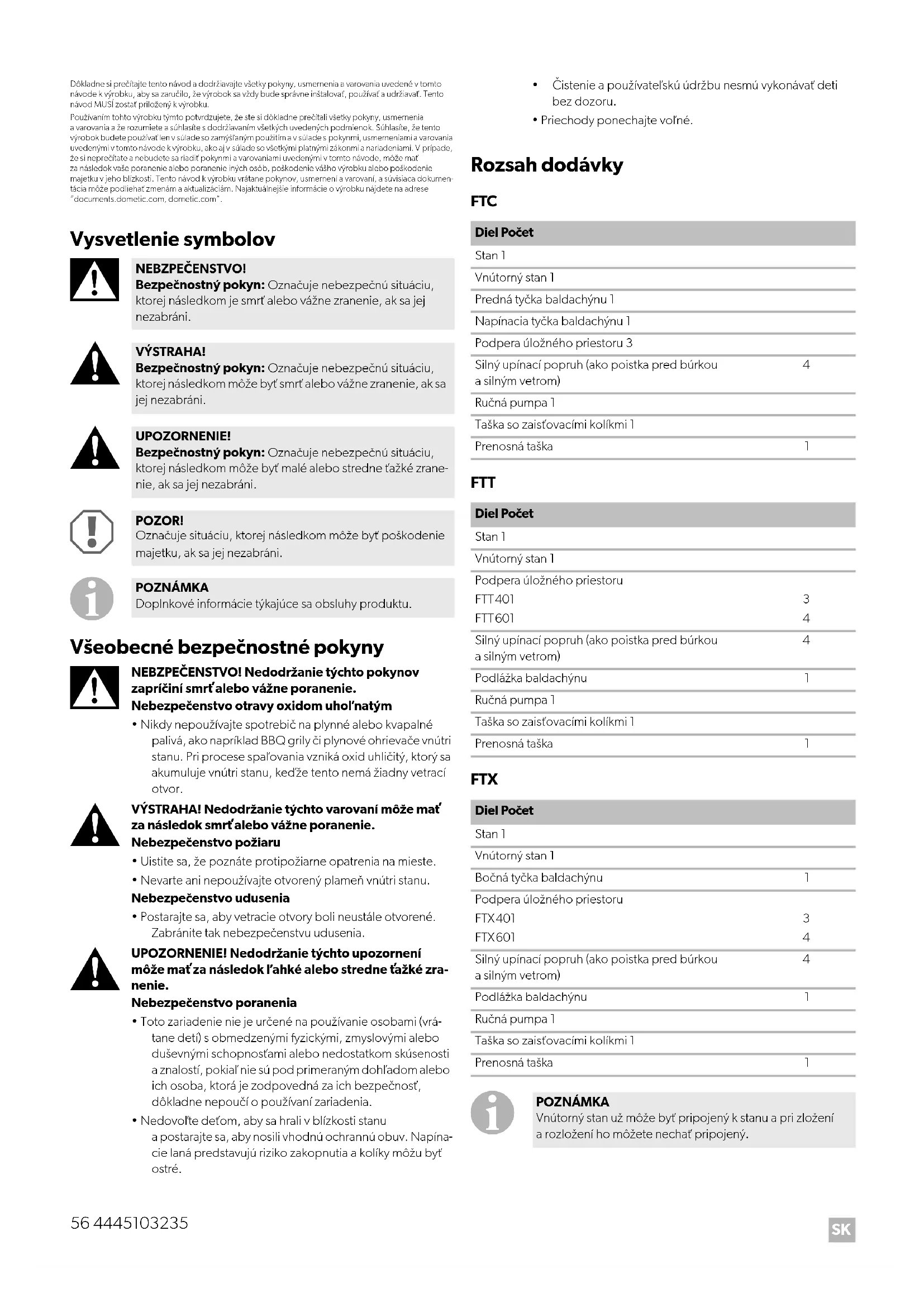 NEBZPEČENSTVO! Bezpečnostný pokyn: Označuje nebezpečnú situáciu, ktorej následkom je smrť alebo vážne zranenie, ak sa jej nezabráni. VÝSTRAHA! Bezpečnostný pokyn: Označuje nebezpečnú situáciu, ktorej následkom môže byť smrť alebo vážne zranenie, ak sa jej nezabráni. UPOZORNENIE! Bezpečnostný pokyn: Označuje nebezpečnú situáciu, ktorej následkom môže byť malé alebo stredne ťažké zrane- nie, ak sa jej nezabráni. POZOR! Označuje situáciu, ktorej následkom môže byť poškodenie majetku, ak sa jej nezabráni. POZNÁMKA Doplnkové informácie týkajúce sa obsluhy produktu. Diel Počet Stan 1 Vnútorný stan 1 Predná tyčka baldachýnu 1 Napínacia tyčka baldachýnu 1 Podpera úložného priestoru 3 Silný upínací popruh (ako poistka pred búrkou a silným vetrom)