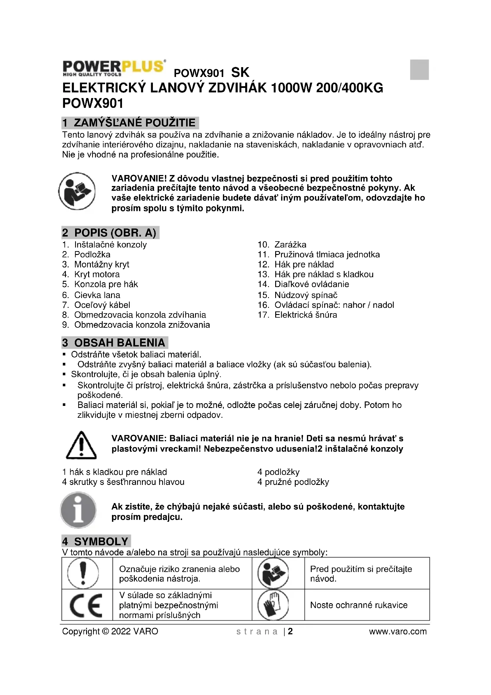 - Lanový zdvihák nie je vhodný pre nepretržitú prevádzku. Motor je chránený pred preťažením a prehriatím teplotným spínačom.POWX901 SK Copyright © 2022 VARO s t r a n a | 8 www.varo.com