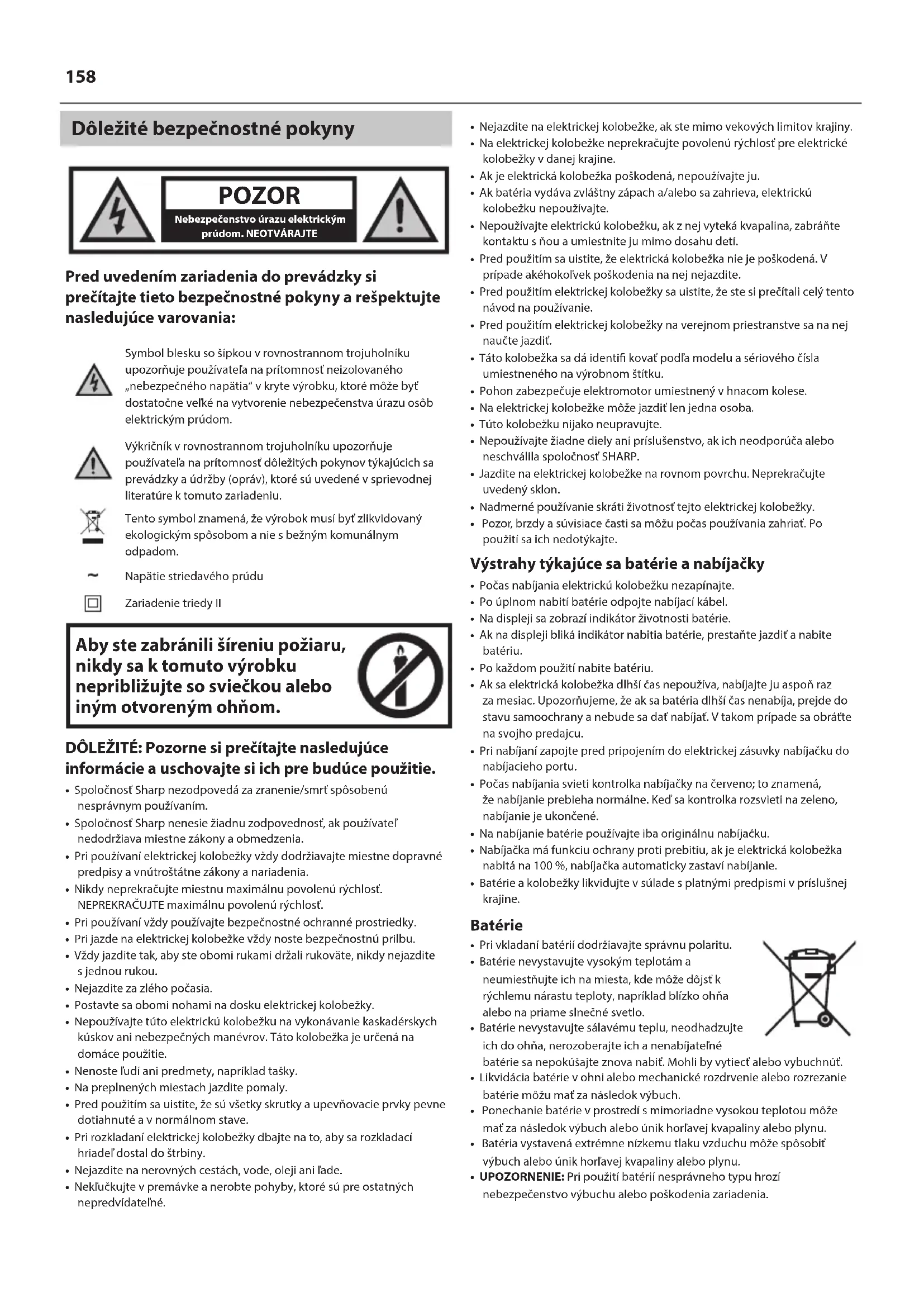 - Spoločnosť Sharp nezodpovedá za zranenie/smrť spôsobenú nesprávnym používaním.• Spoločnosť Sharp nenesie žiadnu zodpovednosť, ak používateľ nedodržiava miestne zákony a obmedzenia.• Pri používaní elektrickej kolobežky vždy dodržiavajte miestne dopravné predpisy a vnútroštátne zákony a nariadenia.• Nikdy neprekračujte miestnu maximálnu povolenú rýchlosť. NEPREKRAČUJTE maximálnu povolenú rýchlosť.• Pri používaní vždy používajte bezpečnostné ochranné prostriedky.• Pri jazde na elektrickej kolobežke vždy noste bezpečnostnú prilbu.• Vždy jazdite tak, aby ste obomi rukami držali rukoväte, nikdy nejazdite s jednou rukou.• Nejazdite za zlého počasia.• Postavte sa obomi nohami na dosku elektrickej kolobežky.• Nepoužívajte túto elektrickú kolobežku na vykonávanie kaskadérskych kúskov ani nebezpečných manévrov. Táto kolobežka je určená na domáce použitie.• Nenoste ľudí ani predmety, napríklad tašky.• Na preplnených miestach jazdite pomaly.• Pred použitím sa uistite, že sú všetky skrutky a upevňovacie prvky pevne dotiahnuté a v normálnom stave.• Pri rozkladaní elektrickej kolobežky dbajte na to, aby sa rozkladací hriadeľ dostal do štrbiny.• Nejazdite na nerovných cestách, vode, oleji ani ľade.• Nekľučkujte v premávke a nerobte pohyby, ktoré sú pre ostatných nepredvídateľné.• Nejazdite na elektrickej kolobežke, ak ste mimo vekových limitov krajiny.• Na elektrickej kolobežke neprekračujte povolenú rýchlosť pre elektrické kolobežky v danej krajine.• Ak je elektrická kolobežka poškodená, nepoužívajte ju.• Ak batéria vydáva zvláštny zápach a/alebo sa zahrieva, elektrickú kolobežku nepoužívajte.• Nepoužívajte elektrickú kolobežku, ak z nej vyteká kvapalina, zabráňte kontaktu s ňou a umiestnite ju mimo dosahu detí.• Pred použitím sa uistite, že elektrická kolobežka nie je poškodená. V prípade akéhokoľvek poškodenia na nej nejazdite.• Pred použitím elektrickej kolobežky sa uistite, že ste si prečítali celý tento návod na používanie.• Pred použitím elektrickej kolobežky na verejnom priestranstve sa na nej naučte jazdiť.• Táto kolobežka sa dá identi kovať podľa modelu a sériového čísla umiestneného na výrobnom štítku.• Pohon zabezpečuje elektromotor umiestnený v hnacom kolese.• Na elektrickej kolobežke môže jazdiť len jedna osoba.• Túto kolobežku nijako neupravujte.• Nepoužívajte žiadne diely ani príslušenstvo, ak ich neodporúča alebo neschválila spoločnosť SHARP.• Jazdite na elektrickej kolobežke na rovnom povrchu. Neprekračujte uvedený sklon.• Nadmerné používanie skráti životnosť tejto elektrickej kolobežky.