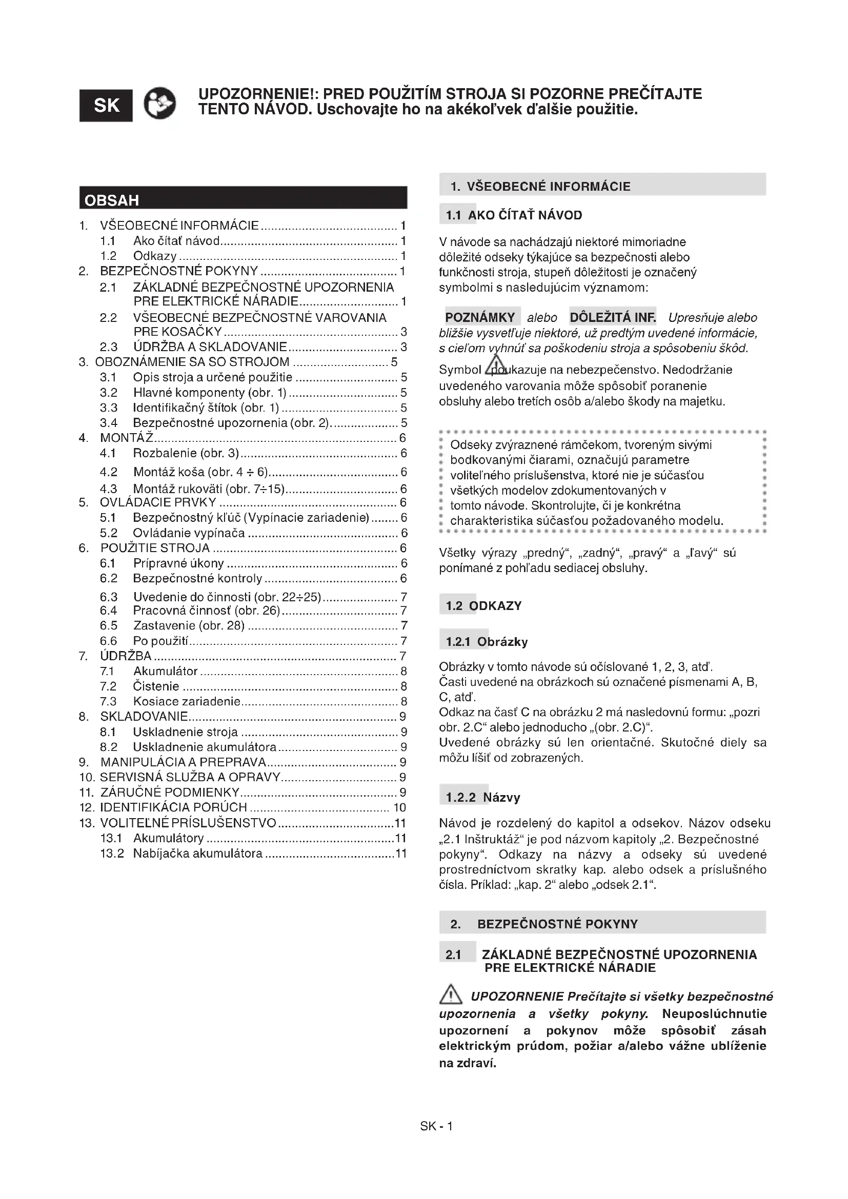 Návod je rozdelený do kapitol a odsekov. Názov odseku „2.1 Inštruktáž“ je pod názvom kapitoly „2. Bezpečnostné pokyny“. Odkazy na názvy a odseky sú uvedené prostredníctvom skratky kap. alebo odsek a príslušného čísla. Príklad: „kap. 2“ alebo „odsek 2.1“.