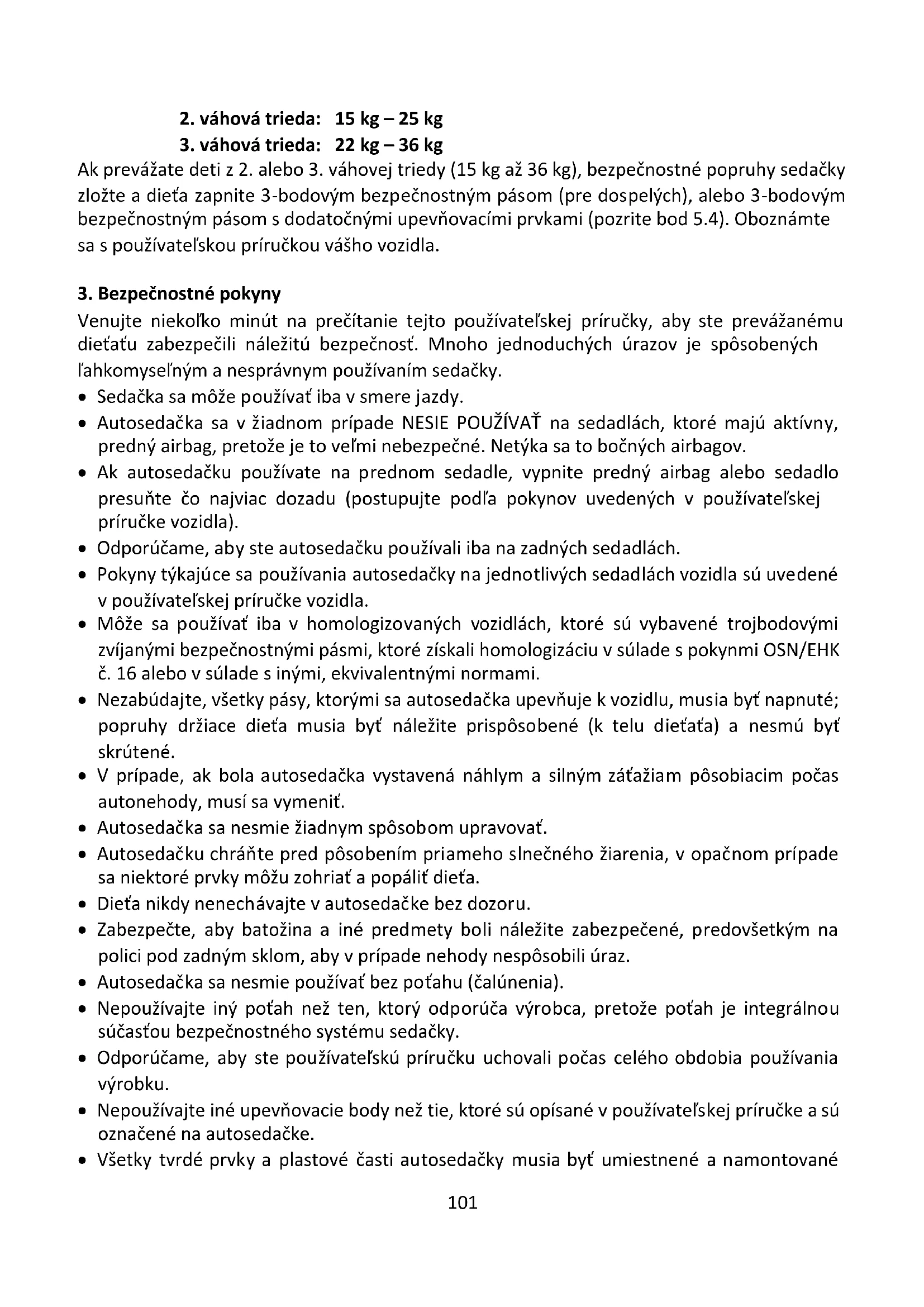 Ak prevážate deti z 2. alebo 3. váhovej triedy (15 kg až 36 kg), bezpečnostné popruhy sedačky zložte a dieťa zapnite 3-bodovým bezpečnostným pásom (pre dospelých), alebo 3-bodovým bezpečnostným pásom s dodatočnými upevňovacími prvkami (pozrite bod 5.4). Oboznámte sa s používateľskou príručkou vášho vozidla.