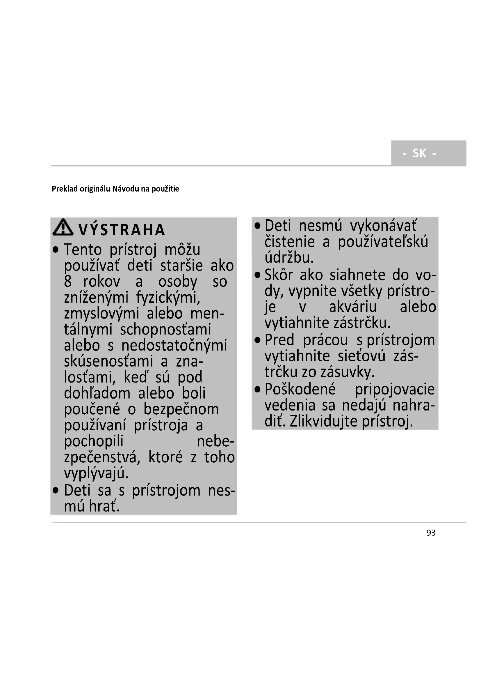 Tento prístroj môžu používať deti staršie ako 8 rokov a osoby so zníženými fyzickými, zmyslovými alebo men- tálnymi schopnosťami alebo s nedostatočnými skúsenosťami a zna- losťami, keď sú pod dohľadom alebo boli poučené o bezpečnom používaní prístroja a pochopili nebe- zpečenstvá, ktoré z toho vyplývajú.