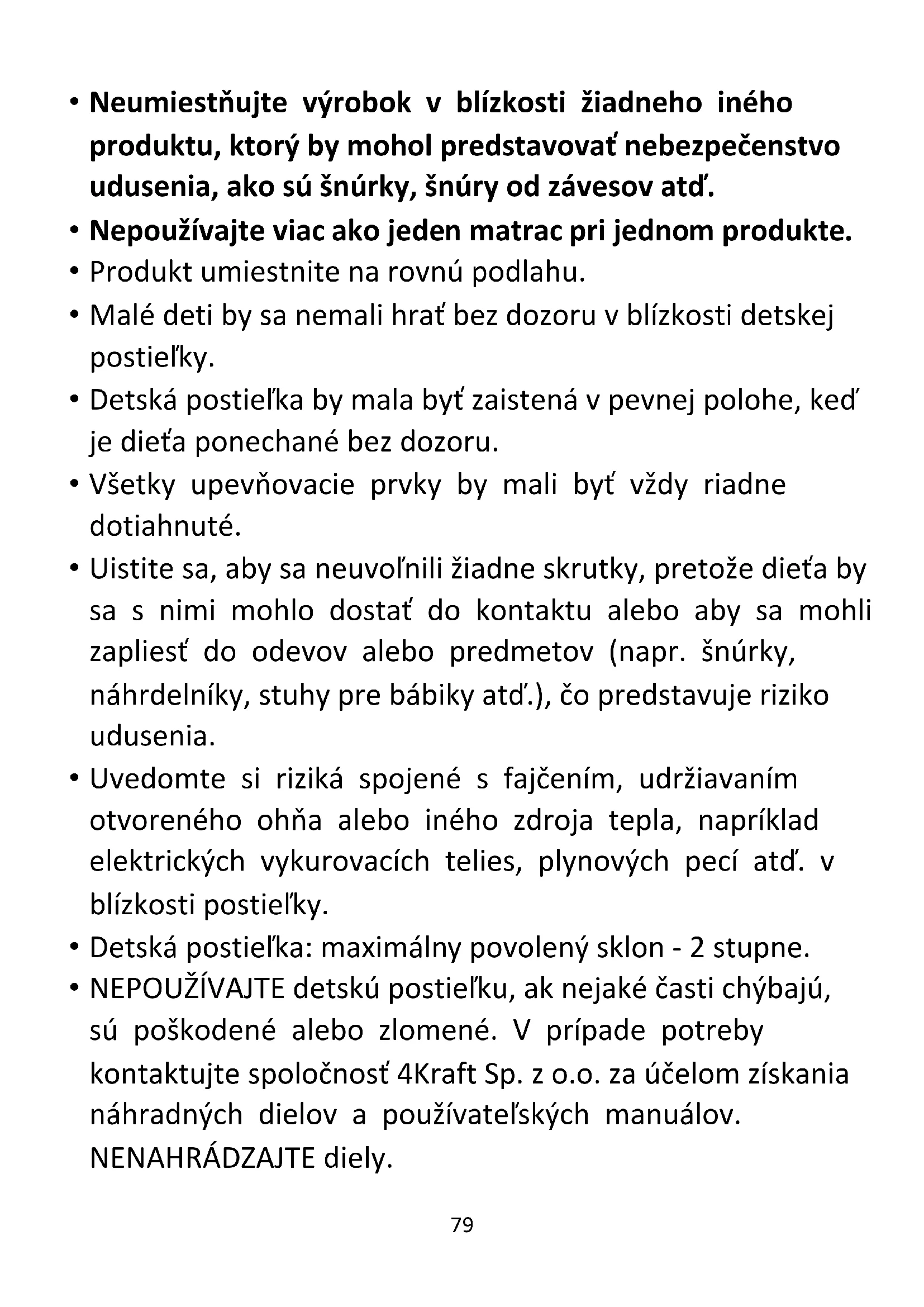 - NEPOUŽÍVAJTE detskú postieľku, ak nejaké časti chýbajú, sú poškodené alebo zlomené. V prípade potreby kontaktujte spoločnosť 4Kraft Sp. z o.o. za účelom získania náhradných dielov a používateľských manuálov. NENAHRÁDZAJTE diely.80