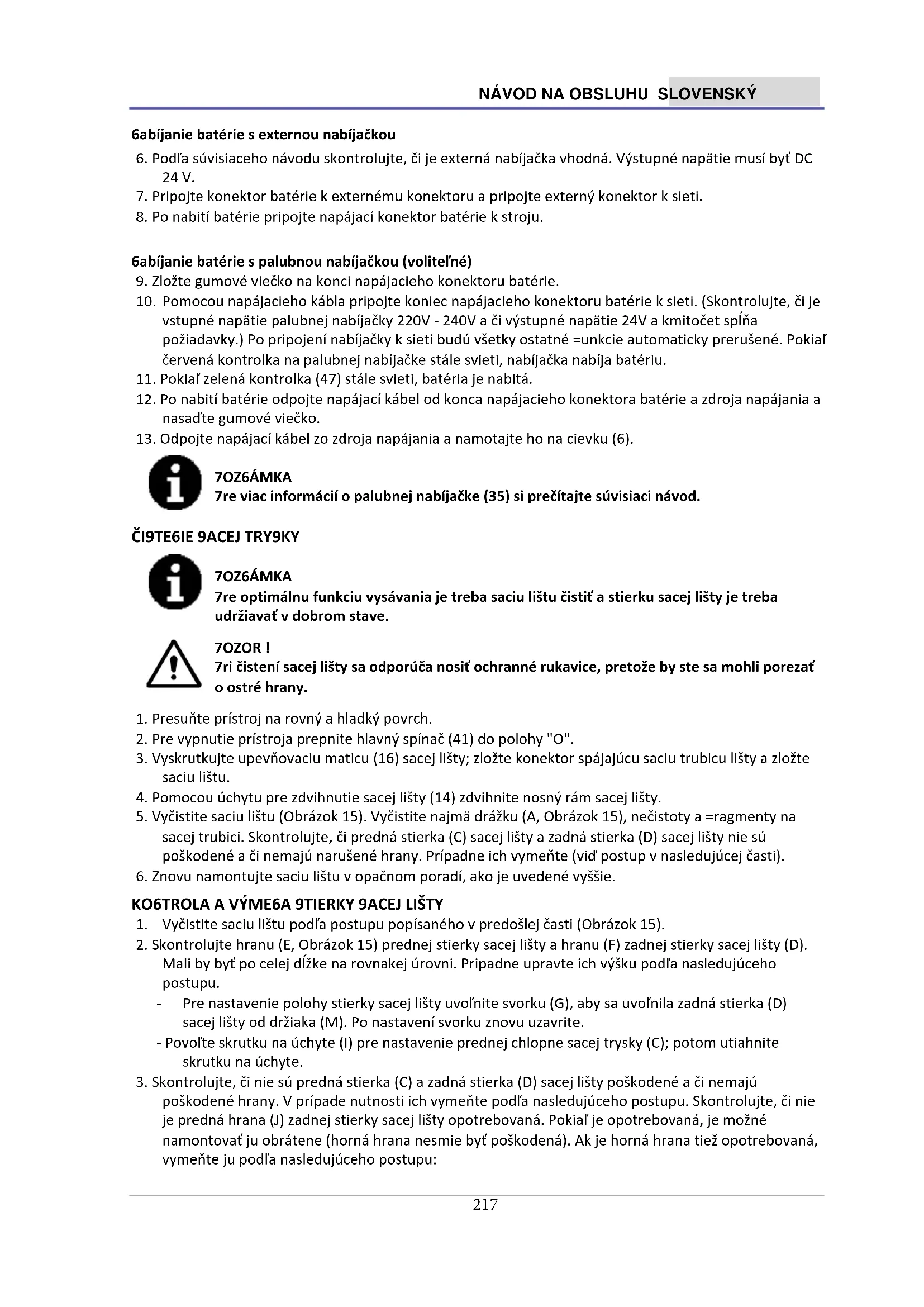 POZNÁMKA Pre optimálnu funkciu vysávania je treba saciu lištu čistiť a stierku sacej lišty je treba udržiavať v dobrom stave. POZOR ! Pri čistení sacej lišty sa odporúča nosiť ochranné rukavice, pretože by ste sa mohli porezať o ostré hrany.