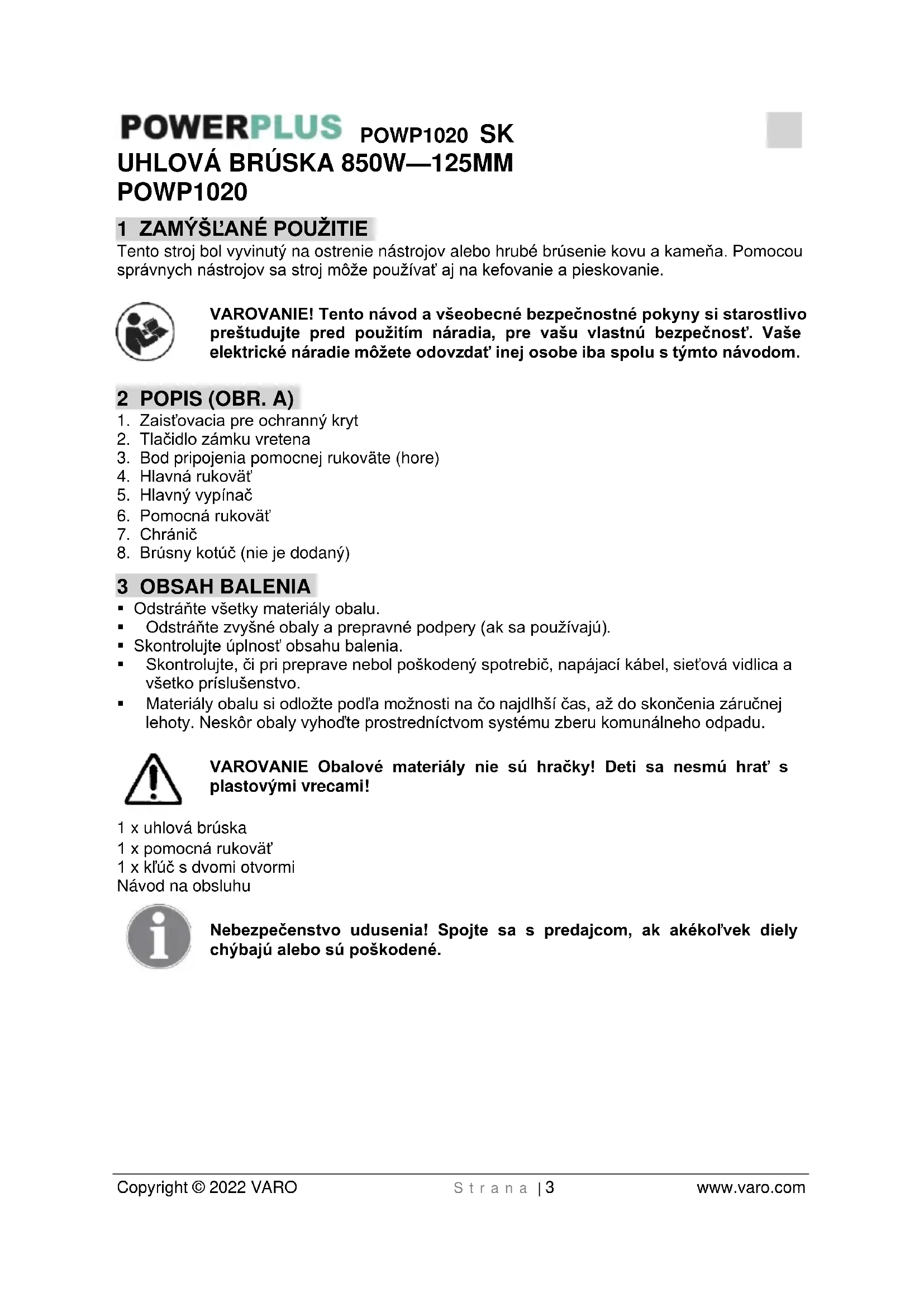 - Materiály obalu si odložte podľa možnosti na čo najdlhší čas, až do skončenia záručnej lehoty. Neskôr obaly vyhoďte prostredníctvom systému zberu komunálneho odpadu. VAROVANIE Obalové materiály nie sú hračky! Deti sa nesmú hrať s plastovými vrecami! 1 x uhlová brúska 1 x pomocná rukoväť 1 x kľúč s dvomi otvormi Návod na obsluhu Nebezpečenstvo udusenia! Spojte sa s predajcom, ak akékoľvek diely chýbajú alebo sú poškodené.POWP1020 SK Copyright © 2022 VARO S t r a n a | 4 www.varo.com 4 VYSVETLENIE SYMBOLOV V tomto návode a/alebo na stroji sa používajú nasledujúce symboly: