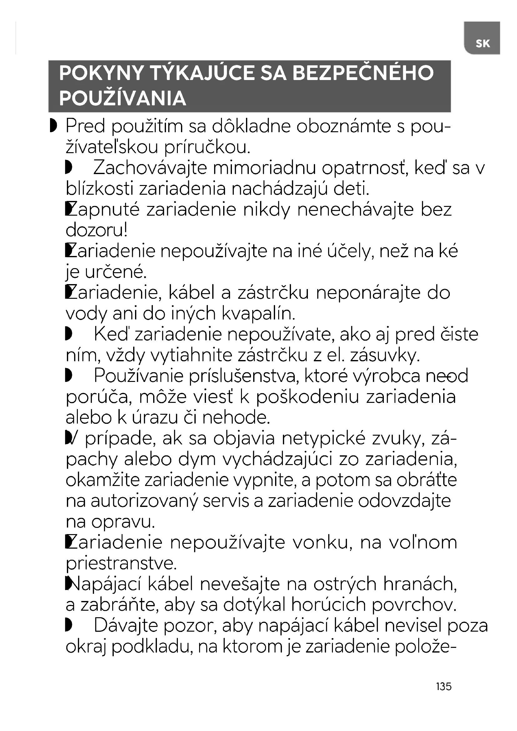 POKYNY TÝKAJÚCE SA BEZPEČNÉHO POUŽÍVANIA Pred použitím sa dôkladne oboznámte s pou- žívateľskou príručkou. Zachovávajte mimoriadnu opatrnosť, keď sa v blízkosti zariadenia nachádzajú deti.