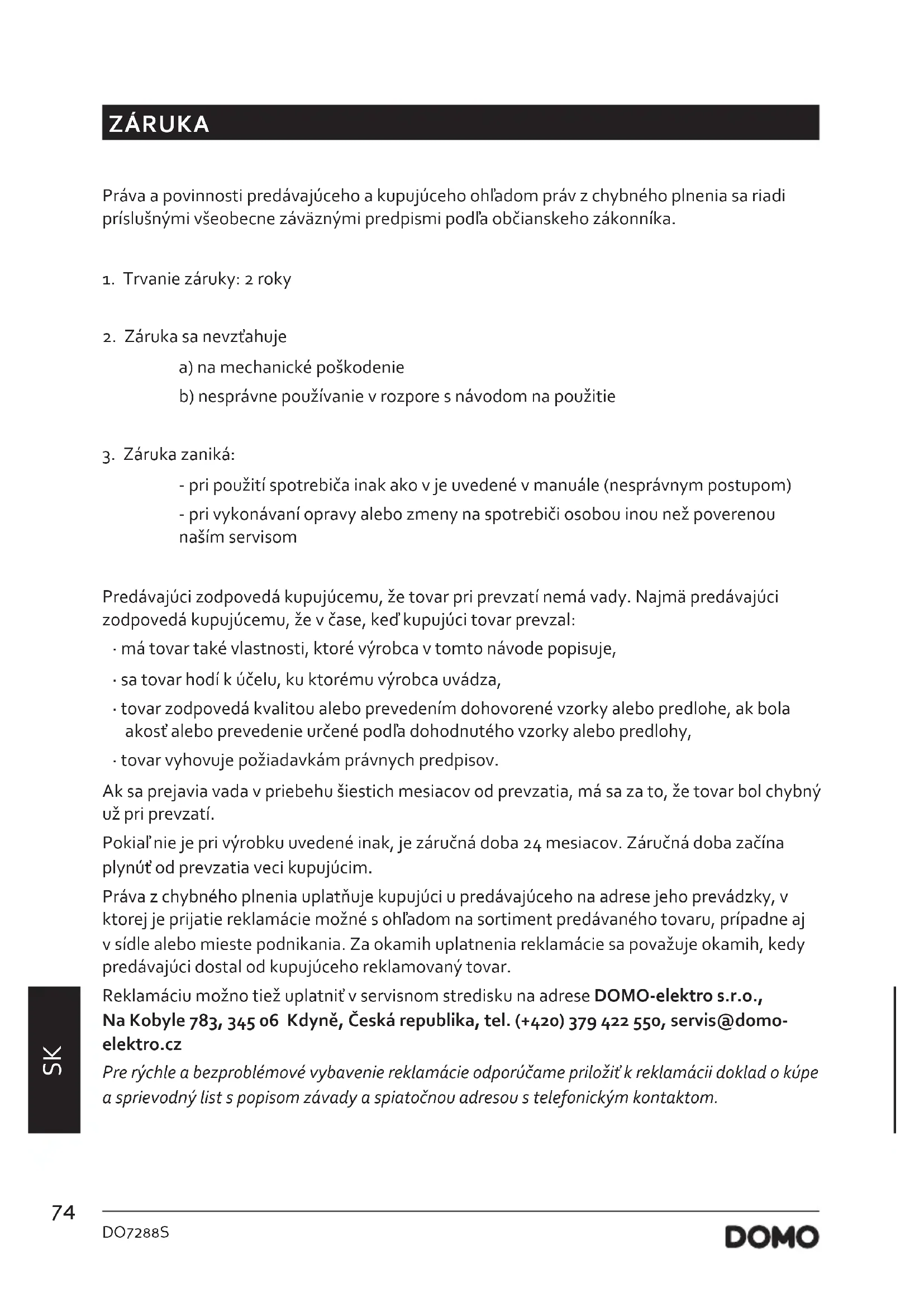 - tovar vyhovuje požiadavkám právnych predpisov. Ak sa prejavia vada v priebehu šiestich mesiacov od prevzatia, má sa za to, že tovar bol chybný už pri prevzatí. Pokiaľ nie je pri výrobku uvedené inak, je záručná doba 24 mesiacov. Záručná doba začína plynúť od prevzatia veci kupujúcim. Práva z chybného plnenia uplatňuje kupujúci u predávajúceho na adrese jeho prevádzky, v ktorej je prijatie reklamácie možné s ohľadom na sortiment predávaného tovaru, prípadne aj v sídle alebo mieste podnikania. Za okamih uplatnenia reklamácie sa považuje okamih, kedy predávajúci dostal od kupujúceho reklamovaný tovar. Reklamáciu možno tiež uplatniť v servisnom stredisku na adrese DOMO-elektro s.r.o., Na Kobyle 783, 345 06 Kdyně, Česká republika, tel. (+420) 379 422 550, servis@domo- elektro.cz Pre rýchle a bezproblémové vybavenie reklamácie odporúčame priložiť k reklamácii doklad o kúpe a sprievodný list s popisom závady a spiatočnou adresou s telefonickým kontaktom.75 DO7288S www.domo-elektro.be