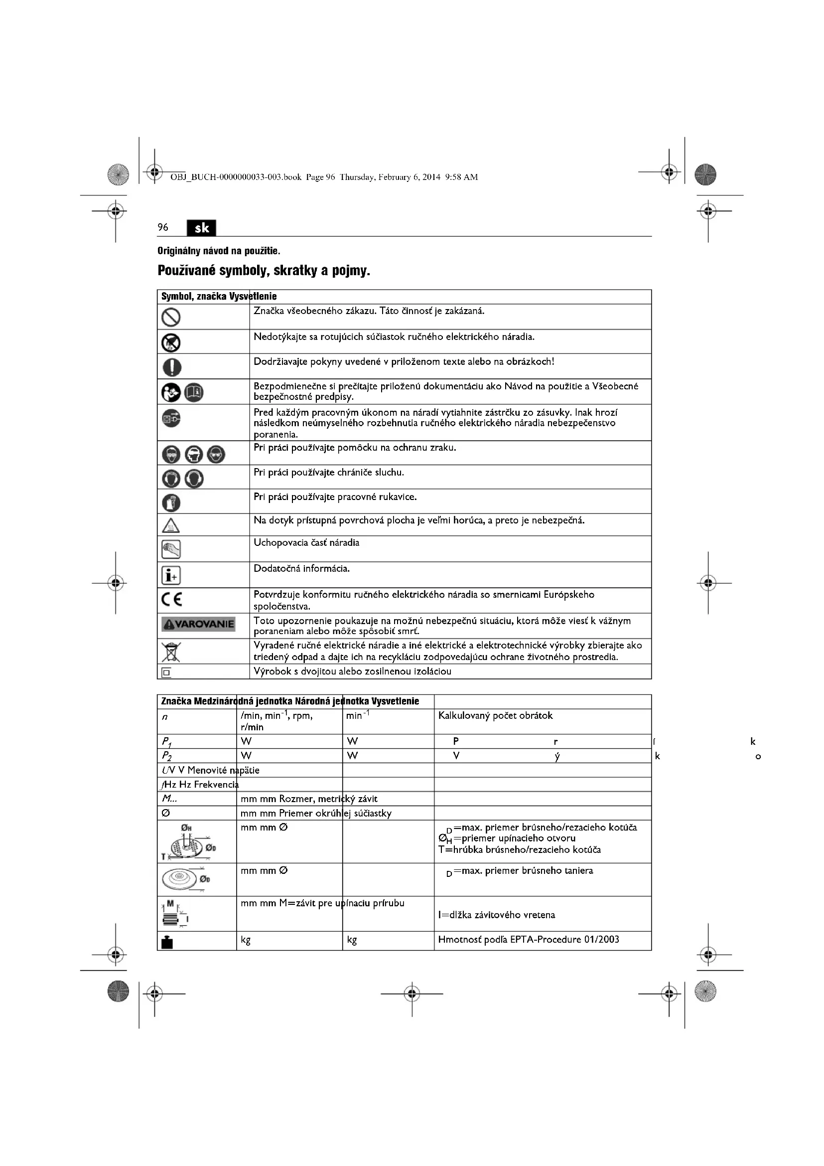 Originálny návod na použitie. Používané symboly, skratky a pojmy. Symbol, značka Vysvetlenie Značka všeobecného zákazu. Táto činnosť je zakázaná. Nedotýkajte sa rotujúcich súčiastok ručného elektrického náradia. Dodržiavajte pokyny uvedené v priloženom texte alebo na obrázkoch! Bezpodmienečne si prečítajte priloženú dokumentáciu ako Návod na použitie a Všeobecné bezpečnostné predpisy. Pred každým pracovným úkonom na náradí vytiahnite zástrčku zo zásuvky. Inak hrozí následkom neúmyselného rozbehnutia ručného elektrického náradia nebezpečenstvo poranenia. Pri práci používajte pomôcku na ochranu zraku. Pri práci používajte chrániče sluchu. Pri práci používajte pracovné rukavice. Na dotyk prístupná povrchová plocha je veľmi horúca, a preto je nebezpečná. Uchopovacia časť náradia Dodatočná informácia. Potvrdzuje konformitu ručného elektrického náradia so smernicami Európskeho spoločenstva. Toto upozornenie poukazuje na možnú nebezpečnú situáciu, ktorá môže viesť k vážnym poraneniam alebo môže spôsobiť smrť. Vyradené ručné elektrické náradie a iné elektrické a elektrotechnické výrobky zbierajte ako triedený odpad a dajte ich na recykláciu zodpovedajúcu ochrane životného prostredia. Výrobok s dvojitou alebo zosilnenou izoláciou Značka Medzinárodná jednotka Národná jednotka Vysvetlenie