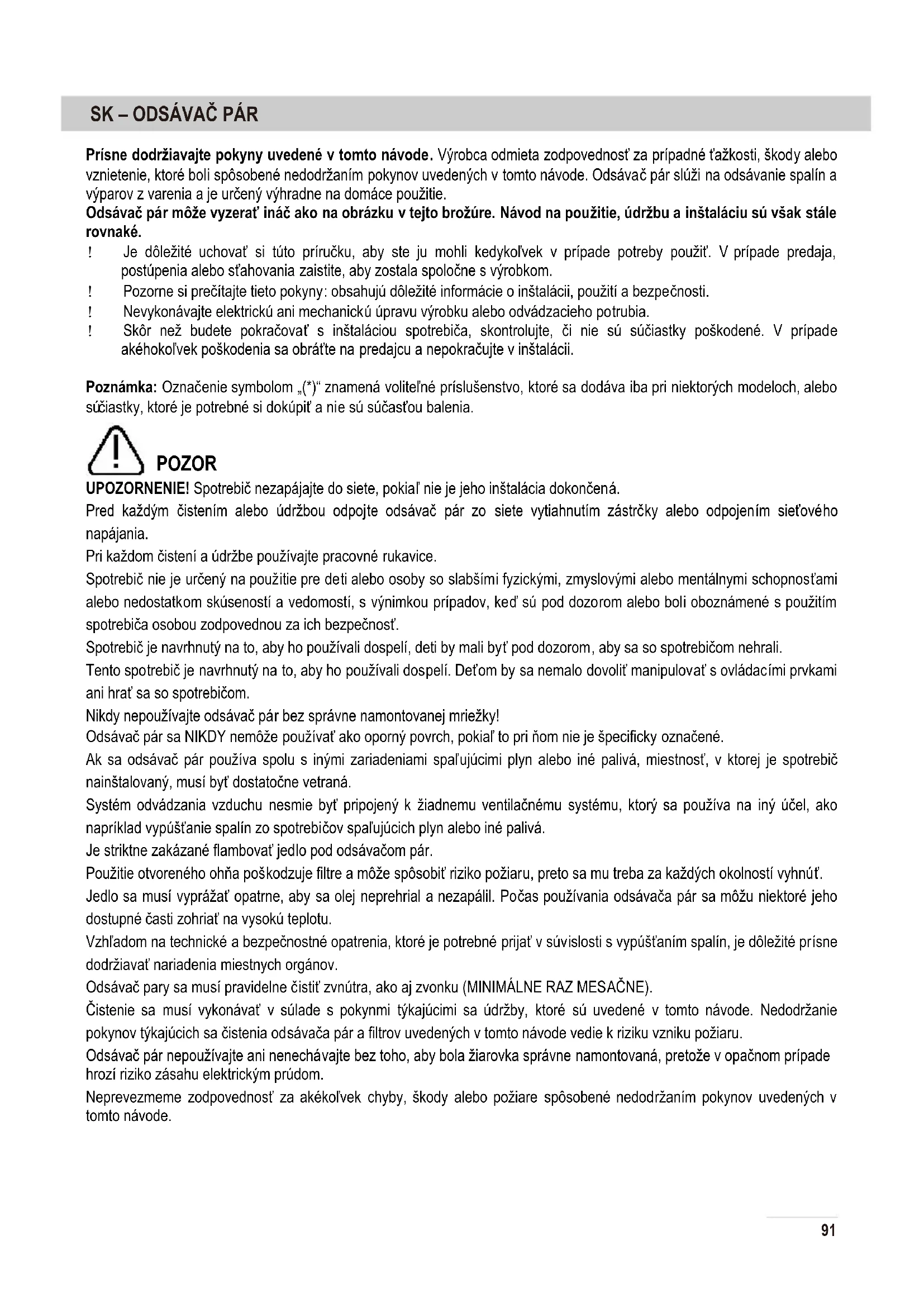 90Prísne dodržiavajte pokyny uvedené v tomto návode. Výrobca odmieta zodpovednosť za prípadné ťažkosti, škody alebo vznietenie, ktoré boli spôsobené nedodržaním pokynov uvedených v tomto návode. Odsávač pár slúži na odsávanie spalín a výparov z varenia a je určený výhradne na domáce použitie. Odsávač pár môže vyzerať ináč ako na obrázku v tejto brožúre. Návod na použitie, údržbu a inštaláciu sú však stále rovnaké. ! Je dôležité uchovať si túto príručku, aby ste ju mohli kedykoľvek v prípade potreby použiť. V prípade predaja, postúpenia alebo sťahovania zaistite, aby zostala spoločne s výrobkom. ! Pozorne si prečítajte tieto pokyny: obsahujú dôležité informácie o inštalácii, použití a bezpečnosti. ! Nevykonávajte elektrickú ani mechanickú úpravu výrobku alebo odvádzacieho potrubia. ! Skôr než budete pokračovať s inštaláciou spotrebiča, skontrolujte, či nie sú súčiastky poškodené. V prípade akéhokoľvek poškodenia sa obráťte na predajcu a nepokračujte v inštalácii. Poznámka: Označenie symbolom „(*)“ znamená voliteľné príslušenstvo, ktoré sa dodáva iba pri niektorých modeloch, alebo