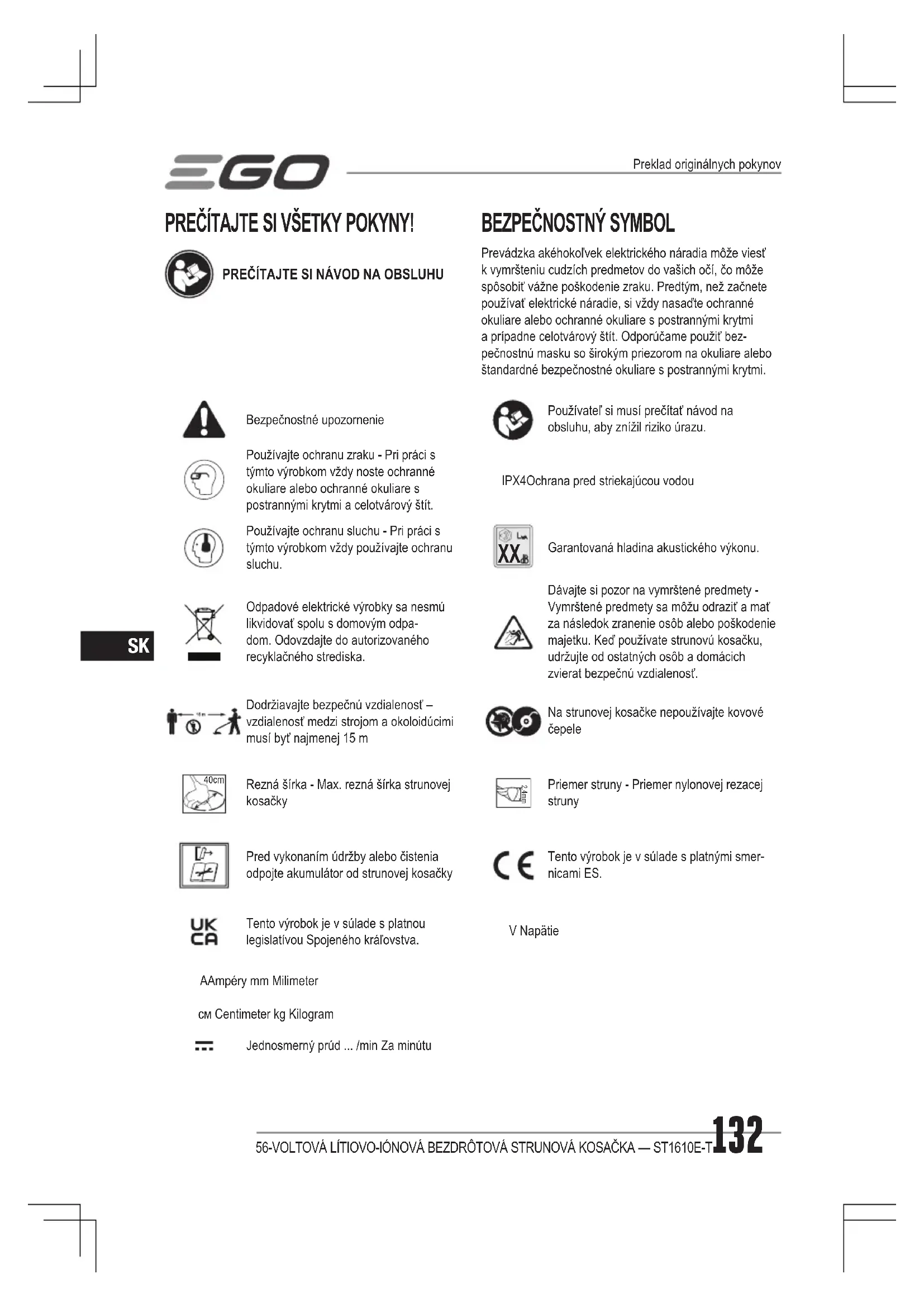 Garantovaná hladina akustického výkonu.Odpadové elektrické výrobky sa nesmú likvidovať spolu s domovým odpa-dom. Odovzdajte do autorizovaného recyklačného strediska.Dávajte si pozor na vymrštené predmety - Vymrštené predmety sa môžu odraziť a mať za následok zranenie osôb alebo poškodenie majetku. Keď používate strunovú kosačku, udržujte od ostatných osôb a domácich zvierat bezpečnú vzdialenosť.Dodržiavajte bezpečnú vzdialenosť – vzdialenosť medzi strojom a okoloidúcimi musí byť najmenej 15 m Na strunovej kosačke nepoužívajte kovové čepele 40cm Rezná šírka - Max. rezná šírka strunovej kosačky 2.4mm Priemer struny - Priemer nylonovej rezacej strunyPred vykonaním údržby alebo čistenia odpojte akumulátor od strunovej kosačkyTento výrobok je v súlade s platnými smer-nicami ES.Tento výrobok je v súlade s platnou legislatívou Spojeného kráľovstva.V NapätieA Ampéry mm Milimeterсм Centimeter kg KilogramJednosmerný prúd ... /min Za minútu56-VOLTOVÁ LÍTIOVO-IÓNOVÁ BEZDRÔTOVÁ STRUNOVÁ KOSAČKA — ST1610E-T 133