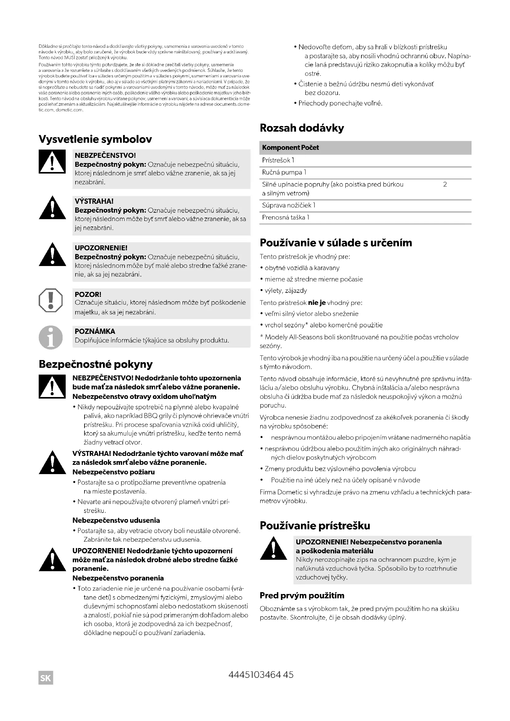 Pred prvým použitím Oboznámte sa s výrobkom tak, že pred prvým použitím ho na skúšku postavíte. Skontrolujte, či je obsah dodávky úplný. NEBZPEČENSTVO! Bezpečnostný pokyn: Označuje nebezpečnú situáciu, ktorej následnom je smrť alebo vážne zranenie, ak sa jej nezabráni. VÝSTRAHA! Bezpečnostný pokyn: Označuje nebezpečnú situáciu, ktorej následnom môže byť smrť alebo vážne zranenie, ak sa jej nezabráni. UPOZORNENIE! Bezpečnostný pokyn: Označuje nebezpečnú situáciu, ktorej následnom môže byť malé alebo stredne ťažké zrane- nie, ak sa jej nezabráni. POZOR! Označuje situáciu, ktorej následnom môže byť poškodenie majetku, ak sa jej nezabráni. POZNÁMKA Doplňujúce informácie týkajúce sa obsluhy produktu. Komponent Počet Prístrešok 1 Ručná pumpa 1 Silné upínacie popruhy (ako poistka pred búrkou a silným vetrom)