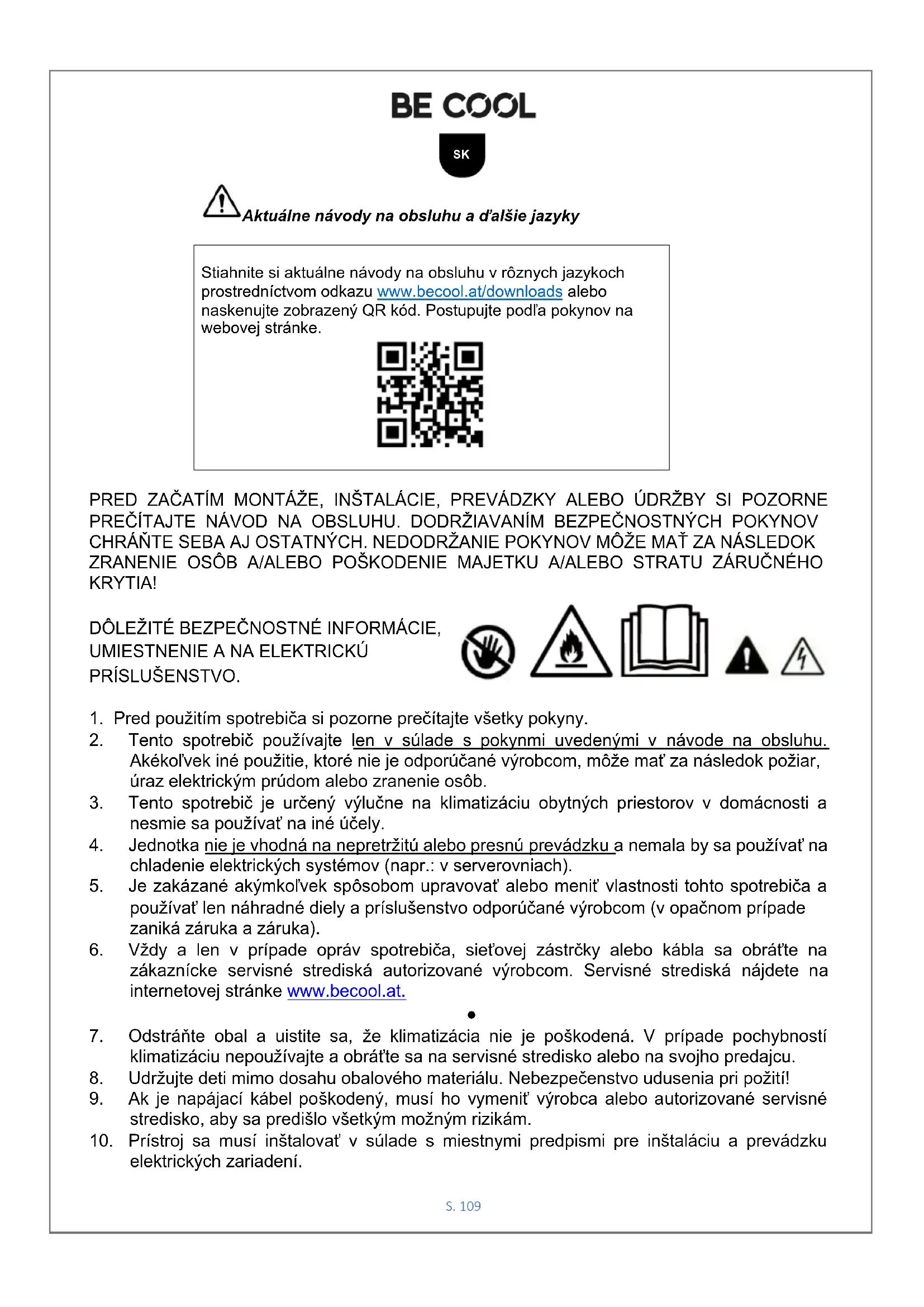 Stiahnite si aktuálne návody na obsluhu v rôznych jazykoch prostredníctvom odkazu www.becool.at/downloads alebo naskenujte zobrazený QR kód. Postupujte podľa pokynov na webovej stránke.