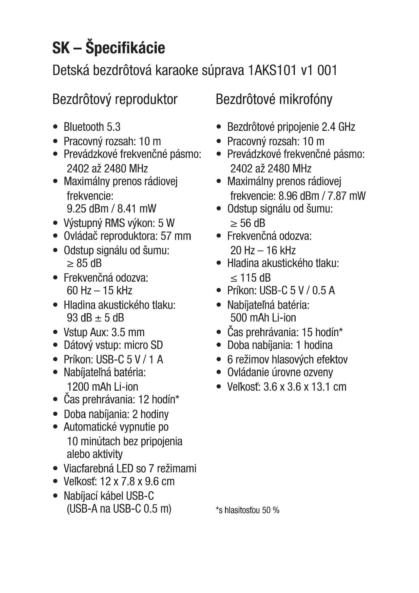 - Veľkosť: 3.6 x 3.6 x 13.1 cm *s hlasitosťou 50 % SK – Špecifikácie Detská bezdrôtová karaoke súprava 1AKS101 v1 001VÝSTRAHA Vždy presne dodržiavajte všetky pokyny a upozornenia. Nerozoberajte ani neupravujte. Neotvárajte ani neopravujte zariadenie sami. Nevystavujte pôsobeniu tekutín. Nepoužívajte ani neskladujte vo vlhkom, vlhkom alebo mokrom prostredí. Nevystavujte nadmernému teplu ani otvorenému ohňu. Vyhnite sa prudkým zmenám teploty. Nespaľujte ani nezapaľujte. POZOR: Tento produkt obsahuje dobíjacie lítiové batérie 3.7 V, 1200 mAh (1x) a 500 mAh (2x). Neotvárajte prístroj a nepokúšajte sa vybiť ani vymeniť batériu. Pri nesprávnom zaobchádzaní s batériou hrozí nebezpečenstvo výbuchu. Zariadenie nevyhadzujte spolu s iným odpadom. Ak sa chcete vyhnúť možnému znečisteniu životného prostredia, prístroj je potrebné zlikvidovať prostredníctvom recyklačného strediska. Časté alebo dlhodobé vystavenie silnému hluku alebo zvukom môže spôsobiť dočasnú alebo trvalú stratu sluchu. Individuálna náchylnosť k strate sluchu spôsobenej hlukom a potenciálnym problémom so sluchom sa líši. Pri používaní reproduktor minimalizujte svoje vystavenie hlasným zvukom alebo zvukom. Aby ste minimalizovali riziko poškodenia sluchu, udržujte dostatočne nízku hlasitosť, aby ste mohli viesť rozhovor s ľuďmi v okolí. Výkon dodávaný nabíjačkou musí byť medzi minimálne 1 Watt požadovaných rádiovým zariadením a maximálne 12 Watt, aby sa dosiahla maximálna rýchlosť nabíjania. © copyright 2024 Sitecom Europe B.V. Fresh ‘n Rebel je registrovaná ochranná známka, ktorú vlastní spoločnosť Sitecom Europe B.V. Slovné označenie Bluetooth