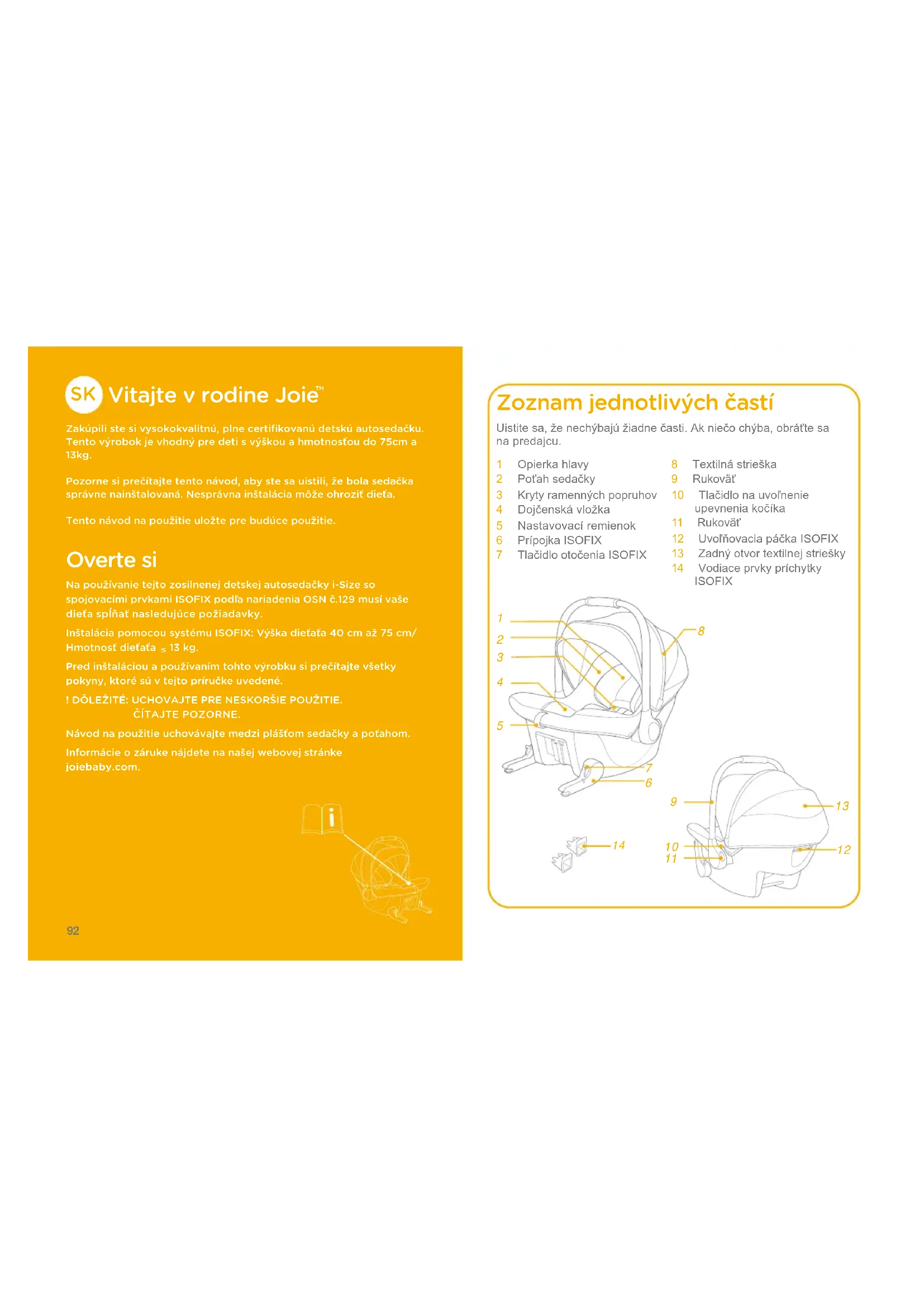 Zakúpili ste si vysokokvalitnú﹐ plne certifikovanú detskú autosedačku. Tento výrobok je vhodný pre deti s výškou a hmotnosťou do 75cm a 13kg.Pozorne si prečítajte tento návod﹐ aby ste sa uistili﹐ že bola sedačka správne nainštalovaná. Nesprávna inštalácia môže ohroziť dieťa.Tento návod na použitie uložte pre budúce použitie. Overte si Na používanie tejto zosilnenej detskej autosedačky i-Size so spojovacími prvkami ISOFIX podľa nariadenia OSN č.129 musí vaše dieťa spĺňať nasledujúce požiadavky.Inštalácia pomocou systému ISOFIX: Výška dieťaťa 40 cm až 75 cm/Hmotnosť dieťaťa 13 kg.Pred inštaláciou a používaním tohto výrobku si prečítajte všetky pokyny﹐ ktoré sú v tejto príručke uvedené.! DÔLEŽITÉ: UCHOVAJTE PRE NESKORŠIE POUŽITIE.ČÍTAJTE POZORNE.Návod na použitie uchovávajte medzi plášťom sedačky a poťahom.Informácie o záruke nájdete na našej webovej stránke joiebaby.com. Zoznam jednotlivých častí 1 Opierkahlavy2 Poťahsedačky3 Krytyramennýchpopruhov4 Dojčenskávložka5 Nastavovacíremienok6 PrípojkaISOFIX7 TlačidlootočeniaISOFIX8 Textilnástrieška9 Rukoväť10 Tlačidlonauvoľnenieupevneniakočíka11 Rukoväť12 UvoľňovaciapáčkaISOFIX13 Zadnýotvortextilnejstriešky14 VodiaceprvkypríchytkyISOFIXUistitesa,ženechýbajúžiadnečasti.Akniečochýba,obráťtesanapredajcu.