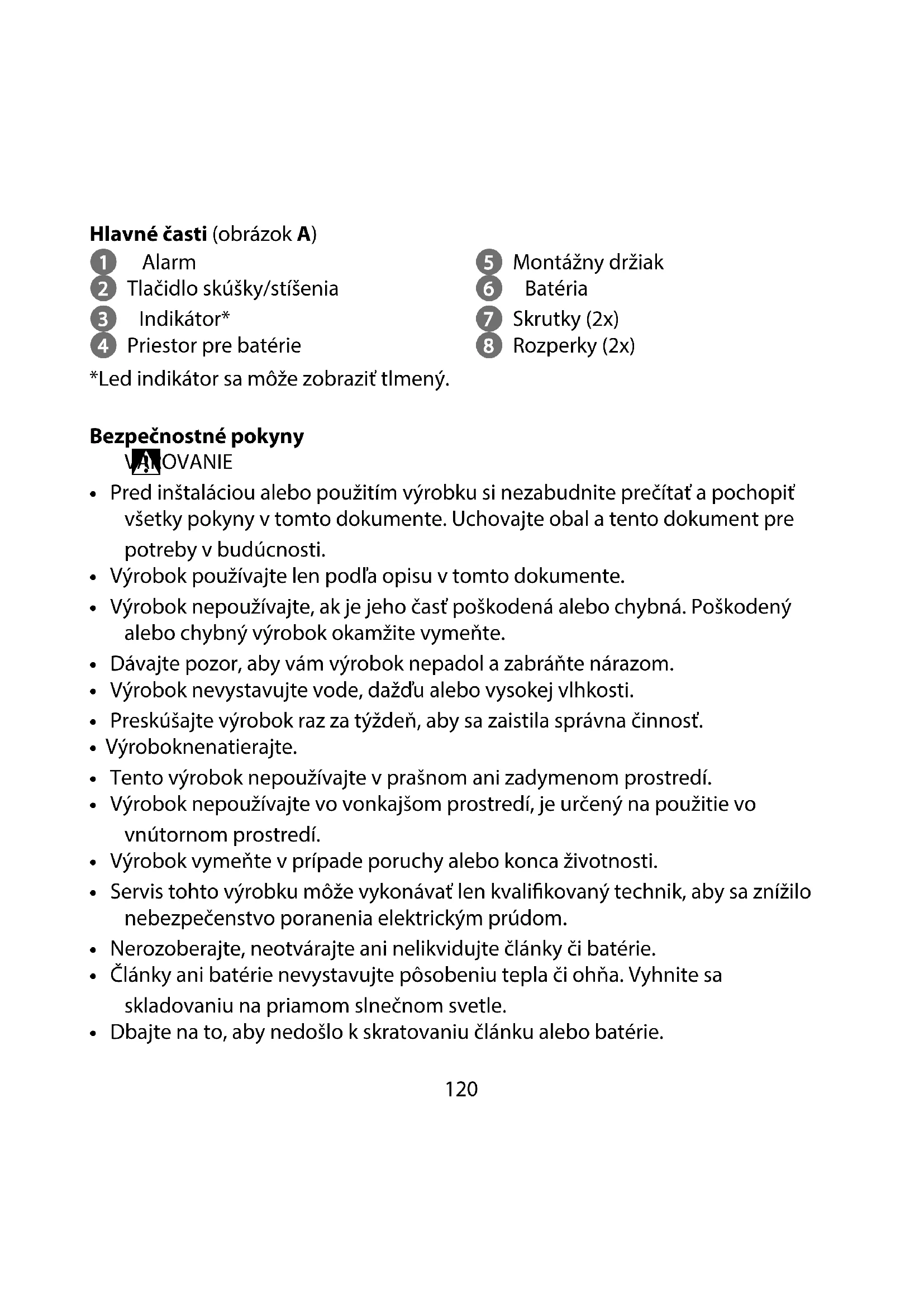 blikne dvakrát a alarm zaznie raz za 40 sekúnd. Výrobok má poruchu. Vymeňte ho.