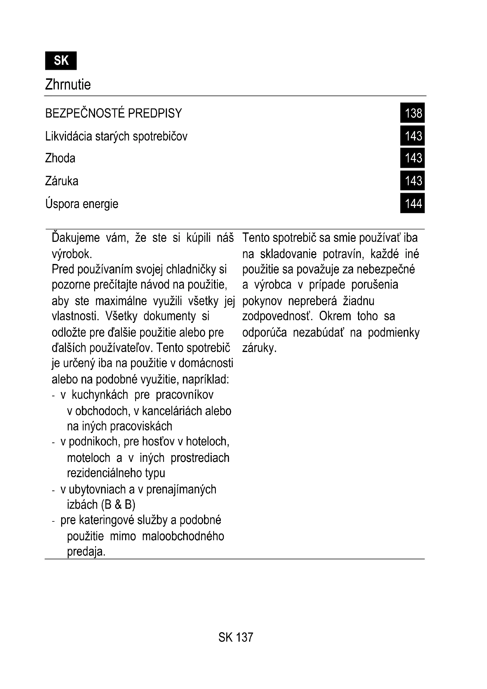 Ďakujeme vám, že ste si kúpili náš výrobok. Pred používaním svojej chladničky si pozorne prečítajte návod na použitie, aby ste maximálne využili všetky jej vlastnosti. Všetky dokumenty si odložte pre ďalšie použitie alebo pre ďalších používateľov. Tento spotrebič je určený iba na použitie v domácnosti alebo na podobné využitie, napríklad: - v kuchynkách pre pracovníkov v obchodoch, v kanceláriách alebo na iných pracoviskách - v podnikoch, pre hosťov v hoteloch, moteloch a v iných prostrediach rezidenciálneho typu - v ubytovniach a v prenajímaných izbách (B & B) - pre kateringové služby a podobné použitie mimo maloobchodného predaja. Tento spotrebič sa smie používať iba na skladovanie potravín, každé iné použitie sa považuje za nebezpečné a výrobca v prípade porušenia pokynov nepreberá žiadnu zodpovednosť. Okrem toho sa odporúča nezabúdať na podmienky záruky.SK 138