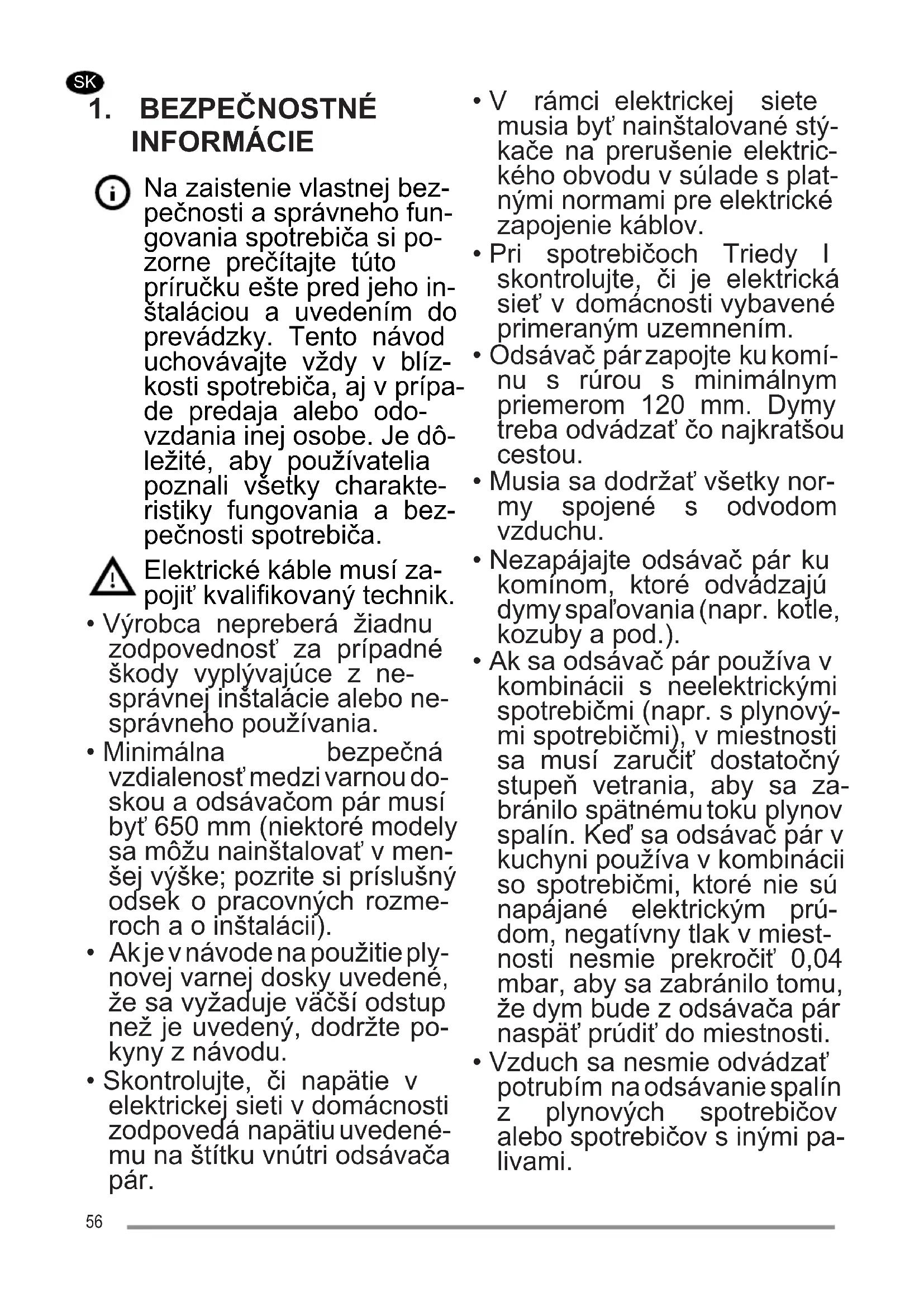 - Vzduch sa nesmie odvádzať potrubím na odsávanie spalín z plynových spotrebičov alebo spotrebičov s inými pa- livami. 56• Po poškodení napájacieho elektrického kábla ho budete musieť dať vymeniť výrobcovi alebo technikovi v prevádzke servisu.