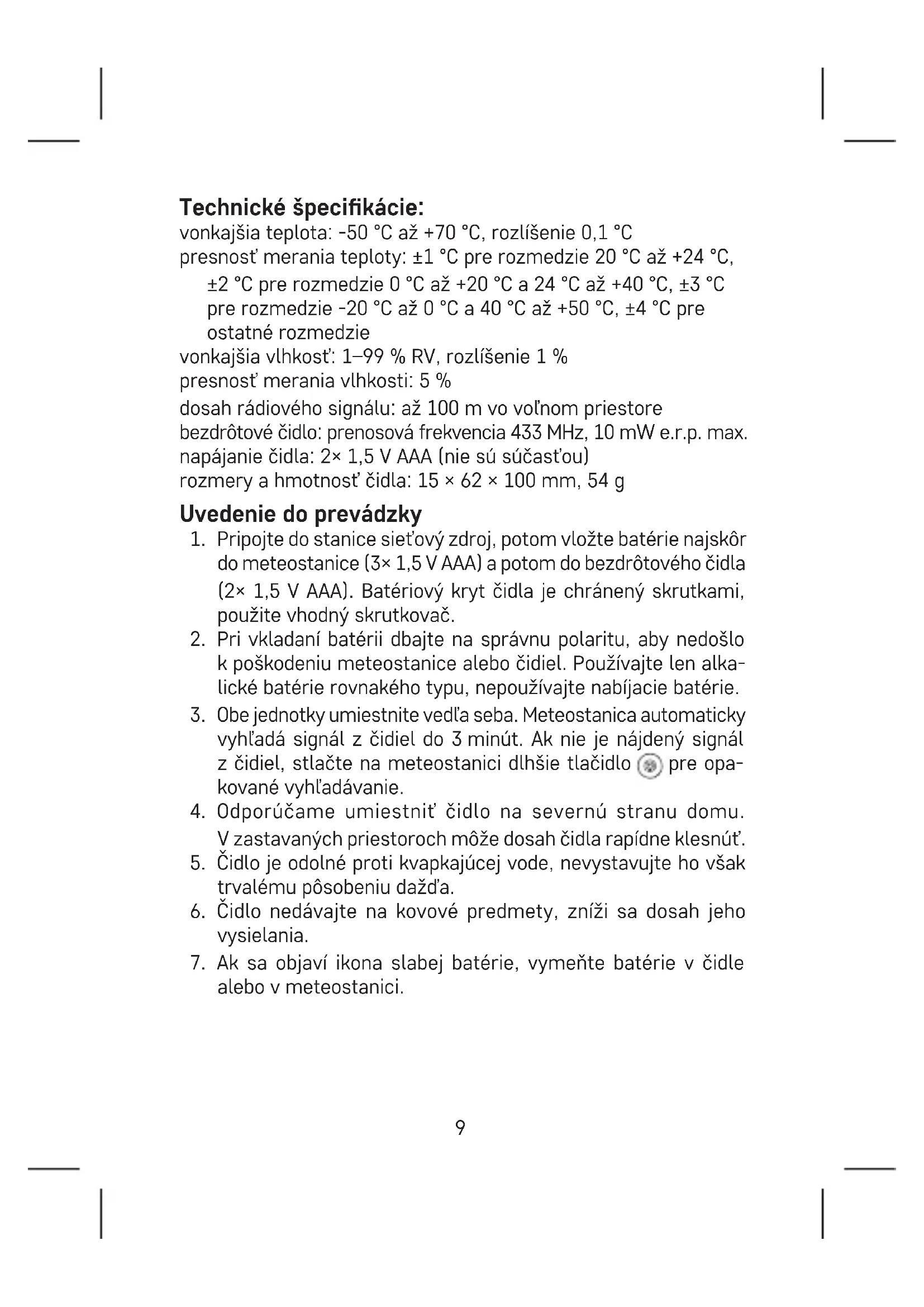 Technické špecikácie: vonkajšia teplota: -50 °C až +70 °C, rozlíšenie 0,1 °C presnosť merania teploty: ±1 °C pre rozmedzie 20 °C až +24 °C, ±2 °C pre rozmedzie 0 °C až +20 °C a 24 °C až +40 °C, ±3 °C pre rozmedzie -20 °C až 0 °C a 40 °C až +50 °C, ±4 °C pre ostatné rozmedzie vonkajšia vlhkosť: 1–99 % RV, rozlíšenie 1 % presnosť merania vlhkosti: 5 % dosah rádiového signálu: až 100 m vo voľnom priestore bezdrôtové čidlo: prenosová frekvencia 433 MHz, 10 mW e.r.p. max. napájanie čidla: 2× 1,5 V AAA (nie sú súčasťou) rozmery a hmotnosť čidla: 15 × 62 × 100 mm, 54 g Uvedenie do prevádzky