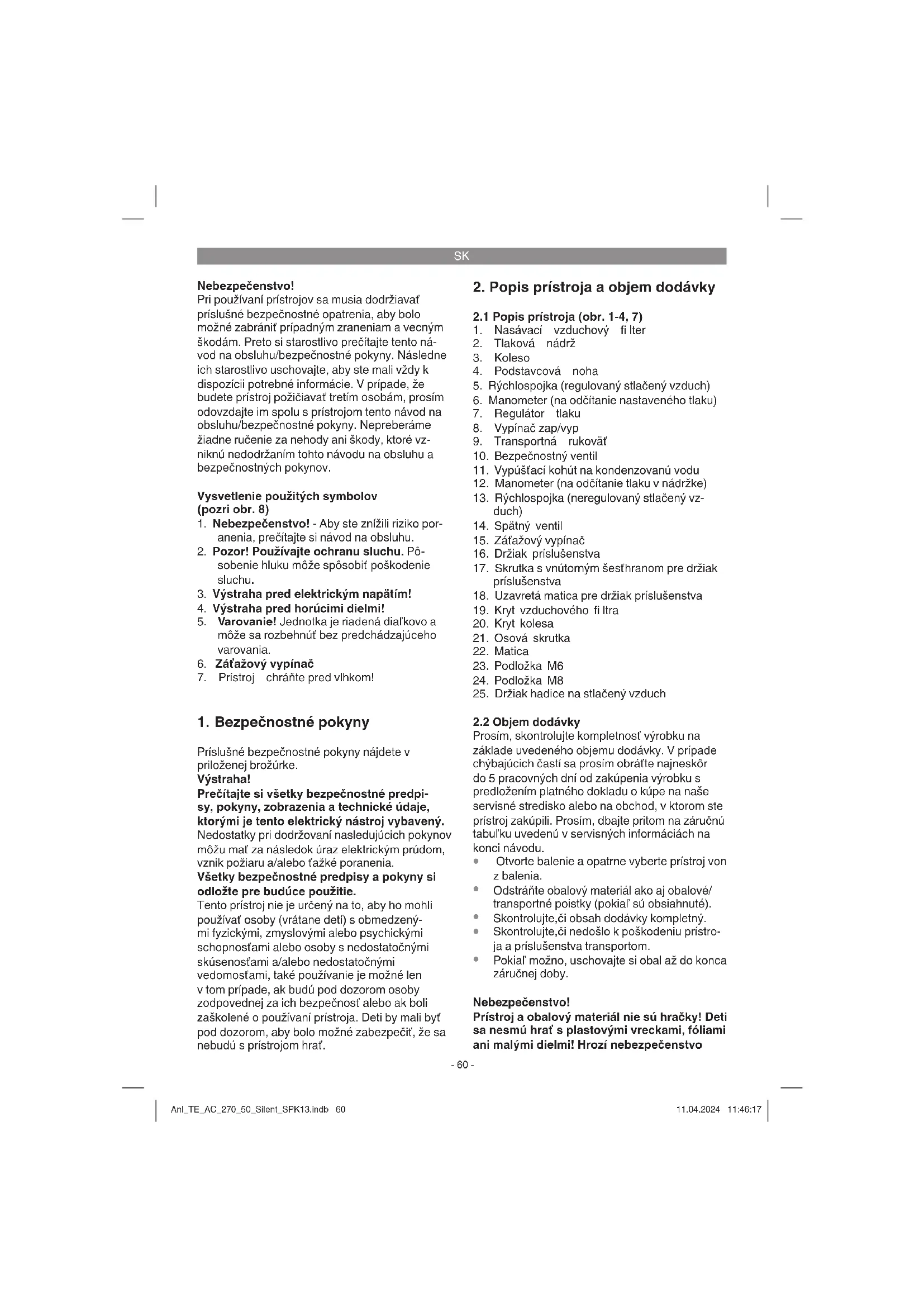 Skontrolujte tlakovu nadobu pred kaźdym pouzitim, ci ne je skorodovaná alebo poskodena. Kompresor sa nesmie prevadzkovat's poskodenou alebo skorodovanou tlakovou nadobou. V tripade, ze sa zistia poskodenia, obratte sa prosim na zakaznicky servis.
