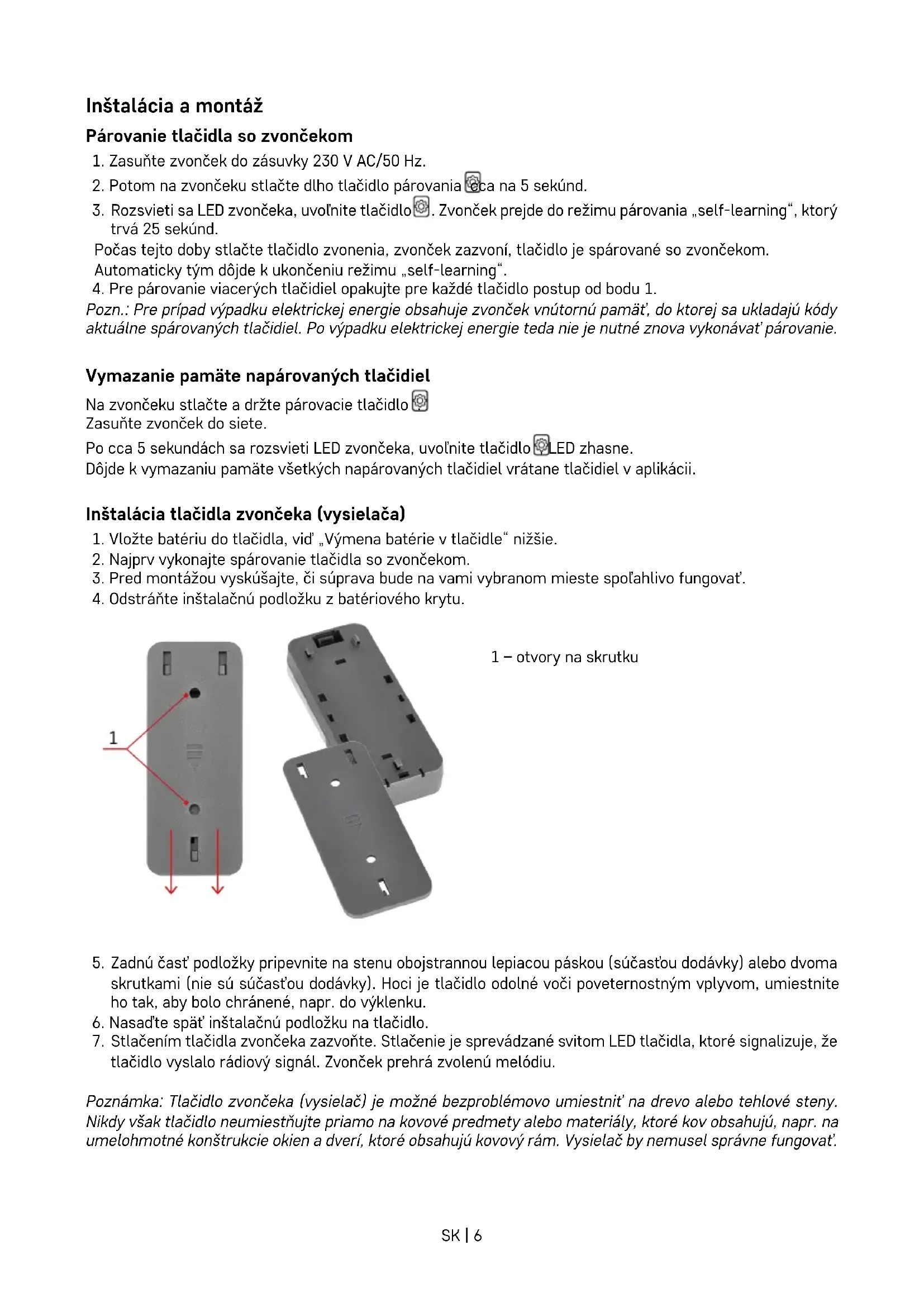 Pozn.: Pre prípad výpadku elektrickej energie obsahuje zvonček vnútornú pamäť, do ktorej sa ukladajú kódy aktuálne spárovaných tlačidiel. Po výpadku elektrickej energie teda nie je nutné znova vykonávať párovanie. Vymazanie pamäte napárovaných tlačidiel Na zvončeku stlačte a držte párovacie tlačidlo . Zasuňte zvonček do siete. Po cca 5 sekundách sa rozsvieti LED zvončeka, uvoľnite tlačidlo , LED zhasne. Dôjde k vymazaniu pamäte všetkých napárovaných tlačidiel vrátane tlačidiel v aplikácii. Inštalácia tlačidla zvončeka (vysielača)