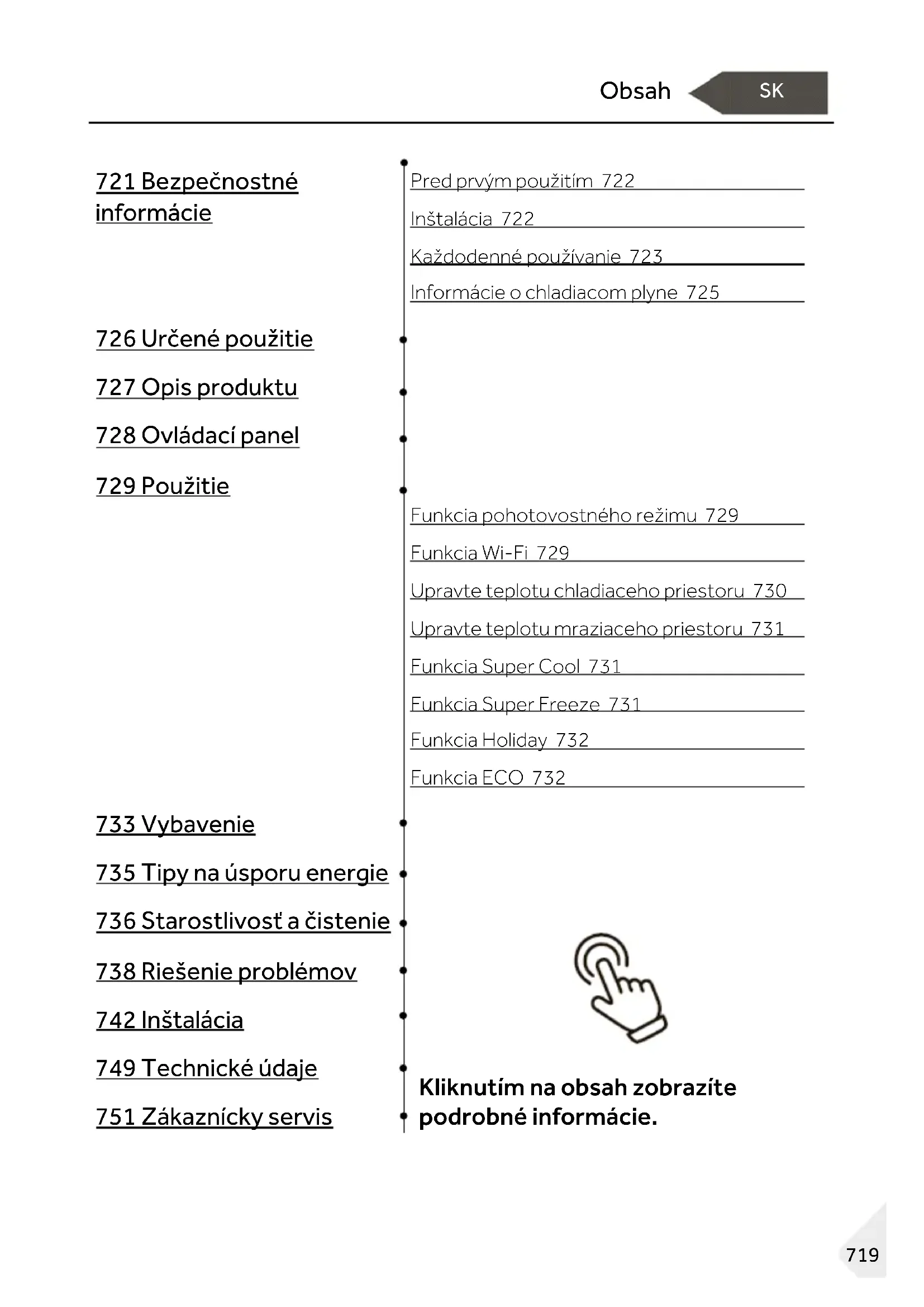 735 Tipy na úsporu energie 736 Starostlivosť a čistenie 738 Riešenie problémov 742 Inštalácia 749 Technické údaje Kliknutím na obsah zobrazíte podrobné informácie. 751 Zákaznícky servisĎakujeme