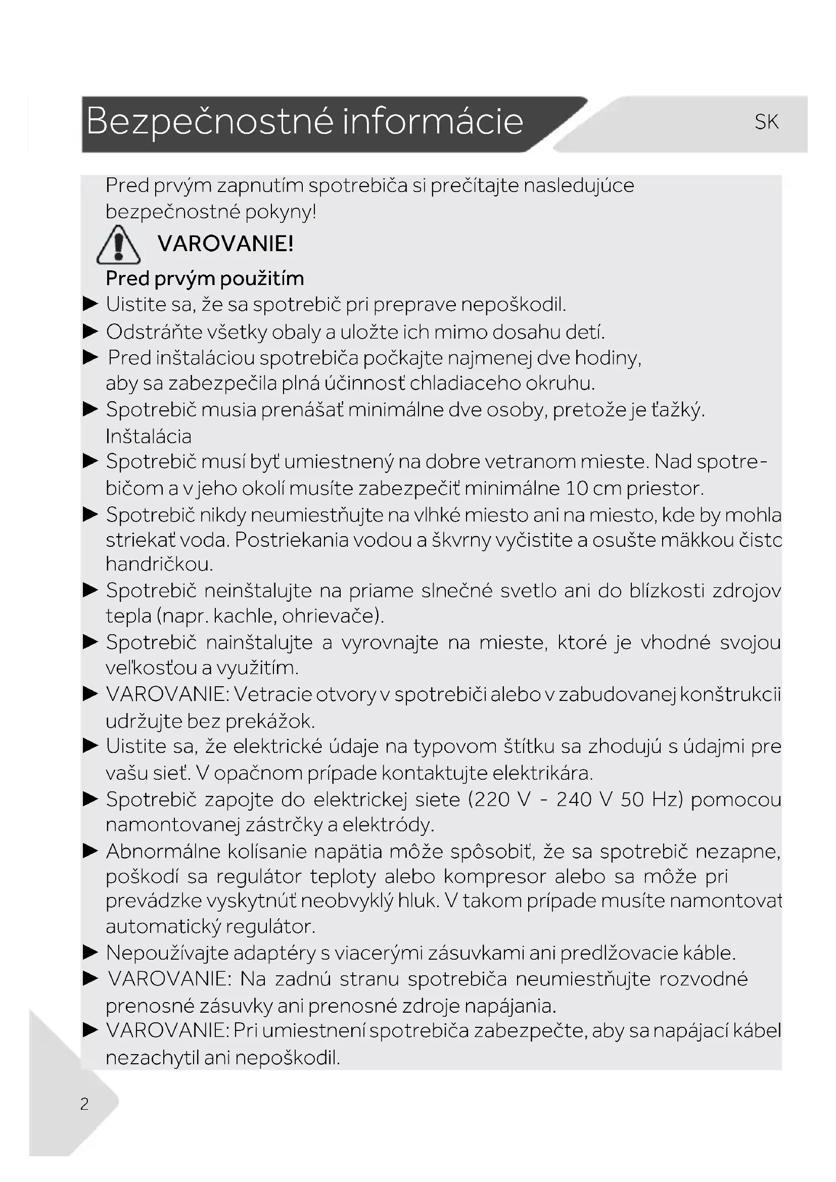VAROVANIE! Pred prvým použitím ► Uistite sa, že sa spotrebič pri preprave nepoškodil. ► Odstráňte všetky obaly a uložte ich mimo dosahu detí. ► Pred inštaláciou spotrebiča počkajte najmenej dve hodiny, aby sa zabezpečila plná účinnosť chladiaceho okruhu. ► Spotrebič musia prenášať minimálne dve osoby, pretože je ťažký. Inštalácia ► Spotrebič musí byť umiestnený na dobre vetranom mieste. Nad spotre- bičom a v jeho okolí musíte zabezpečiť minimálne 10 cm priestor. ► Spotrebič nikdy neumiestňujte na vlhké miesto ani na miesto, kde by mohla striekať voda. Postriekania vodou a škvrny vyčistite a osušte mäkkou čistou handričkou. ► Spotrebič neinštalujte na priame slnečné svetlo ani do blízkosti zdrojov tepla (napr. kachle, ohrievače). ► Spotrebič nainštalujte a vyrovnajte na mieste, ktoré je vhodné svojou veľkosťou a využitím. ► VAROVANIE: Vetracie otvory v spotrebiči alebo v zabudovanej konštrukcii udržujte bez prekážok. ► Uistite sa, že elektrické údaje na typovom štítku sa zhodujú s údajmi pre vašu sieť. V opačnom prípade kontaktujte elektrikára. ► Spotrebič zapojte do elektrickej siete (220 V - 240 V 50 Hz) pomocou namontovanej zástrčky a elektródy. ► Abnormálne kolísanie napätia môže spôsobiť, že sa spotrebič nezapne, poškodí sa regulátor teploty alebo kompresor alebo sa môže pri prevádzke vyskytnúť neobvyklý hluk. V takom prípade musíte namontovať automatický regulátor. ► Nepoužívajte adaptéry s viacerými zásuvkami ani predlžovacie káble. ► VAROVANIE: Na zadnú stranu spotrebiča neumiestňujte rozvodné prenosné zásuvky ani prenosné zdroje napájania. ► VAROVANIE: Pri umiestnení spotrebiča zabezpečte, aby sa napájací kábel nezachytil ani nepoškodil.SK Bezpečnostné informácie