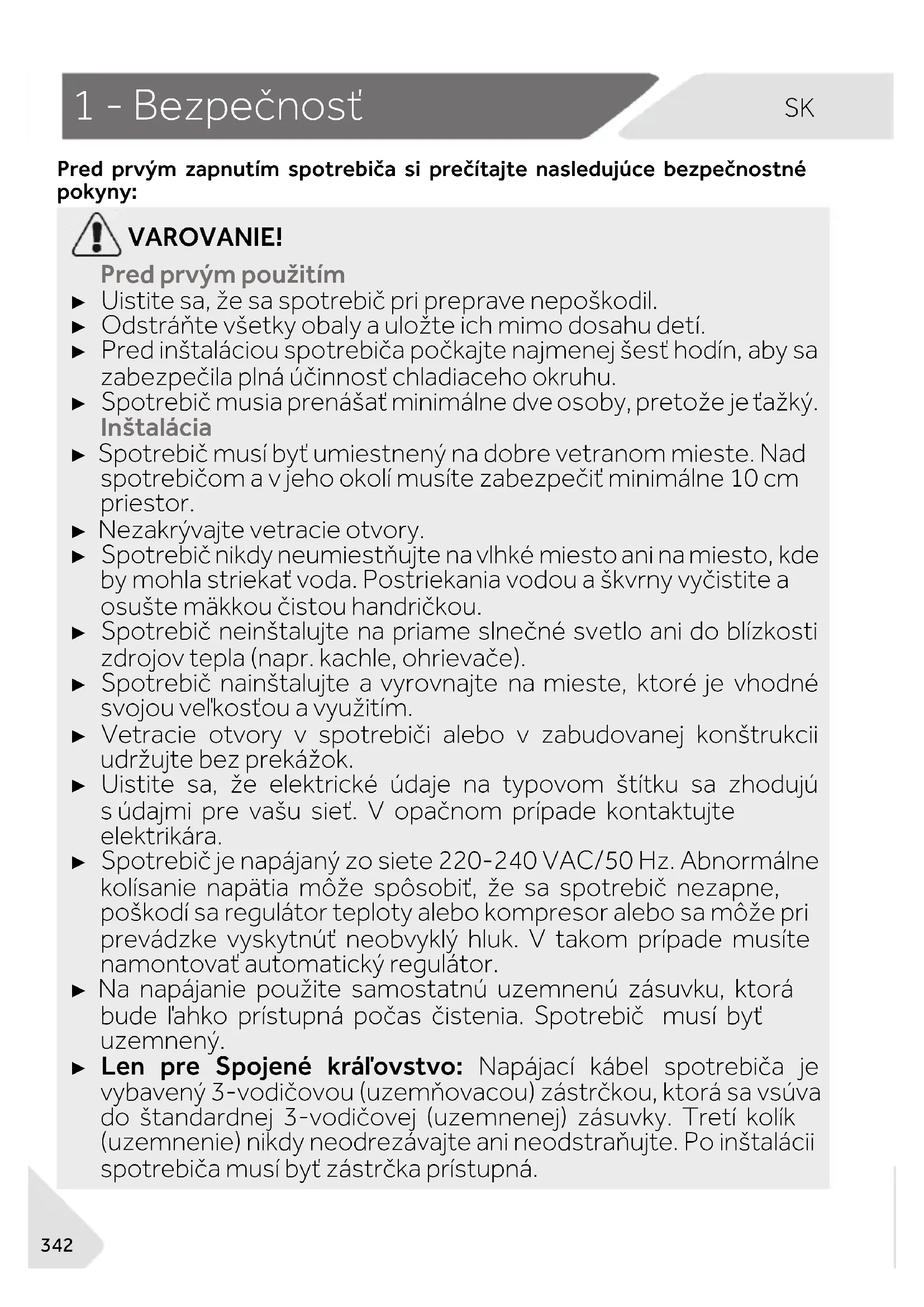 Pred prvým zapnutím spotrebiča si prečítajte nasledujúce bezpečnostné pokyny: VAROVANIE! Pred prvým použitím ► Uistite sa, že sa spotrebič pri preprave nepoškodil. ► Odstráňte všetky obaly a uložte ich mimo dosahu detí. ► Pred inštaláciou spotrebiča počkajte najmenej šesť hodín, aby sa zabezpečila plná účinnosť chladiaceho okruhu. ► Spotrebič musia prenášať minimálne dve osoby, pretože je ťažký. Inštalácia ► Spotrebič musí byť umiestnený na dobre vetranom mieste. Nad spotrebičom a v jeho okolí musíte zabezpečiť minimálne 10 cm priestor. ► Nezakrývajte vetracie otvory. ► Spotrebič nikdy neumiestňujte na vlhké miesto ani na miesto, kde by mohla striekať voda. Postriekania vodou a škvrny vyčistite a osušte mäkkou čistou handričkou. ► Spotrebič neinštalujte na priame slnečné svetlo ani do blízkosti zdrojov tepla (napr. kachle, ohrievače). ► Spotrebič nainštalujte a vyrovnajte na mieste, ktoré je vhodné svojou veľkosťou a využitím. ► Vetracie otvory v spotrebiči alebo v zabudovanej konštrukcii udržujte bez prekážok. ► Uistite sa, že elektrické údaje na typovom štítku sa zhodujú s údajmi pre vašu sieť. V opačnom prípade kontaktujte elektrikára. ► Spotrebič je napájaný zo siete 220-240 VAC/50 Hz. Abnormálne kolísanie napätia môže spôsobiť, že sa spotrebič nezapne, poškodí sa regulátor teploty alebo kompresor alebo sa môže pri prevádzke vyskytnúť neobvyklý hluk. V takom prípade musíte namontovať automatický regulátor. ► Na napájanie použite samostatnú uzemnenú zásuvku, ktorá bude ľahko prístupná počas čistenia. Spotrebič musí byť uzemnený. ► Len pre Spojené kráľovstvo: Napájací kábel spotrebiča je vybavený 3-vodičovou (uzemňovacou) zástrčkou, ktorá sa vsúva do štandardnej 3-vodičovej (uzemnenej) zásuvky. Tretí kolík (uzemnenie) nikdy neodrezávajte ani neodstraňujte. Po inštalácii spotrebiča musí byť zástrčka prístupná.SK