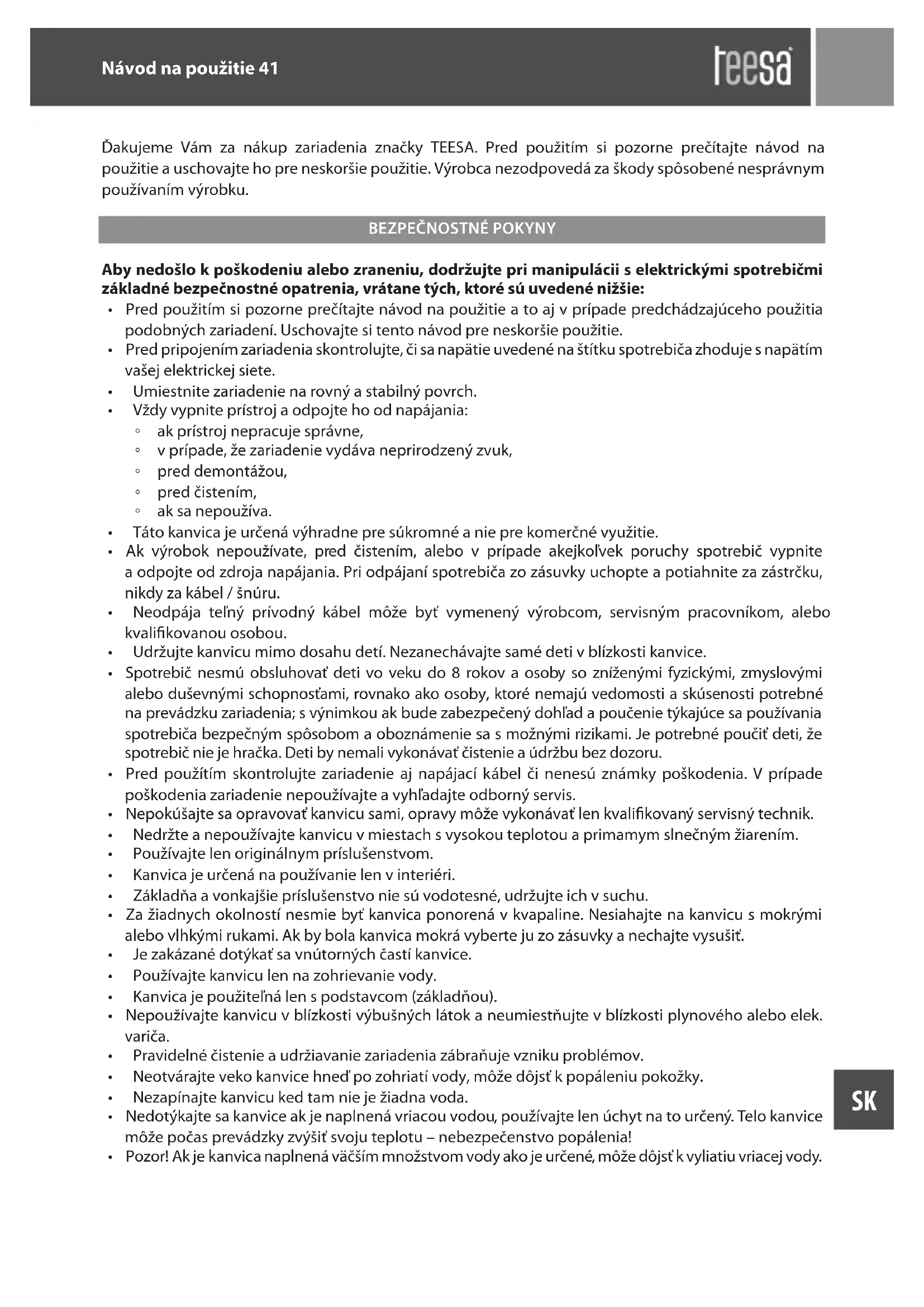 Ďakujeme Vám za nákup zariadenia značky TEESA. Pred použitím si pozorne prečítajte návod na použitie a uschovajte ho pre neskoršie použitie. Výrobca nezodpovedá za škody spôsobené nesprávnym používaním výrobku.