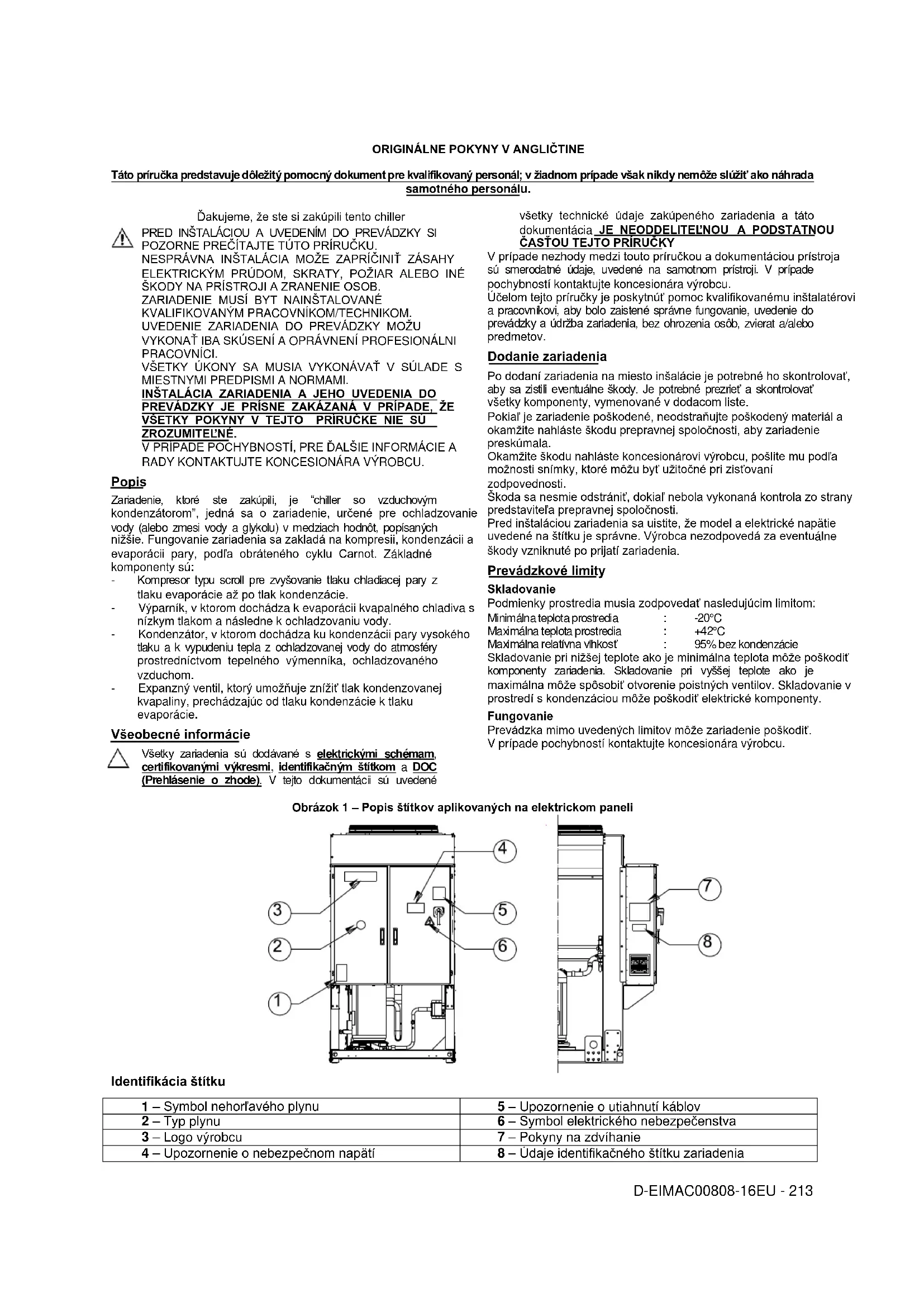 Obrázok 1 – Popis štítkov aplikovaných na elektrickom paneli Identifikácia štítku 1 – Symbol nehorľavého plynu 5 – Upozornenie o utiahnutí káblov 2 – Typ plynu 6 – Symbol elektrického nebezpečenstva 3 – Logo výrobcu 7 – Pokyny na zdvíhanie 4 – Upozornenie o nebezpečnom napätí 8 – Údaje identifikačného štítku zariadeniaD-EIMAC00808-16EU - 214