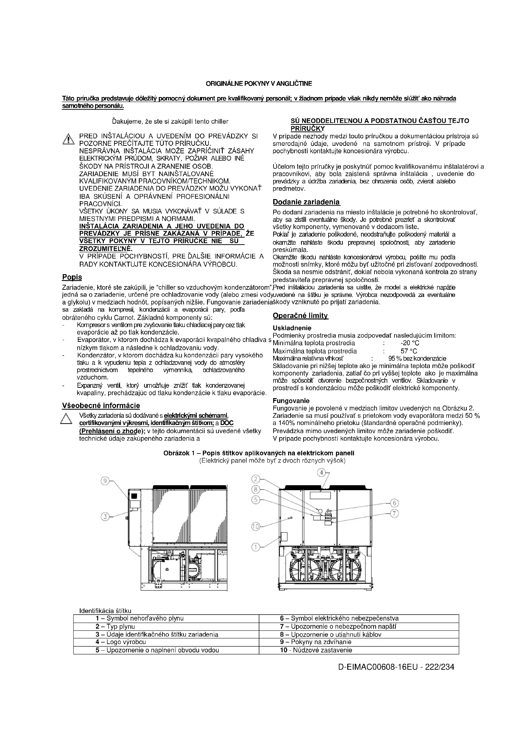 V prípade nezhody medzi touto príručkou a dokumentáciou prístroja sú smerodajné údaje, uvedené na samotnom prístroji. V prípade pochybností kontaktujte koncesionára výrobcu. Účelom tejto príručky je poskytnúť pomoc kvalifikovanému inštalatérovi a pracovníkovi, aby bola zaistená správna inštalácia , uvedenie do prevádzky a údržba zariadenia, bez ohrozenia osôb, zvierat a/alebo predmetov. Dodanie zariadenia Po dodaní zariadenia na miesto inštalácie je potrebné ho skontrolovať, aby sa zistili eventuálne škody. Je potrebné prezrieť a skontrolovať všetky komponenty, vymenované v dodacom liste. Pokiaľ je zariadenie poškodené, neodstraňujte poškodený materiál a okamžite nahláste škodu prepravnej spoločnosti, aby zariadenie preskúmala. Okamžite škodu nahláste koncesionárovi výrobcu, pošlite mu podľa možnosti snímky, ktoré môžu byť užitočné pri zisťovaní zodpovednosti. Škoda sa nesmie odstrániť, dokiaľ nebola vykonaná kontrola zo strany predstaviteľa prepravnej spoločnosti. Pred inštaláciou zariadenia sa uistite, že model a elektrické napätie uvedené na štítku je správne. Výrobca nezodpovedá za eventuálne škody vzniknuté po prijatí zariadenia. Operačné limity Uskladnenie Podmienky prostredia musia zodpovedať nasledujúcim limitom: Minimálna teplota prostredia : -20 °C Maximálna teplota prostredia : 57 °C Maximálna relatívna vlhkosť : 95 % bez kondenzácie Skladovanie pri nižšej teplote ako je minimálna teplota môže poškodiť komponenty zariadenia, zatiaľ čo pri vyššej teplote ako je maximálna môže spôsobiť otvorenie bezpečnostných ventilov. Skladovanie v prostredí s kondenzáciou môže poškodiť elektrické komponenty. Fungovanie Fungovanie je povolené v medziach limitov uvedených na Obrázku 2. Zariadenie sa musí používať s prietokom vody evaporátora medzi 50 % a 140% nominálneho prietoku (štandardné operačné podmienky). Prevádzka mimo uvedených limitov môže zariadenie poškodiť. V prípade pochybností kontaktujte koncesionára výrobcu. Obrázok 1 – Popis štítkov aplikovaných na elektrickom paneli (Elektrický panel môže byť z dvoch rôznych výšok)