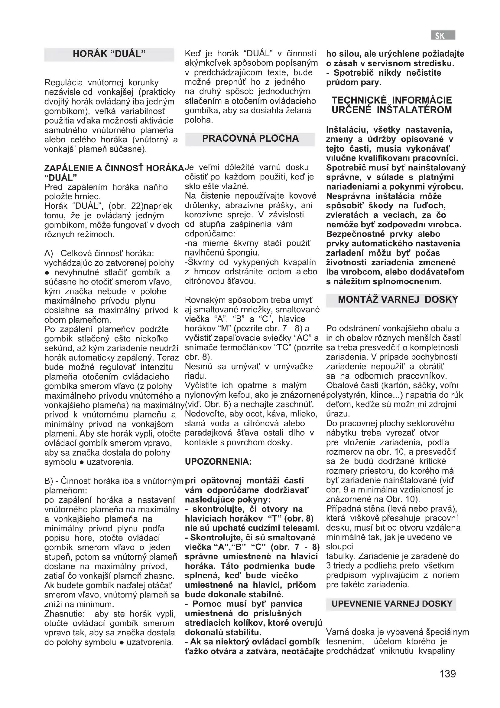 “DUÁL” Pred zapálením horáka naňho položte hrniec. Horák “DUÁL”, (obr. 22)napriek tomu, že je ovládaný jedným gombíkom, môže fungovať v dvoch rôznych režimoch. A) - Celková činnosť horáka: vychádzajúc zo zatvorenej polohy ● nevyhnutné stlačiť gombík a súčasne ho otočiť smerom vľavo, kým značka nebude v polohe maximálneho prívodu plynu dosiahne sa maximálny prívod k obom plameňom. Po zapálení plameňov podržte gombík stlačený ešte niekoľko sekúnd, až kým zariadenie neudrží horák automaticky zapálený. Teraz bude možné regulovať intenzitu plameňa otočením ovládacieho gombíka smerom vľavo (z polohy maximálneho prívodu vnútorného a vonkajšieho plameňa) na maximálny prívod k vnútornému plameňu a minimálny prívod na vonkajšom plameni. Aby ste horák vypli, otočte ovládací gombík smerom vpravo, aby sa značka dostala do polohy symbolu ● uzatvorenia. B) - Činnosť horáka iba s vnútorným plameňom: po zapálení horáka a nastavení vnútorného plameňa na maximálny a vonkajšieho plameňa na minimálny prívod plynu podľa popisu hore, otočte ovládací gombík smerom vľavo o jeden stupeň, potom sa vnútorný plameň dostane na maximálny prívod, zatiaľ čo vonkajší plameň zhasne. Ak budete gombík naďalej otáčať smerom vľavo, vnútorný plameň sa zníži na minimum. Zhasnutie: aby ste horák vypli, otočte ovládací gombík smerom vpravo tak, aby sa značka dostala do polohy symbolu ● uzatvorenia. Keď je horák “DUÁL” v činnosti akýmkoľvek spôsobom popísaným v predchádzajúcom texte, bude možné prepnúť ho z jedného na druhý spôsob jednoduchým stlačením a otočením ovládacieho gombíka, aby sa dosiahla želaná poloha. PRACOVNÁ PLOCHA Je veľmi dôležité varnú dosku očistiť po každom použití, keď je sklo ešte vlažné. Na čistenie nepoužívajte kovové drôtenky, abrazívne prášky, ani korozívne spreje. V závislosti od stupňa zašpinenia vám odporúčame: -na mierne škvrny stačí použiť navlhčenú špongiu. -Škvrny od vykypených kvapalín z hrncov odstránite octom alebo citrónovou šťavou. Rovnakým spôsobom treba umyť aj smaltované mriežky, smaltované viečka “A”, “B” a “C”, hlavice horákov “M” (pozrite obr. 7 - 8) a vyčistiť zapaľovacie sviečky “AC” a snímače termočlánkov “TC” (pozrite obr. 8). Nesmú sa umývať v umývačke riadu. Vyčistite ich opatrne s malým nylonovým kefou, ako je znázornené (viď. Obr. 6) a nechajte zaschnúť. Nedovoľte, aby ocot, káva, mlieko, slaná voda a citrónová alebo paradajková šťava ostali dlho v kontakte s povrchom dosky. UPOZORNENIA: pri opätovnej montáži častí vám odporúčame dodržiavať nasledujúce pokyny: - skontrolujte, či otvory na hlaviciach horákov “T” (obr. 8) nie sú upchaté cudzími telesami. - Skontrolujte, či sú smaltované viečka “A”,“B” “C” (obr. 7 - 8) správne umiestnené na hlavici horáka. Táto podmienka bude splnená, keď bude viečko umiestnené na hlavici, pričom bude dokonale stabilné. - Pomoc musí byť panvica umiestnená do príslušných strediacich kolíkov, ktoré overujú dokonalú stabilitu. - Ak sa niektorý ovládací gombík ťažko otvára a zatvára, neotáčajte ho silou, ale urýchlene požiadajte o zásah v servisnom stredisku. - Spotrebič nikdy nečistite prúdom pary.