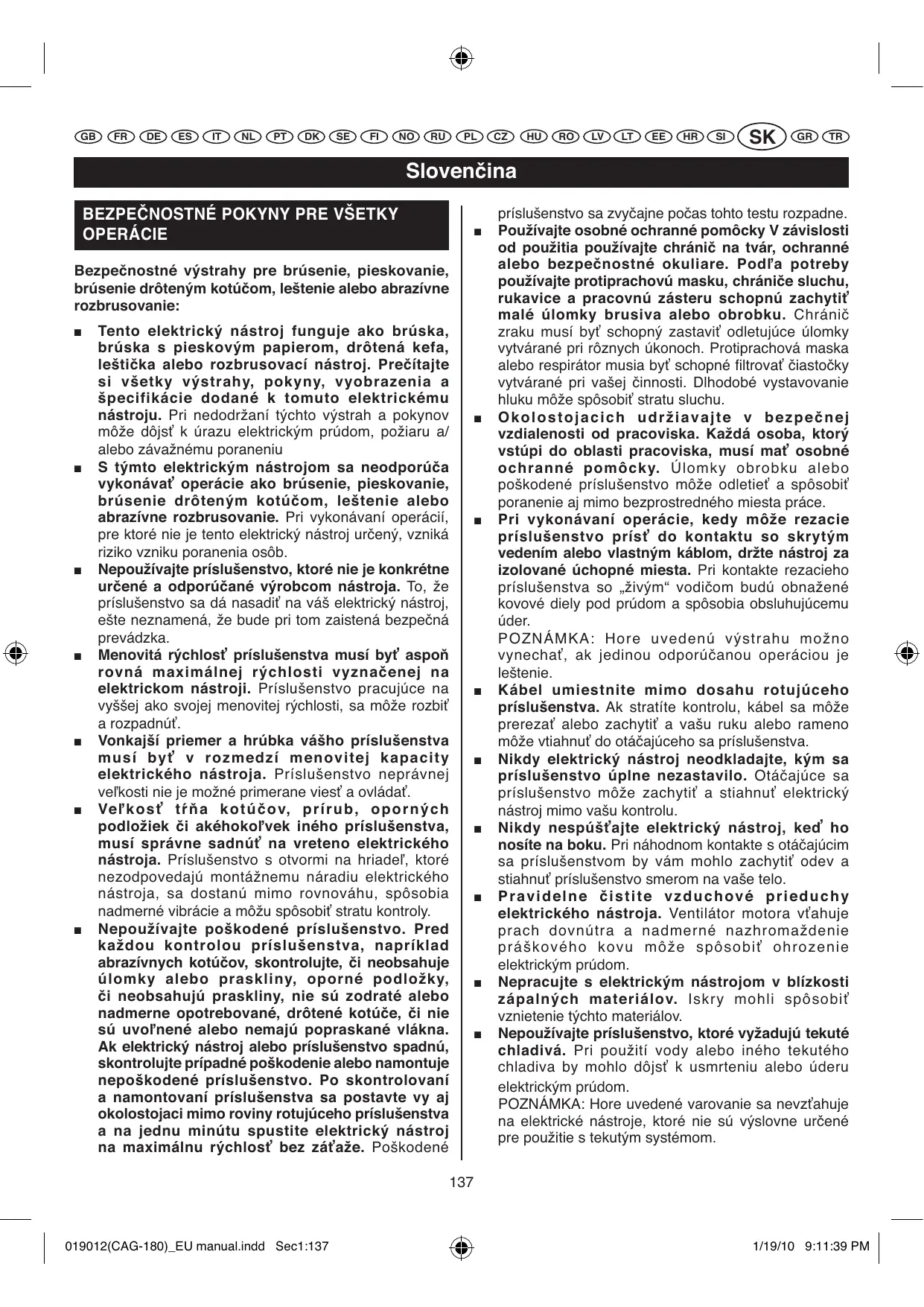 Tento elektricky nastroj funguje ako bruska, bruska s pieskovym papierom, drōtena kefa, leščka alebo Rozbrusovaci nastroj. Precitajte si větky výstrahy, pokyny, vyobrazenia a špecifikácie dodané k tomuto elektrickému nastroju. Pri nedodžani tychto výstrah a pokynov moze dojst' k urazu elektrickým prudom, požiaru a/ alebo závažnému poraneniu