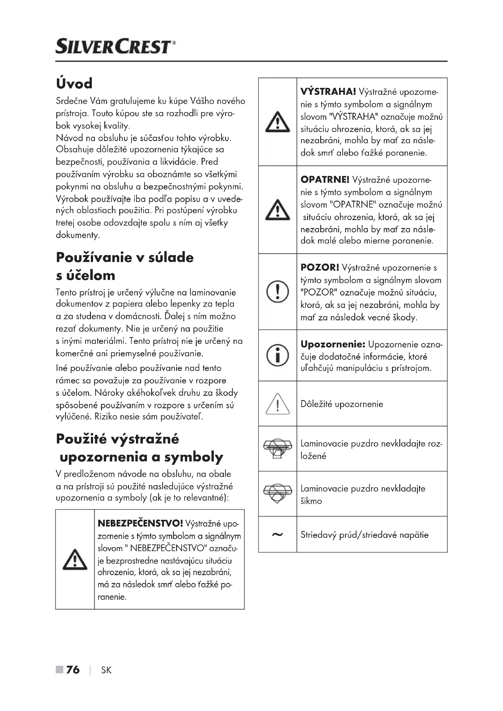 SK Úvod Srdečne Vám gratulujeme ku kúpe Vášho nového prístroja. Touto kúpou ste sa rozhodli pre výro- bok vysokej kvality. Návod naobsluhu je súčasťou tohto výrobku. Obsahuje dôležité upozornenia týkajúce sa bezpečnosti, používania a likvidácie. Pred používaním výrobku sa oboznámte sovšetkými pokynmi na obsluhu abezpečnostnými pokynmi. Výrobok používajte iba podľa popisu a vuvede- ných oblastiach použitia. Pri postúpení výrobku tretej osobe odovzdajte spolu sním aj všetky dokumenty. Používanie v súlade s účelom Tento prístroj je určený výlučne na laminovanie dokumentov z papiera alebo lepenky za tepla aza studena vdomácnosti. Ďalej s ním možno rezať dokumenty. Nie je určený na použitie sinými materiálmi. Tento prístroj nie je určený na komerčné ani priemyselné používanie. Iné používanie alebo používanie nad tento rámec sapovažuje zapoužívanie v rozpore súčelom. Nároky akéhokoľvek druhu za škody spôsobené používaním v rozpore s určením sú vylúčené. Riziko nesie sám používateľ. Použité výstražné upozornenia a symboly Vpredloženom návode na obsluhu, na obale a na prístroji sú použité nasledujúce výstražné upozornenia a symboly (ak je to relevantné): NEBEZPEČENSTVO! Výstražné upo- zornenie s týmto symbolom a signálnym slovom " NEBEZPEČENSTVO" označu- je bezprostredne nastávajúcu situáciu ohrozenia, ktorá, ak sa jej nezabráni, má za následok smrť alebo ťažké po- ranenie. VÝSTRAHA! Výstražné upozorne- nie s týmto symbolom a signálnym slovom "VÝSTRAHA" označuje možnú situáciu ohrozenia, ktorá, ak sa jej nezabráni, mohla by mať za násle- dok smrť alebo ťažké poranenie. OPATRNE! Výstražné upozorne- nie s týmto symbolom a signálnym slovom "OPATRNE" označuje možnú situáciu ohrozenia, ktorá, ak sa jej nezabráni, mohla by mať za násle- dok malé alebo mierne poranenie. POZOR! Výstražné upozornenie s týmto symbolom a signálnym slovom "POZOR" označuje možnú situáciu, ktorá, ak sa jej nezabráni, mohla by mať za následok vecné škody. Upozornenie: Upozornenie ozna- čuje dodatočné informácie, ktoré uľahčujú manipuláciu s prístrojom. Dôležité upozornenie Laminovacie puzdro nevkladajte roz- ložené Laminovacie puzdro nevkladajte šikmo