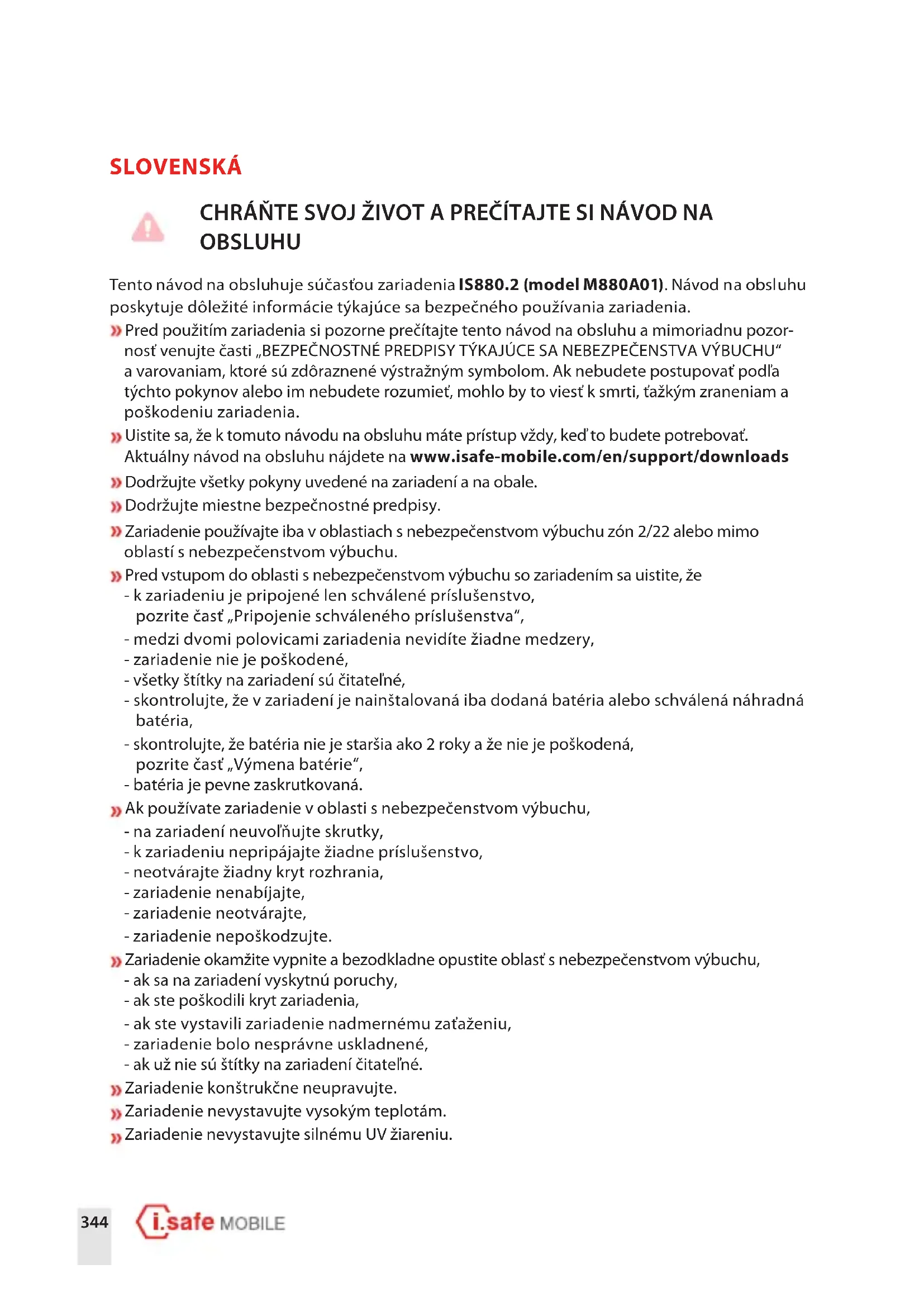 i.safeMOBILEGmbH i i.safeMOBILEGmbH logotip registrirani su zaštitni znaci tvrtke i.safeMOBILEGmbH. Dolazi s Google™ aplikacijom i s Google Chrome™. Google i Google Chrome zaštitni su znaci tvrtke Google LLC. Naziv Android zaštitni je znak Google LLC-a. Svi drugi zaštitni znaci i sva druga autorska prava vlasništvo su njihovih vlasnika.344 SLOVENSKÁ CHRÁŇTE SVOJ ŽIVOT A PREČÍTAJTE SI NÁVOD NA OBSLUHU Tento návod na obsluhuje súčasťou zariadenia IS880.2 (model M880A01). Návod na obsluhu poskytuje dôležité informácie týkajúce sa bezpečného používania zariadenia. Pred použitím zariadenia si pozorne prečítajte tento návod na obsluhu a mimoriadnu pozor- nosť venujte časti „BEZPEČNOSTNÉ PREDPISY TÝKAJÚCE SA NEBEZPEČENSTVA VÝBUCHU“ a varovaniam, ktoré sú zdôraznené výstražným symbolom. Ak nebudete postupovať podľa týchto pokynov alebo im nebudete rozumieť, mohlo by to viesť k smrti, ťažkým zraneniam a poškodeniu zariadenia. Uistite sa, že k tomuto návodu na obsluhu máte prístup vždy, keď to budete potrebovať. Aktuálny návod na obsluhu nájdete na www.isafe-mobile.com/en/support/downloads Dodržujte všetky pokyny uvedené na zariadení a na obale. Dodržujte miestne bezpečnostné predpisy. Zariadenie používajte iba v oblastiach s nebezpečenstvom výbuchu zón 2/22 alebo mimo oblastí s nebezpečenstvom výbuchu. Pred vstupom do oblasti s nebezpečenstvom výbuchu so zariadením sa uistite, že - k zariadeniu je pripojené len schválené príslušenstvo, pozrite časť „Pripojenie schváleného príslušenstva“, - medzi dvomi polovicami zariadenia nevidíte žiadne medzery, - zariadenie nie je poškodené, - všetky štítky na zariadení sú čitateľné, - skontrolujte, že v zariadení je nainštalovaná iba dodaná batéria alebo schválená náhradná batéria, - skontrolujte, že batéria nie je staršia ako 2 roky a že nie je poškodená, pozrite časť „Výmena batérie“, - batéria je pevne zaskrutkovaná. Ak používate zariadenie v oblasti s nebezpečenstvom výbuchu, - na zariadení neuvoľňujte skrutky, - k zariadeniu nepripájajte žiadne príslušenstvo, - neotvárajte žiadny kryt rozhrania, - zariadenie nenabíjajte, - zariadenie neotvárajte, - zariadenie nepoškodzujte. Zariadenie okamžite vypnite a bezodkladne opustite oblasť s nebezpečenstvom výbuchu, - ak sa na zariadení vyskytnú poruchy, - ak ste poškodili kryt zariadenia, - ak ste vystavili zariadenie nadmernému zaťaženiu, - zariadenie bolo nesprávne uskladnené, - ak už nie sú štítky na zariadení čitateľné. Zariadenie konštrukčne neupravujte. Zariadenie nevystavujte vysokým teplotám. Zariadenie nevystavujte silnému UV žiareniu.SK