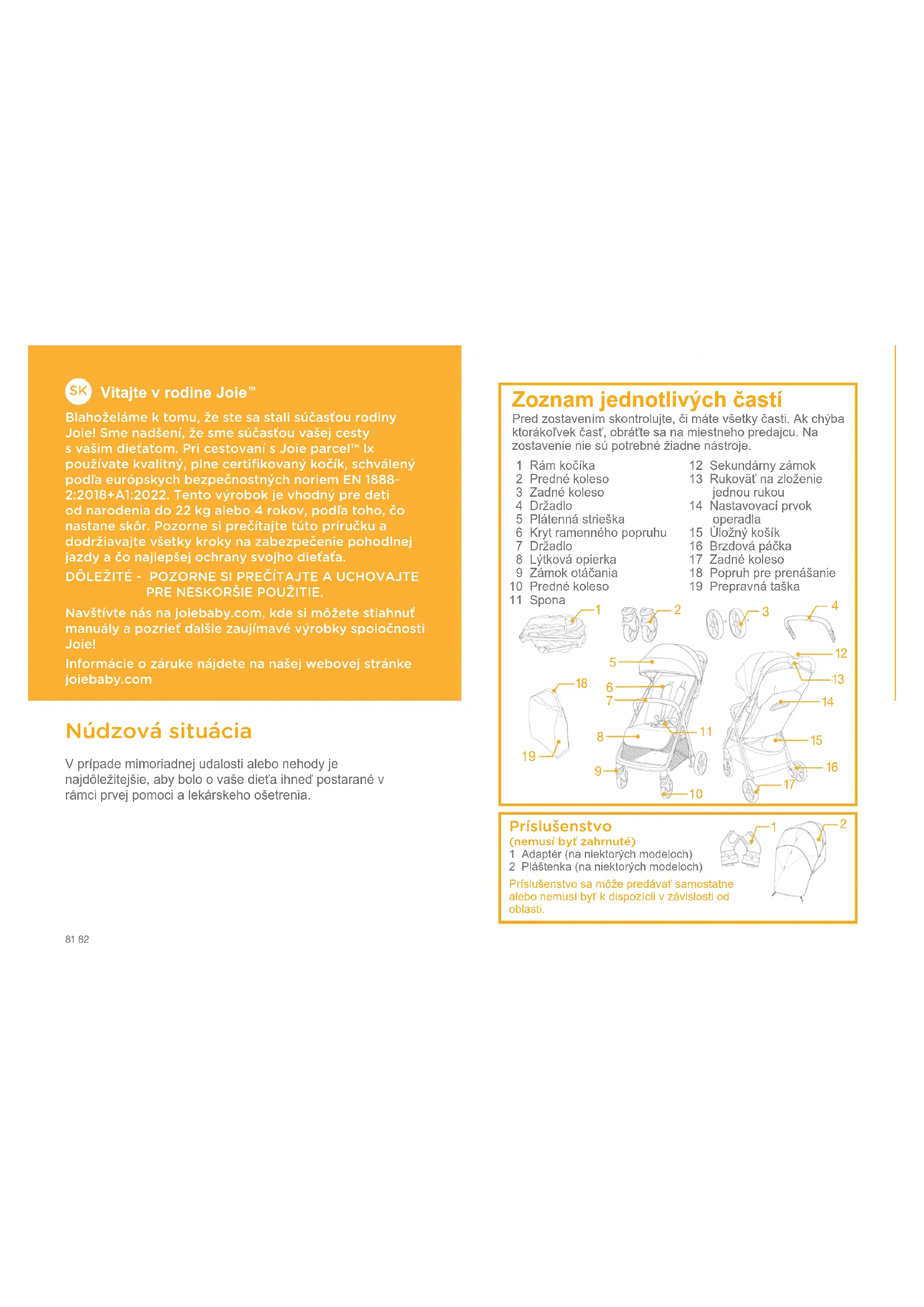 Blahoželáme k tomu, že ste sa stali súčasťou rodiny Joie! Sme nadšení, že sme súčasťou vašej cesty s vašim dieťaťom. Pri cestovaní s Joie parcel™ lx používate kvalitný, plne certifikovaný kočík, schválený podľa európskych bezpečnostných noriem EN 1888-2:2018+A1:2022. Tento výrobok je vhodný pre deti od narodenia do 22 kg alebo 4 rokov, podľa toho, čo nastane skôr. Pozorne si prečítajte túto príručku a dodržiavajte všetky kroky na zabezpečenie pohodlnej jazdy a čo najlepšej ochrany svojho dieťaťa.DÔLEŽITÉ - POZORNE SI PREČÍTAJTE A UCHOVAJTE PRE NESKORŠIE POUŽITIE.Navštívte nás na joiebaby.com, kde si môžete stiahnuť manuály a pozrieť ďalšie zaujímavé výrobky spoločnosti Joie!Informácie o záruke nájdete na našej webovej stránke joiebaby.com 1 Rám kočíka 2 Predné koleso 3 Zadné koleso 4 Držadlo 5 Plátenná strieška 6 Kryt ramenného popruhu 7 Držadlo 8 Lýtková opierka 9 Zámok otáčania10 Predné koleso11 Spona12 Sekundárny zámok13 Rukoväť na zloženie jednou rukou14 Nastavovací prvok operadla15 Úložný košík16 Brzdová páčka17 Zadné koleso18 Popruh pre prenášanie19 Prepravná taška Príslušenstvo (nemusí byť zahrnuté)1 Adaptér (na niektorých modeloch)2 Pláštenka (na niektorých modeloch)Príslušenstvo sa môže predávať samostatne alebo nemusí byť k dispozícii v závislosti od oblasti. Zoznam jednotlivých častí Pred zostavením skontrolujte, či máte všetky časti. Ak chýba ktorákoľvek časť, obráťte sa na miestneho predajcu. Na zostavenie nie sú potrebné žiadne nástroje.