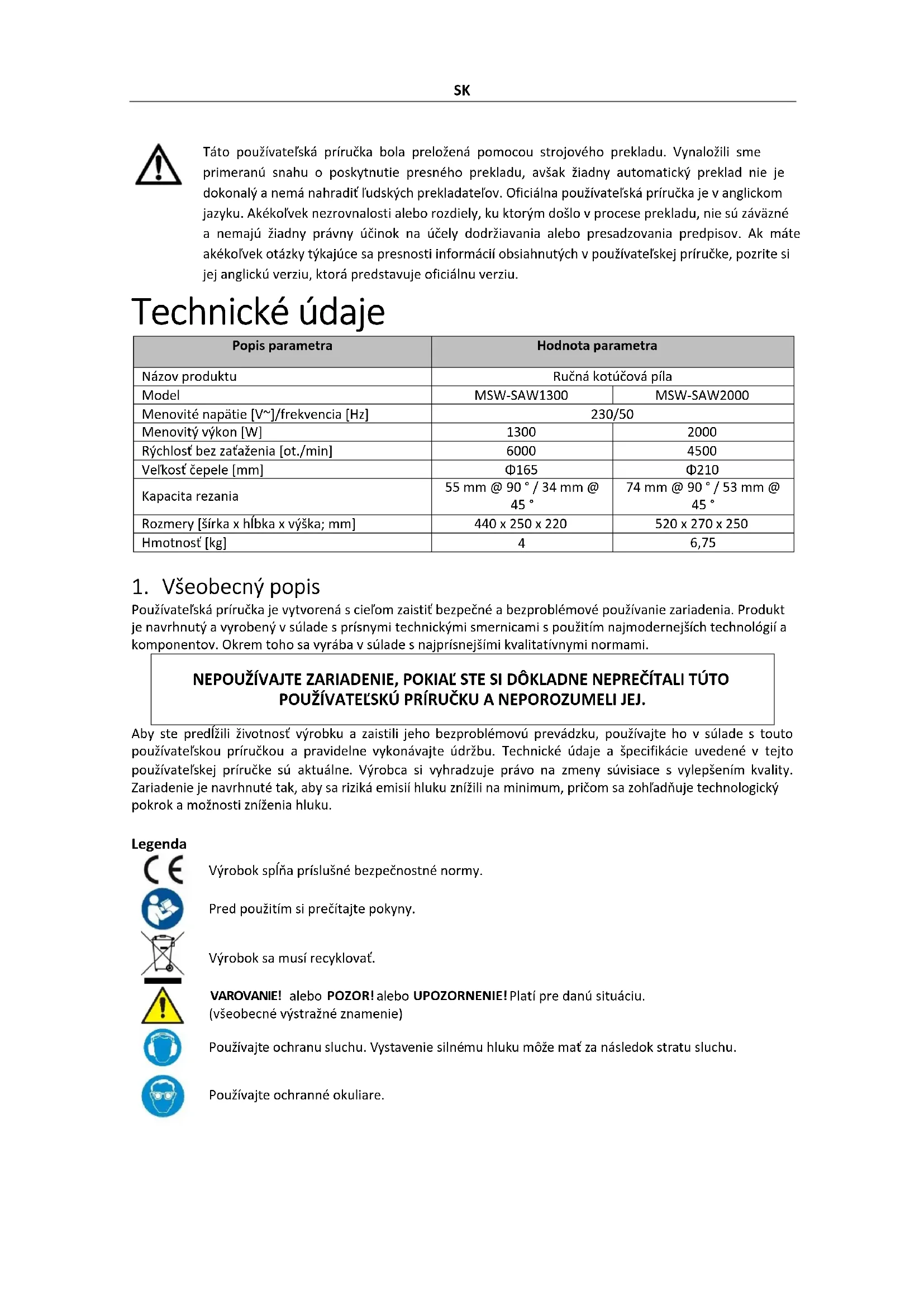 Používateľská príručka je vytvorená s cieľom zaistiť bezpečné a bezproblémové používanie zariadenia. Produkt je navrhnutý a vyrobený v súlade s prísnymi technickými smernicami s použitím najmodernejších technológií a komponentov. Okrem toho sa vyrába v súlade s najprísnejšími kvalitatívnymi normami. NEPOUŽÍVAJTE ZARIADENIE, POKIAĽ STE SI DÔKLADNE NEPREČÍTALI TÚTO POUŽÍVATEĽSKÚ PRÍRUČKU A NEPOROZUMELI JEJ. Aby ste predĺžili životnosť výrobku a zaistili jeho bezproblémovú prevádzku, používajte ho v súlade s touto používateľskou príručkou a pravidelne vykonávajte údržbu. Technické údaje a špecifikácie uvedené v tejto používateľskej príručke sú aktuálne. Výrobca si vyhradzuje právo na zmeny súvisiace s vylepšením kvality. Zariadenie je navrhnuté tak, aby sa riziká emisií hluku znížili na minimum, pričom sa zohľadňuje technologický pokrok a možnosti zníženia hluku. Legenda