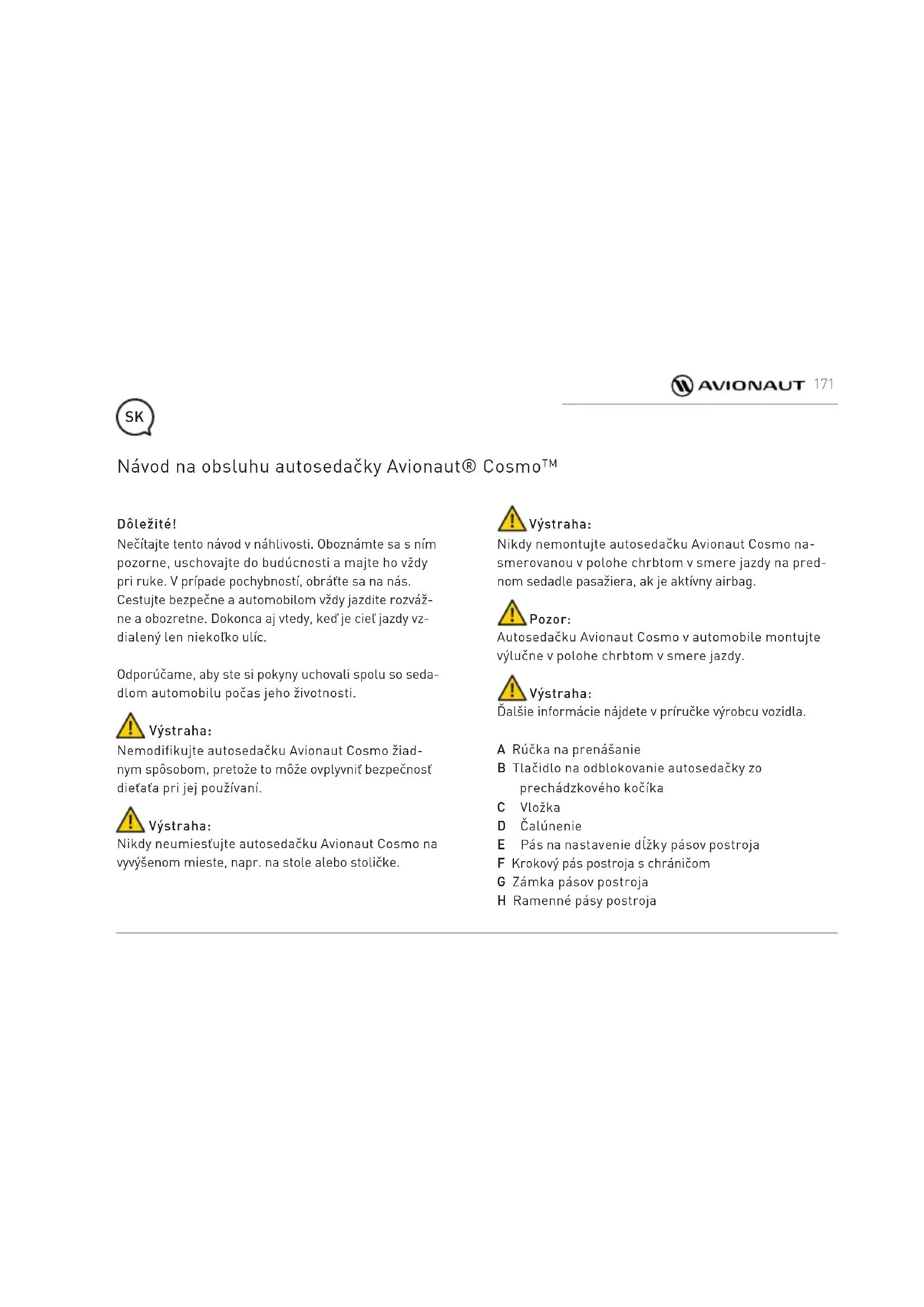 - Denna garanti har utarbetats av Ł.KARWALA som är registrerat i Polen. 169Företagets adress är: Szarlejka, ul. Lukaszewicza 172 42-130 Wreczyca Wielka, Polska (1) Köpta produkter med borttagna eller ändrade etiketter eller identifikationsnummer anses vara icke godkända. På grund av att äktheten hos sådana produkter inte kan fastställas gäller garantin inte dem. 170Dôležité! Nečítajte tento návod v náhlivosti. Oboznámte sa s ním pozorne, uschovajte do budúcnosti a majte ho vždy pri ruke. V prípade pochybností, obráťte sa na nás. Cestujte bezpečne a automobilom vždy jazdite rozváž- ne a obozretne. Dokonca aj vtedy, keď je cieľ jazdy vz- dialený len niekoľko ulíc. Odporúčame, aby ste si pokyny uchovali spolu so seda- dlom automobilu počas jeho životnosti. Výstraha: Nemodifikujte autosedačku Avionaut Cosmo žiad- nym spôsobom, pretože to môže ovplyvniť bezpečnosť dieťaťa pri jej používaní. Výstraha: Nikdy neumiesťujte autosedačku Avionaut Cosmo na vyvýšenom mieste, napr. na stole alebo stoličke. Návod na obsluhu autosedačky Avionaut® Cosmo™ Výstraha: Nikdy nemontujte autosedačku Avionaut Cosmo na- smerovanou v polohe chrbtom v smere jazdy na pred- nom sedadle pasažiera, ak je aktívny airbag. Pozor: Autosedačku Avionaut Cosmo v automobile montujte výlučne v polohe chrbtom v smere jazdy. Výstraha: Ďalšie informácie nájdete v príručke výrobcu vozidla. A Rúčka na prenášanie B Tlačidlo na odblokovanie autosedačky zo prechádzkového kočíka C Vložka D Čalúnenie E Pás na nastavenie dĺžky pásov postroja F Krokový pás postroja s chráničom G Zámka pásov postroja H Ramenné pásy postroja