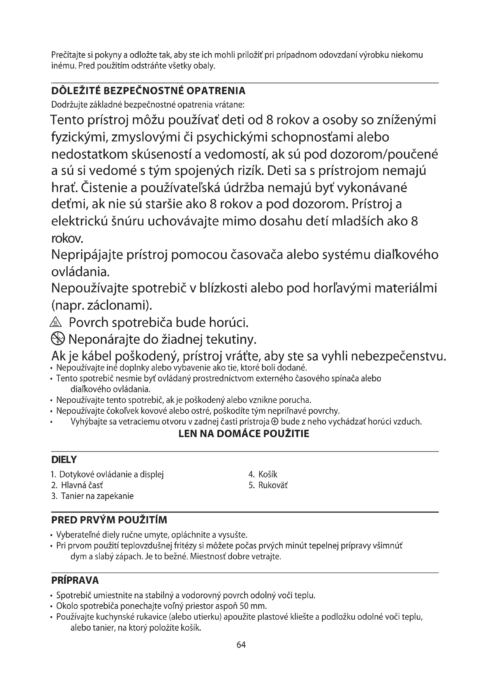 - Pri prvom použití teplovzdušnej fritézy si môžete počas prvých minút tepelnej prípravy všimnúť dym a slabý zápach. Je to bežné. Miestnosť dobre vetrajte. PRÍPRAVA