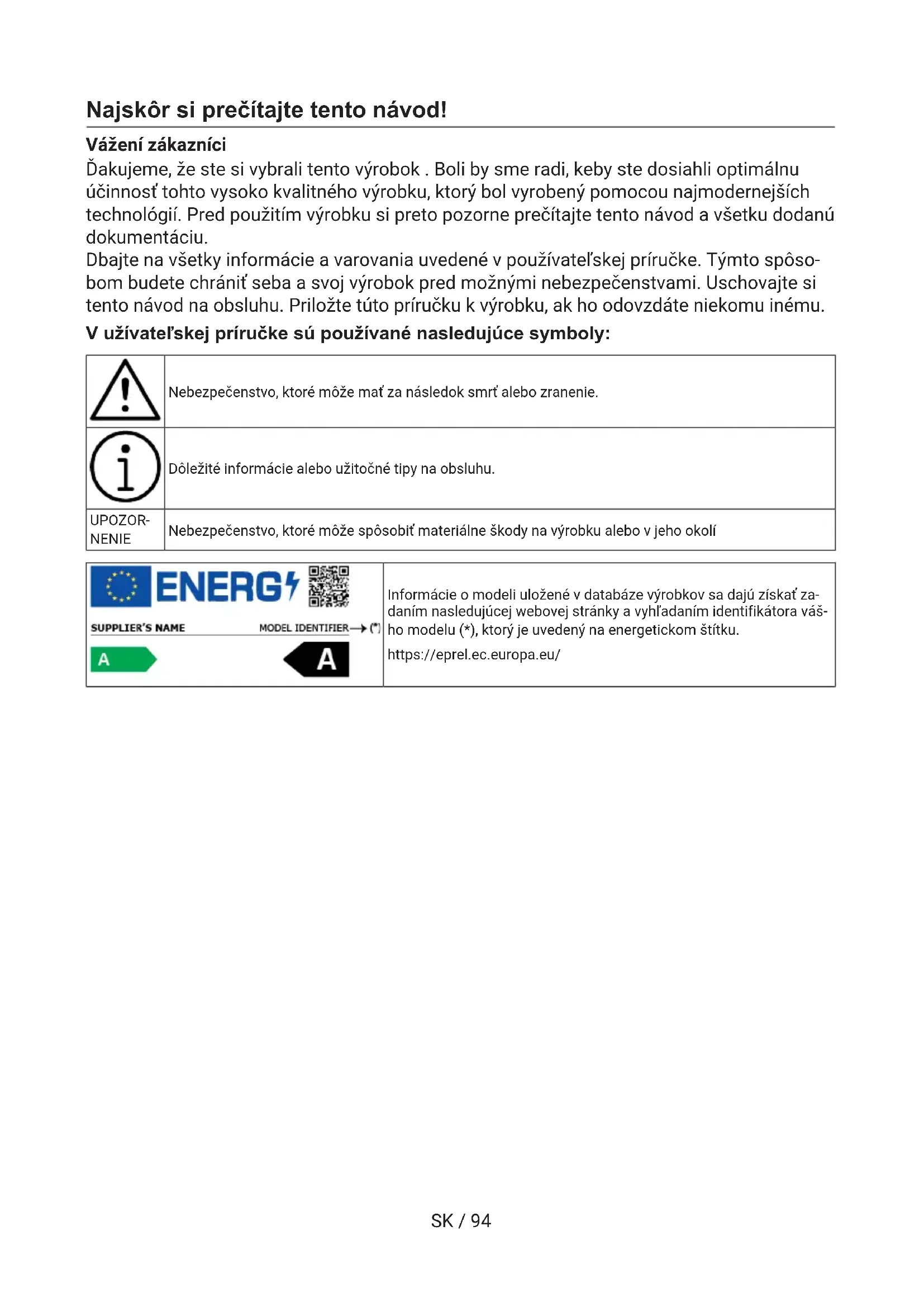 SKSK / 94 Najskôr si prečítajte tento návod! Vážení zákazníci Ďakujeme, že ste si vybrali tento výrobok . Boli by sme radi, keby ste dosiahli optimálnu účinnosť tohto vysoko kvalitného výrobku, ktorý bol vyrobený pomocou najmodernejších technológií. Pred použitím výrobku si preto pozorne prečítajte tento návod a všetku dodanú dokumentáciu. Dbajte na všetky informácie a varovania uvedené v používateľskej príručke. Týmto spôso- bom budete chrániť seba a svoj výrobok pred možnými nebezpečenstvami. Uschovajte si tento návod na obsluhu. Priložte túto príručku k výrobku, ak ho odovzdáte niekomu inému. V užívateľskej príručke sú používané nasledujúce symboly: Nebezpečenstvo, ktoré môže mať za následok smrť alebo zranenie. Dôležité informácie alebo užitočné tipy na obsluhu. UPOZOR- NENIE Nebezpečenstvo, ktoré môže spôsobiť materiálne škody na výrobku alebo v jeho okolí Informácie o modeli uložené v databáze výrobkov sa dajú získať za- daním nasledujúcej webovej stránky a vyhľadaním identifikátora váš- ho modelu (*), ktorý je uvedený na energetickom štítku. https://eprel.ec.europa.eu/SK / 95 1 Bezpečnostné pokyny