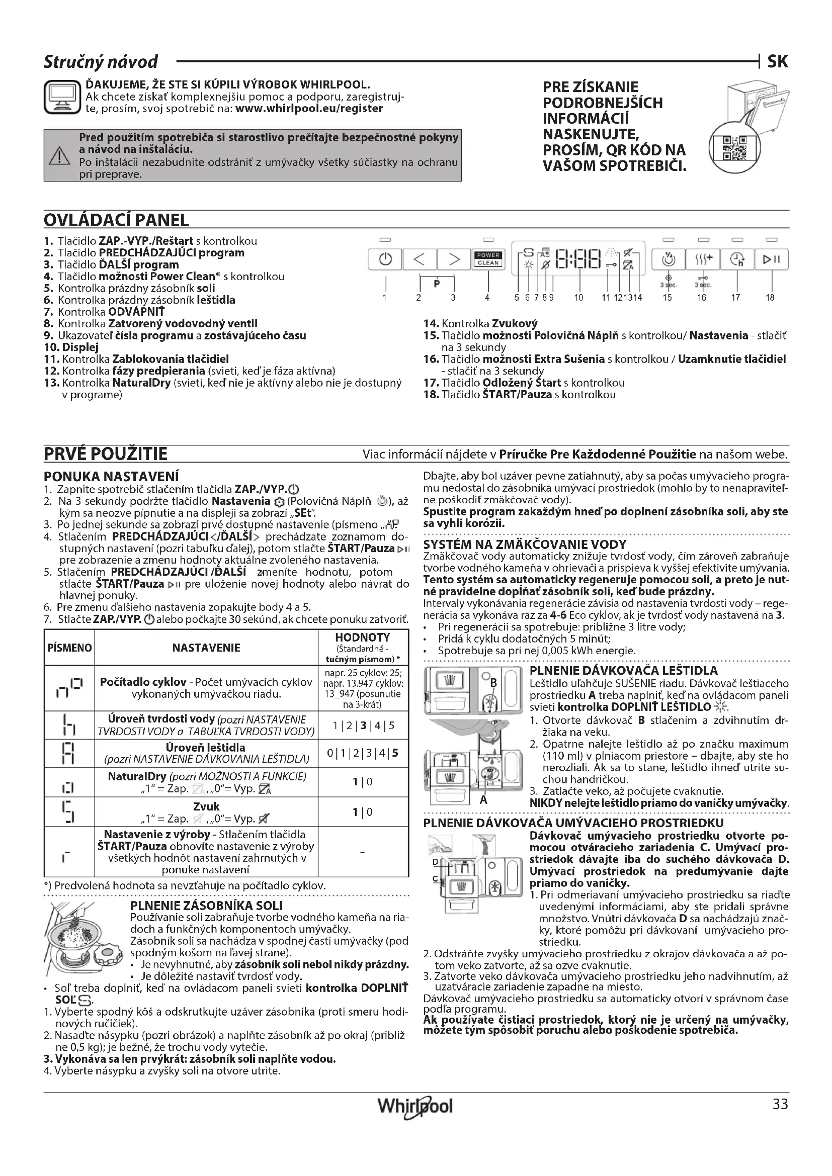 1:15 11,0 1,10 ODVÁPNIŤ - Upozornenie - Bolo zistené nahromadenie vodného ka- meňa na vnútorných komponentoch spotrebiča. Skontrolujte, či máte v Nastaveniach Tvrdosti Vody správnu hodnotu a v zásobníku soli soľ (pozri PRVÉ POUŽITIE), potom použite odvápňovací prostriedok (odporú- ča sa značka WPro) s programom Autočistenie. Po úspešnom odvápnení sa ikonka už nebude zobrazovať. Ak sa vyššie uvedené činnosti nevykonajú, výkon spotrebiča sa zhorší. Upozornenie ODVÁPNIŤ začne blikať a na displeji sa zobrazí „dES“. Ak sa činnosť napriek tomu nevykoná, spotrebič dovolí spustiť iba určitý počet cyklov (zobrazený pri upozornení „dES“ na displeji) a potom sa ZABLOKUJE, aby zabránil poškodeniu komponentu, a bude k dispozícii iba program Autočistenie. Vykonanie odvápnenia spotrebič odblokuje. V prípade mi- moriadne veľkého množstva vodného kameňa možno odvápnenie vykonať dva razy, aby bolo účinné. POWER CLEAN® - Vďaka prídavným výkonným dýzam táto funkcia umožňuje intenzívnejšie aúčinnejšie umývanie vspodnom koši, všpecickej oblastia. Táto možnosť sa používa na umývanie hrncov akastró- lov (Pozri časť Power Clean® naplnenie). POLOVIČNÁ NÁPLŇ - Ak máte na umývanie málo riadov, používa sa polovičná náplň pre úsporu vody, elektriny alebo času v závislosti od zvoleného programu. Nezabudnite znížiť množstvo umývacieho prostriedku. EXTRA SUŠENIE - Vyššia teplota počas záverečného oplachovania a predĺžená fáza sušenia umožňuje lepšie sušenie. Možnosť EXTRA SU- ŠENIE predĺži cyklus umývania. ODLOŽENÝ ŠTART-Začiatok programu možno posunúť o 30 minút až 24 hodín.Po spustení programu už funkciu posunutia štartu ne- možno nastaviť. ZATVORENÝ VODOVODNÝ VENTIL – Upozornenie - Bliká v prípade žiadneho prítoku vody alebo zatvoreného vodovodného ventilu. NaturalDry - je konvekčný systém sušenia, ktorý automaticky otvorí dvier- ka počas/po fáze sušenia, čím zaistí výnimočný výsledok sušenia každý deň. Dvierka sa otvárajú pri teplote, ktorá neohrozí váš kuchynský nábytok, preto sa neotvoria. Ako doplnková ochrana pred parou bola k umývačke priložená špeciálne navrhnutá ochranná fólia. SNÍMANIE - Keď senzor zisťuje úroveň znečistenia, na displeji sa zobrazí animácia (asi 20 minút) a trvanie cyklu sa aktualizuje. Snímanie je pre úroveň znečistenia riadu a je pri všetkých cyk- loch (okrem Eko) a príslušne upraví progra. MOŽNOSTI možno zvoliť/zrušiť po zvolení programu priamo stlačením príslušného tlačidla (ak sú dostupné, rozsvieti sa kontrolka) (pozri OVLÁ- DACÍ PANEL). Ak možnosť nie je kompatibilná so zvoleným programom (pozri TABUĽKU PROGRAMOV), 3 razy rýchlo zabliká príslušná LED kontrolka a ozve sa pípanie. Možnosť sa neaktivuje. Voliteľnou možnosťou možno zmeniť čas alebo spotrebu vody alebo energie pre program.