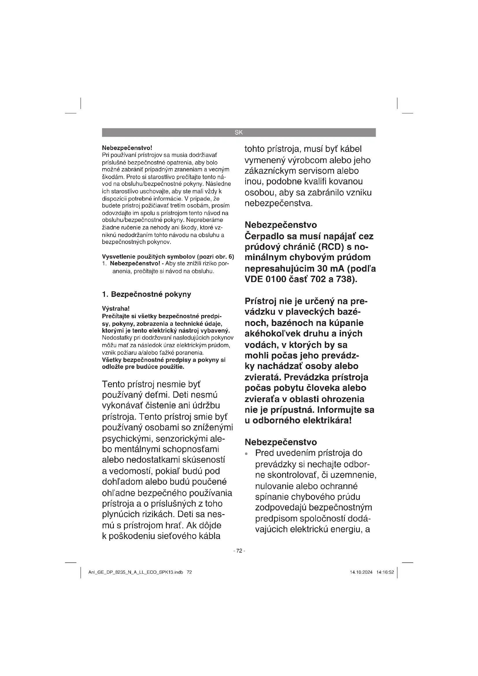 Výstraha! Prečítajte si všetky bezpečnostné predpi- sy, pokyny, zobrazenia a technické údaje, ktorými je tento elektrický nástroj vybavený. Nedostatky pri dodržovaní nasledujúcich pokynov môžu mať za následok úraz elektrickým prúdom, vznik požiaru a/alebo ťažké poranenia. Všetky bezpečnostné predpisy a pokyny si odložte pre budúce použitie. Tento prístroj nesmie byť používaný deťmi. Deti nesmú vykonávať čistenie ani údržbu prístroja. Tento prístroj smie byť používaný osobami so zníženými psychickými, senzorickými ale- bo mentálnymi schopnosťami alebo nedostatkami skúseností a vedomostí, pokiaľ budú pod dohľadom alebo budú poučené ohľadne bezpečného používania prístroja a o príslušných z toho plynúcich rizikách. Deti sa nes- mú s prístrojom hrať. Ak dôjde k poškodeniu sieťového kábla tohto prístroja, musí byť kábel vymenený výrobcom alebo jeho zákazníckym servisom alebo inou, podobne kvalifi kovanou osobou, aby sa zabránilo vzniku nebezpečenstva. Nebezpečenstvo Čerpadlo sa musí napájať cez prúdový chránič (RCD) s no- minálnym chybovým prúdom nepresahujúcim 30 mA (podľa VDE 0100 časť 702 a 738). Prístroj nie je určený na pre- vádzku v plaveckých bazé- noch, bazénoch na kúpanie akéhokoľvek druhu a iných vodách, v ktorých by sa mohli počas jeho prevádz- ky nachádzať osoby alebo zvieratá. Prevádzka prístroja počas pobytu človeka alebo zvieraťa v oblasti ohrozenia nie je prípustná. Informujte sa u odborného elektrikára! Nebezpečenstvo