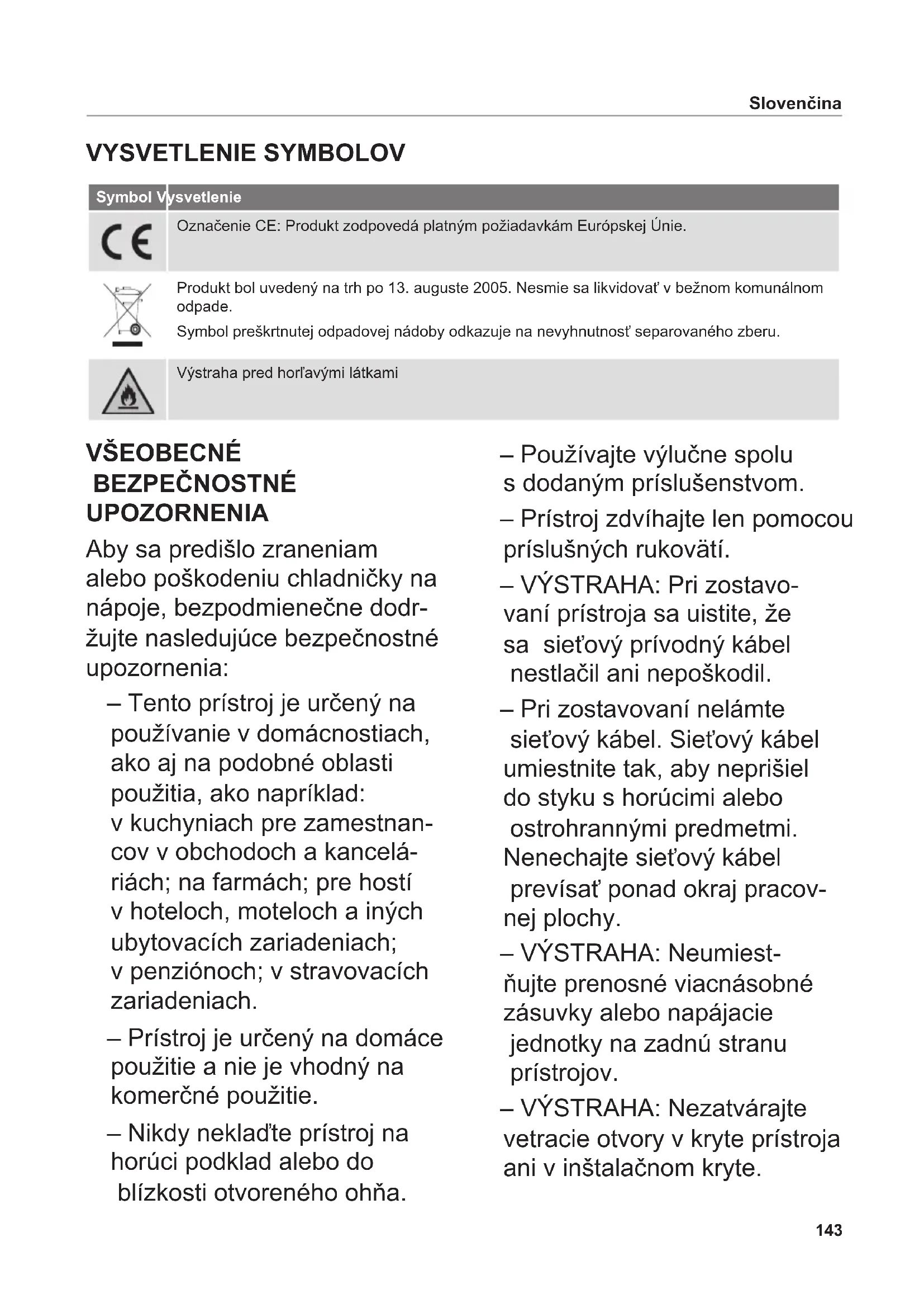 Дверцу следует открывать только на короткое время, чтобы поло- жить бутылку, иначе температура в холодильной камере повысится. Русский143 Slovenčina VYSVETLENIE SYMBOLOV Symbol Vysvetlenie Označenie CE: Produkt zodpovedá platným požiadavkám Európskej Únie. Produkt bol uvedený na trh po 13. auguste 2005. Nesmie sa likvidovať v bežnom komunálnom odpade. Symbol preškrtnutej odpadovej nádoby odkazuje na nevyhnutnosť separovaného zberu. Výstraha pred horľavými látkami VŠEOBECNÉ BEZPEČNOSTNÉ UPOZORNENIA Aby sa predišlo zraneniam alebo poškodeniu chladničky na nápoje, bezpodmienečne dodr- žujte nasledujúce bezpečnostné upozornenia: – Tento prístroj je určený na používanie v domácnostiach, ako aj na podobné oblasti použitia, ako napríklad: v kuchyniach pre zamestnan- cov v obchodoch a kancelá- riách; na farmách; pre hostí v hoteloch, moteloch a iných ubytovacích zariadeniach; v penziónoch; v stravovacích zariadeniach. – Prístroj je určený na domáce použitie a nie je vhodný na komerčné použitie. – Nikdy neklaďte prístroj na horúci podklad alebo do blízkosti otvoreného ohňa. – Používajte výlučne spolu s dodaným príslušenstvom. – Prístroj zdvíhajte len pomocou príslušných rukovätí. – VÝSTRAHA: Pri zostavo- vaní prístroja sa uistite, že sa sieťový prívodný kábel nestlačil ani nepoškodil. – Pri zostavovaní nelámte sieťový kábel. Sieťový kábel umiestnite tak, aby neprišiel do styku s horúcimi alebo ostrohrannými predmetmi. Nenechajte sieťový kábel prevísať ponad okraj pracov- nej plochy. – VÝSTRAHA: Neumiest- ňujte prenosné viacnásobné zásuvky alebo napájacie jednotky na zadnú stranu prístrojov. – VÝSTRAHA: Nezatvárajte vetracie otvory v kryte prístroja ani v inštalačnom kryte.144 – Pri inštalácii prístroja dodržia- vajte dostatočnú vzdialenosť približne 5 cm od okolitých stien či iných ohraničení. – S prístrojom pracujte až po jeho bezpečnom zostavení. Po preprave sa musí prístroj ponechať bez pohybu na jednom mieste najmenej 12 hodín, až potom sa môže uviesť do prevádzky. – Nikdy neprepravujte prístroj vo vodorovnej polohe! Prístroj musí byť stále vo zvislej polohe, aj keď nie je v pre- vádzke, pretože inak môže dôjsť k poškodeniu chladia- ceho okruhu. – Nikdy neotvárajte spodnú časť prístroja, v ktorej sa nachádza chladiaci okruh. – Tento prístroj môžu používať deti od 8 rokov, ako aj osoby so zníženými fyzickými, zmyslovými alebo duševnými schopnosťami, alebo s nedo- statočnými skúsenosťami a/ alebo vedomosťami, keď sú pod dozorom, alebo boli poučené ohľadne bezpečného používania tohto prístroja a rozumejú nebezpečenstvám, ktoré z toho vyplývajú. – Deti sa nesmú hrať s týmto prístrojom. – Deti vo veku od 3 do 8 rokov smú plniť a vykladať prístroj, ale musia byť mimo dosahu prívodného kábla. – Čistenie a používateľskú údržbu nesmú vykonávať deti, okrem prípadu, že sú staršie ako 8 rokov a sú pod dohľadom. – Prístroj BEEZER