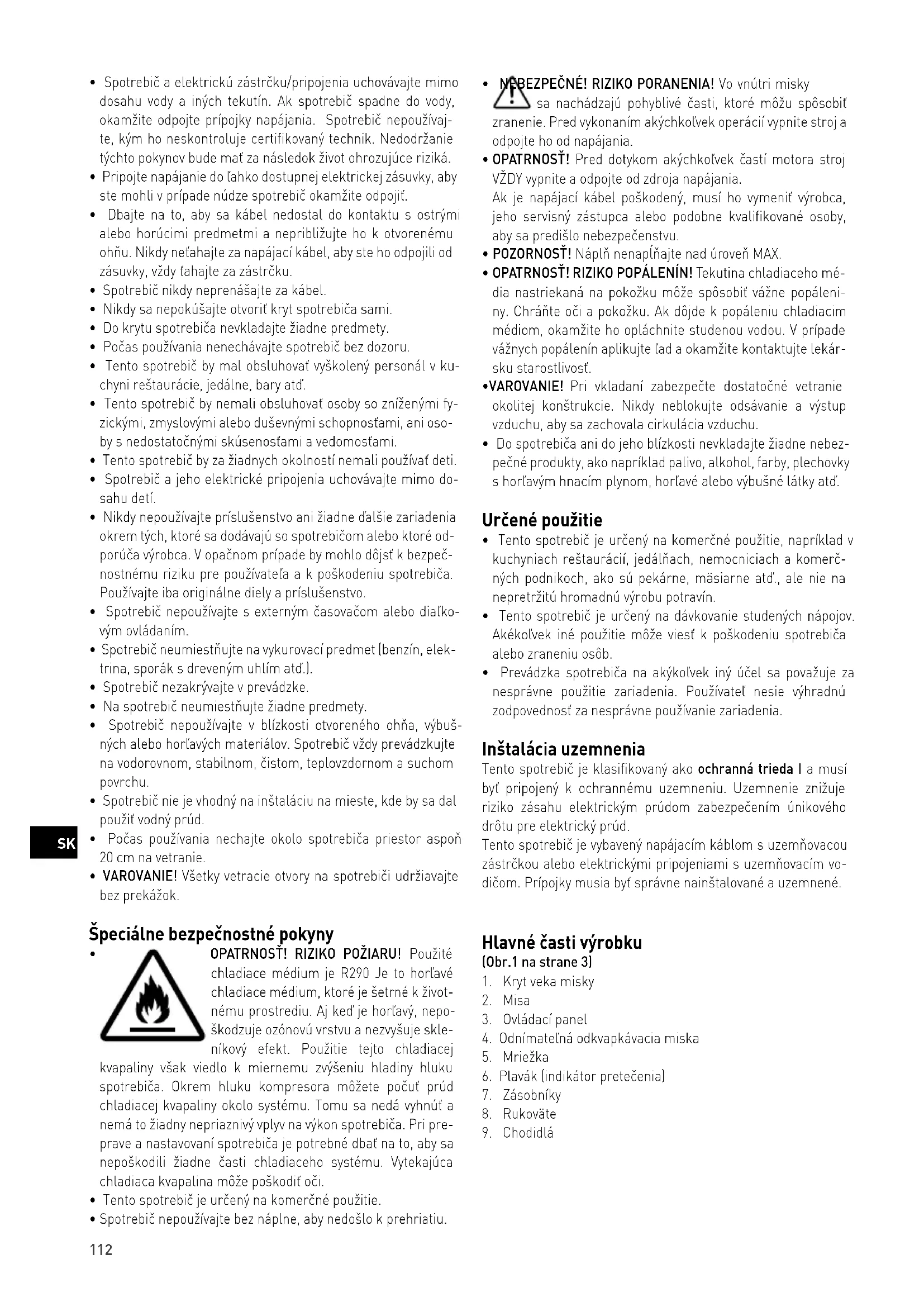 - OPATRNOSŤ! RIZIKO POŽIARU! Použité chladiace médium je R290 Je to horľavé chladiace médium, ktoré je šetrné k život- nému prostrediu. Aj keď je horľavý, nepo- škodzuje ozónovú vrstvu a nezvyšuje skle- níkový efekt. Použitie tejto chladiacej kvapaliny však viedlo k miernemu zvýšeniu hladiny hluku spotrebiča. Okrem hluku kompresora môžete počuť prúd chladiacej kvapaliny okolo systému. Tomu sa nedá vyhnúť a nemá to žiadny nepriaznivý vplyv na výkon spotrebiča. Pri pre- prave a nastavovaní spotrebiča je potrebné dbať na to, aby sa nepoškodili žiadne časti chladiaceho systému. Vytekajúca chladiaca kvapalina môže poškodiť oči.