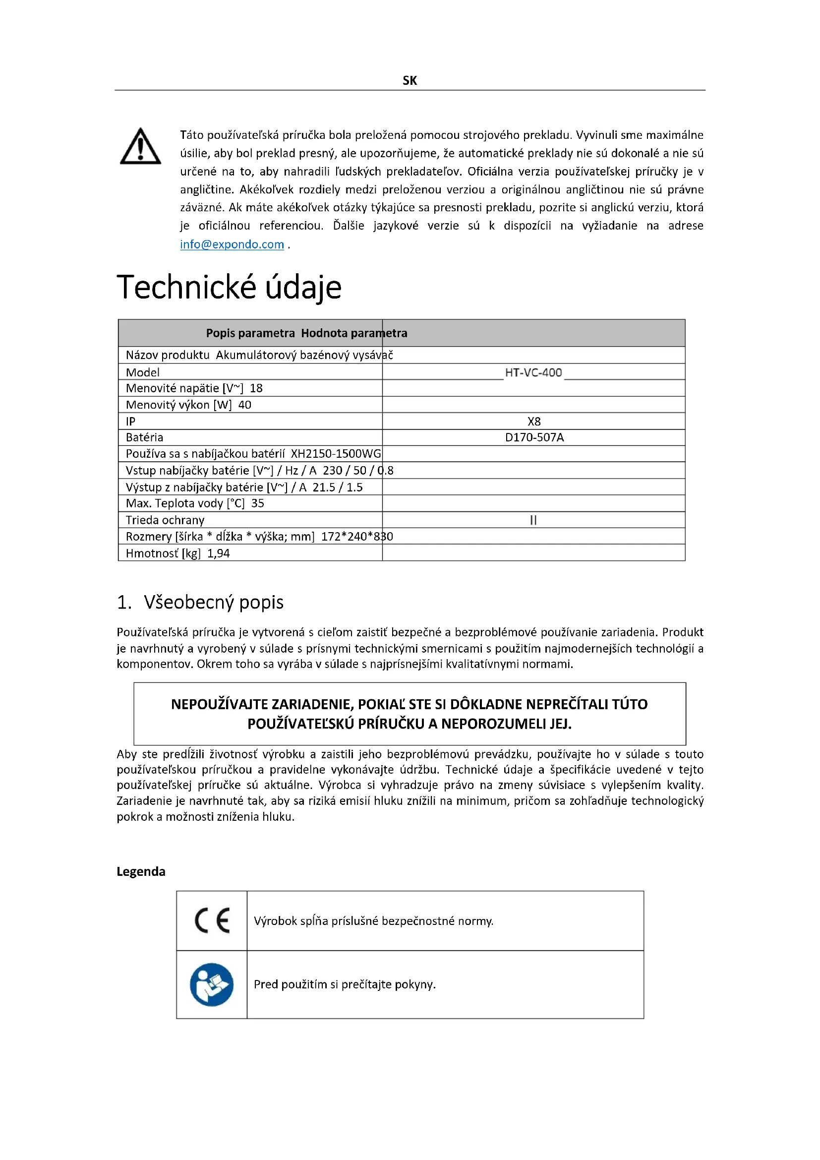 Používateľská príručka je vytvorená s cieľom zaistiť bezpečné a bezproblémové používanie zariadenia. Produkt je navrhnutý a vyrobený v súlade s prísnymi technickými smernicami s použitím najmodernejších technológií a komponentov. Okrem toho sa vyrába v súlade s najprísnejšími kvalitatívnymi normami. NEPOUŽÍVAJTE ZARIADENIE, POKIAĽ STE SI DÔKLADNE NEPREČÍTALI TÚTO POUŽÍVATEĽSKÚ PRÍRUČKU A NEPOROZUMELI JEJ. Aby ste predĺžili životnosť výrobku a zaistili jeho bezproblémovú prevádzku, používajte ho v súlade s touto používateľskou príručkou a pravidelne vykonávajte údržbu. Technické údaje a špecifikácie uvedené v tejto používateľskej príručke sú aktuálne. Výrobca si vyhradzuje právo na zmeny súvisiace s vylepšením kvality. Zariadenie je navrhnuté tak, aby sa riziká emisií hluku znížili na minimum, pričom sa zohľadňuje technologický pokrok a možnosti zníženia hluku. Legenda Výrobok spĺňa príslušné bezpečnostné normy. Pred použitím si prečítajte pokyny.SK Výrobok sa musí recyklovať. VAROVANIE! alebo POZOR! alebo UPOZORNENIE! Platí pre danú situáciu. (všeobecné výstražné znamenie) POZOR! Nebezpečenstvo úrazu elektrickým prúdom! POZOR! Prečítajte si všetky bezpečnostné upozornenia a všetky pokyny. Nedodržanie upozornení a pokynov môže mať za následok úraz elektrickým prúdom, požiar a/alebo vážne zranenie alebo dokonca smrť. Pojmy "zariadenie" alebo "produkt" sa vo varovaniach a pokynoch používajú na označenie: Akumulátorový bazénový vysávač 1.1. Elektrická bezpečnosť a) Zástrčka musí pasovať do zásuvky. Zástrčku nijako neupravujte. Používanie originálnych zástrčiek a kompatibilných zásuviek znižuje riziko úrazu elektrickým prúdom. b) Nedotýkajte sa uzemnených prvkov, ako sú potrubia, ohrievače, bojlery a chladničky. Ak je uzemnené zariadenie vystavené dažďu, priamemu kontaktu s mokrým povrchom alebo ak je prevádzkované vo vlhkom prostredí, existuje zvýšené riziko úrazu elektrickým prúdom. Vniknutie vody do zariadenia zvyšuje riziko jeho poškodenia a úrazu elektrickým prúdom. c) Keď je zariadenie pripojené k nabíjačke, nedotýkajte sa ho mokrými alebo vlhkými rukami. d) Kábel používajte len na určené účely. Nikdy ho nepoužívajte na prenášanie zariadenia ani na vytiahnutie zástrčky zo zásuvky. Kábel uchovávajte mimo zdrojov tepla, oleja, ostrých hrán alebo pohyblivých častí. Poškodené alebo zamotané káble zvyšujú riziko úrazu elektrickým prúdom. e) Ak je napájací kábel alebo adaptér poškodený alebo vykazuje známky opotrebovania, prestaňte ho používať. Poškodený napájací zdroj je potrebné vymeniť. Poškodený napájací kábel by mal vymeniť kvalifikovaný elektrikár alebo servisné stredisko výrobcu. f) Výrobok nepoužívajte, keď sú vo vode ľudia. g) Pri nabíjaní dbajte na to, aby bol spotrebič zapojený do zásuvky na mieste, kde nehrozí zaplavenie a ktoré je chránené pred vlhkosťou. h) Pred nabíjaním výrobok vypnite.