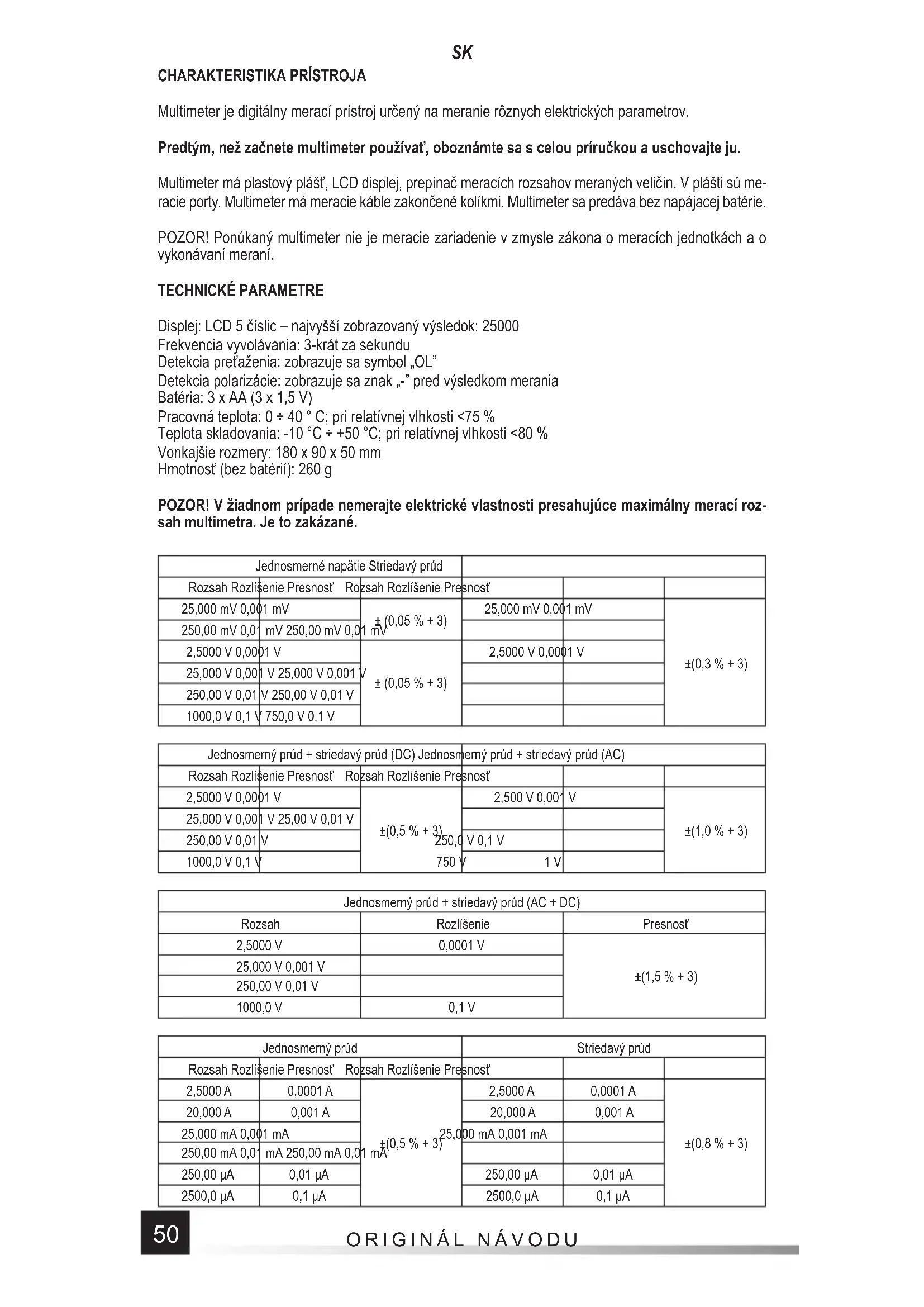 Multimeter je digitálny merací prístroj určený na meranie rôznych elektrických parametrov. Predtým, než začnete multimeter používať, oboznámte sa s celou príručkou a uschovajte ju. Multimeter má plastový plášť, LCD displej, prepínač meracích rozsahov meraných veličín. V plášti sú me- racie porty. Multimeter má meracie káble zakončené kolíkmi. Multimeter sa predáva bez napájacej batérie. POZOR! Ponúkaný multimeter nie je meracie zariadenie v zmysle zákona o meracích jednotkách a o vykonávaní meraní. TECHNICKÉ PARAMETRE Displej: LCD 5 číslic – najvyšší zobrazovaný výsledok: 25000 Frekvencia vyvolávania: 3-krát za sekundu Detekcia preťaženia: zobrazuje sa symbol „OL” Detekcia polarizácie: zobrazuje sa znak „-” pred výsledkom merania Batéria: 3 x AA (3 x 1,5 V) Pracovná teplota: 0 ÷ 40 ° C; pri relatívnej vlhkosti <75 % Teplota skladovania: -10 °C ÷ +50 °C; pri relatívnej vlhkosti <80 % Vonkajšie rozmery: 180 x 90 x 50 mm Hmotnosť (bez batérií): 260 g POZOR! V žiadnom prípade nemerajte elektrické vlastnosti presahujúce maximálny merací roz- sah multimetra. Je to zakázané. Jednosmerné napätie Striedavý prúd Rozsah Rozlíšenie Presnosť Rozsah Rozlíšenie Presnosť 25,000 mV 0,001 mV ± (0,05 % + 3) 25,000 mV 0,001 mV ±(0,3 % + 3) 250,00 mV 0,01 mV 250,00 mV 0,01 mV 2,5000 V 0,0001 V ± (0,05 % + 3) 2,5000 V 0,0001 V 25,000 V 0,001 V 25,000 V 0,001 V 250,00 V 0,01 V 250,00 V 0,01 V 1000,0 V 0,1 V 750,0 V 0,1 V Jednosmerný prúd + striedavý prúd (DC) Jednosmerný prúd + striedavý prúd (AC) Rozsah Rozlíšenie Presnosť Rozsah Rozlíšenie Presnosť 2,5000 V 0,0001 V ±(0,5 % + 3) 2,500 V 0,001 V ±(1,0 % + 3) 25,000 V 0,001 V 25,00 V 0,01 V 250,00 V 0,01 V 250,0 V 0,1 V 1000,0 V 0,1 V 750 V 1 V Jednosmerný prúd + striedavý prúd (AC + DC) Rozsah Rozlíšenie Presnosť 2,5000 V 0,0001 V ±(1,5 % + 3) 25,000 V 0,001 V 250,00 V 0,01 V 1000,0 V 0,1 V Jednosmerný prúd Striedavý prúd Rozsah Rozlíšenie Presnosť Rozsah Rozlíšenie Presnosť 2,5000 A 0,0001 A ±(0,5 % + 3) 2,5000 A 0,0001 A ±(0,8 % + 3) 20,000 A 0,001 A 20,000 A 0,001 A 25,000 mA 0,001 mA 25,000 mA 0,001 mA 250,00 mA 0,01 mA 250,00 mA 0,01 mA 250,00 μA 0,01 μA 250,00 μA 0,01 μA 2500,0 μA 0,1 μA 2500,0 μA 0,1 μAORIGINÁL NÁVODU